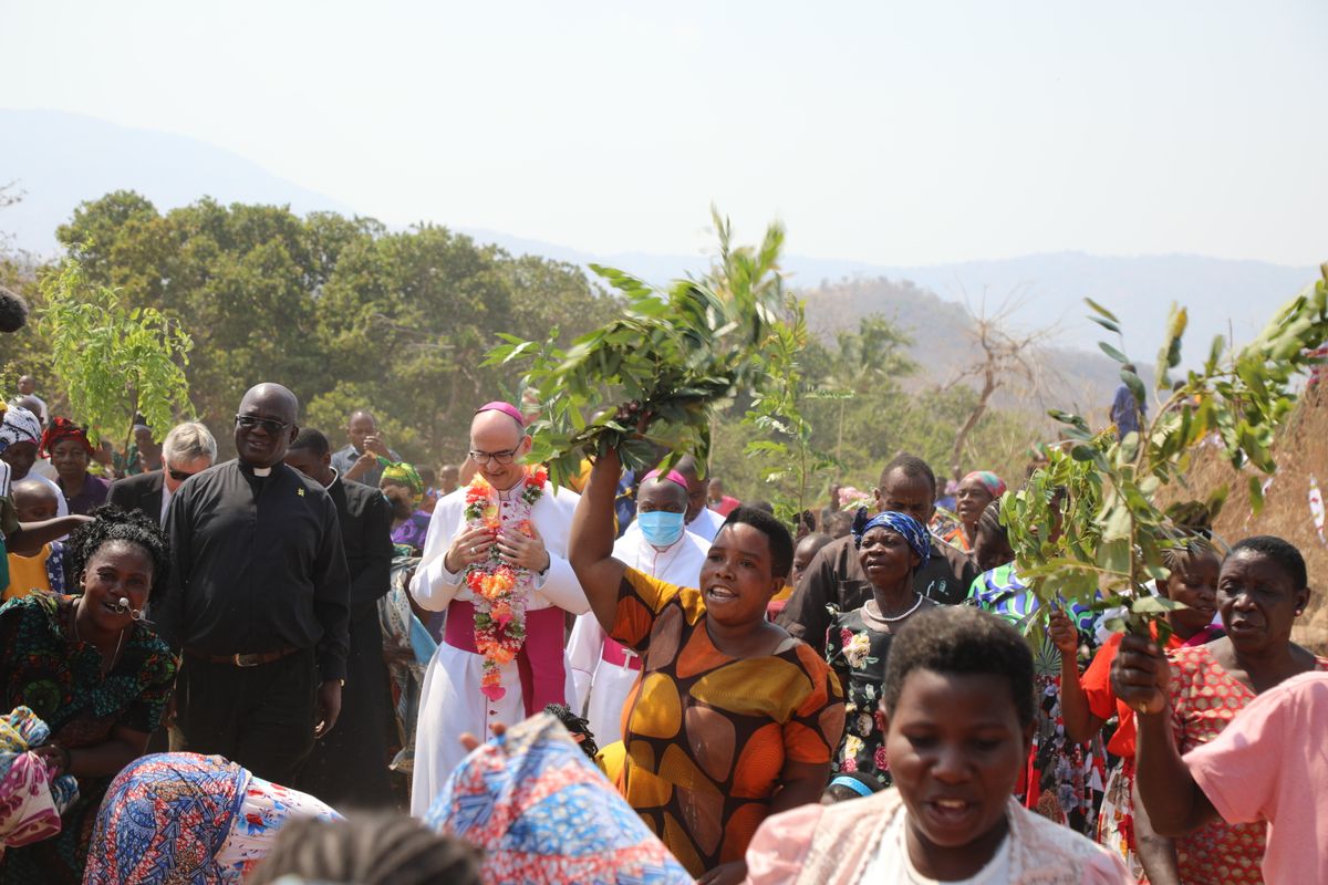 Nkile/Würzburg/Schonungen (POW) Der Einzug von Jesus nach Jerusalem ist eine der bekanntesten Szenen aus der Bibel. Die Menschen legten Kleider vor Jesus auf den Boden und schnitten Zweige von den Bäumen, um damit den Weg auszulegen. Genau diese Situation hat der Würzburger Bischof Dr. Franz Jung bei seiner Pastoralreise im Oktober in das afrikanische Partnerbistum Mbinga in Tansania erlebt. Die Gläubigen der Gemeinde Nkile erwarteten den Würzburger Bischof sehnsüchtig. Das zeigte sich auch beim Empfang, bei dem sie mit frisch geschnittenen grünen Zweigen zur Begrüßung winkten. Auf dem staubigen Boden lagen viele bunte Tücher, sogenannte Kangas, die auch als Kleidung getragen werden können.