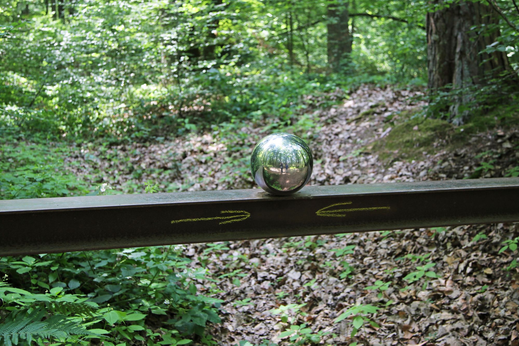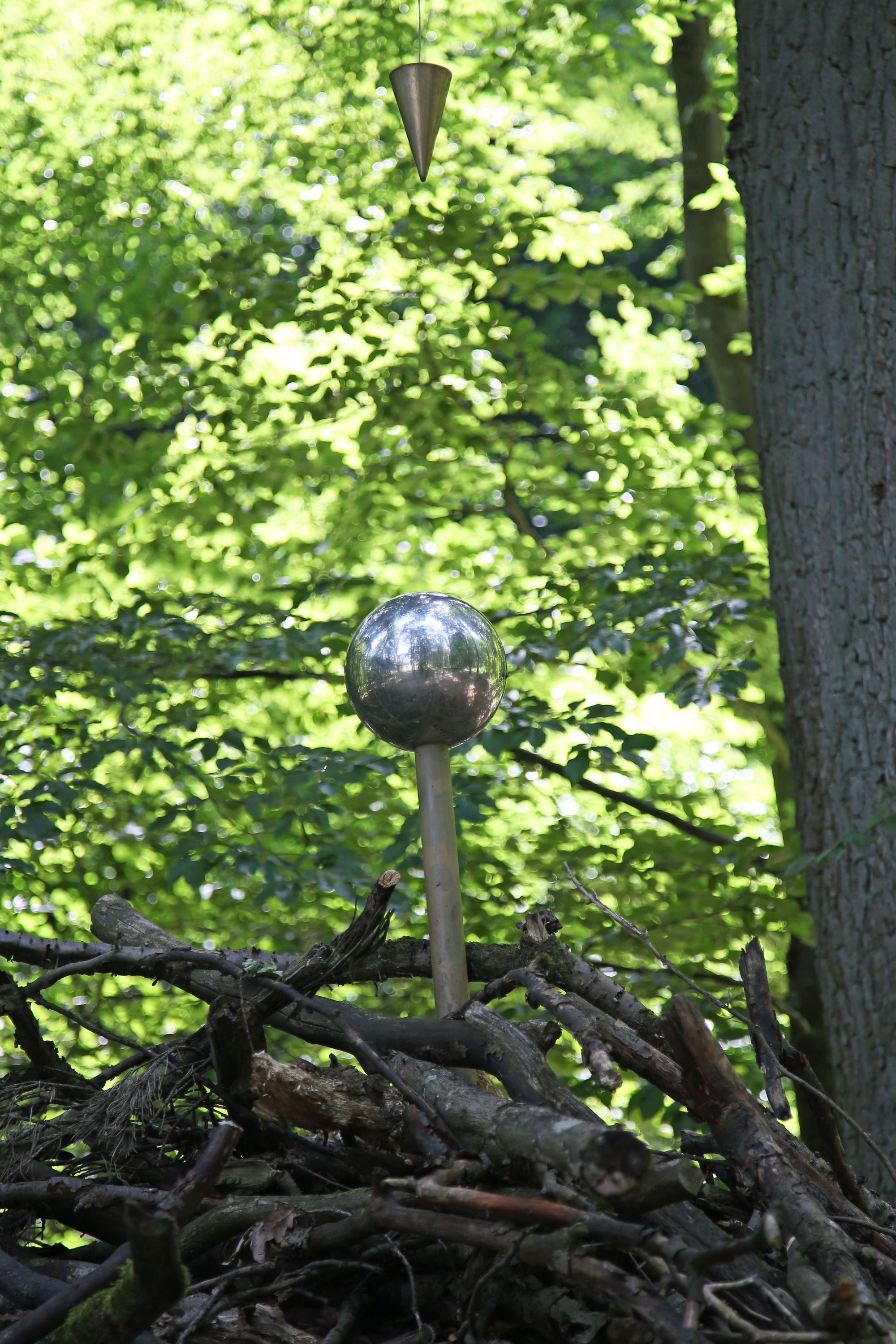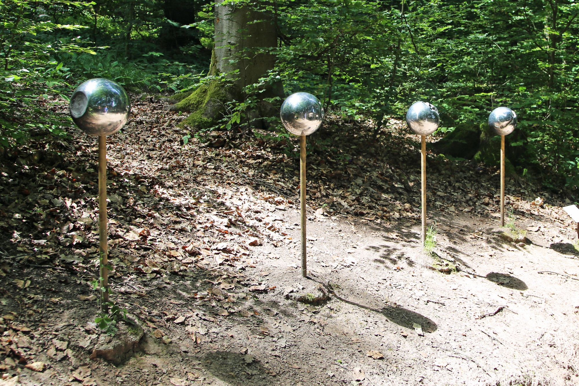 Wenn Summa mit einer Gruppe den „Weg der Besinnung“ geht, ermuntert sie die Teilnehmer gerne zur Interaktion mit den Kunstwerken. Die Skulptur „Geborgen“ etwa – ein riesiger Eichenstamm, der verkehrt herum im Boden steckt – ist groß genug, dass sich ein Mensch zwischen die Äste stellen kann, neben die kleine Kugel, die im Boden steckt. „Die Reaktionen sind sehr unterschiedlich. Manche fühlen sich darin geborgen, manche aber auch eingeengt.“ Zwischen den unterschiedlich hohen, dicken und dünnen Stäben, die bei „Wie weit noch“ in einer langen Reihe in den Wald hineinführen, würden Kinder gerne Slalom laufen. An der Station „Narben“ bleibt Summa ein wenig länger stehen. Vier scheinbar gleiche, glänzende Metallkugeln in einer Reihe – doch die eine hat einen Riss, die andere mehrere Dellen. „Das ist eine ganz tolle Station. Hier kommen die Lebensgeschichten mit ihren Verwundungen und Verletzungen.“
