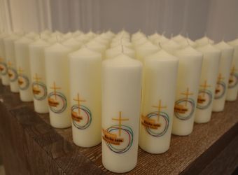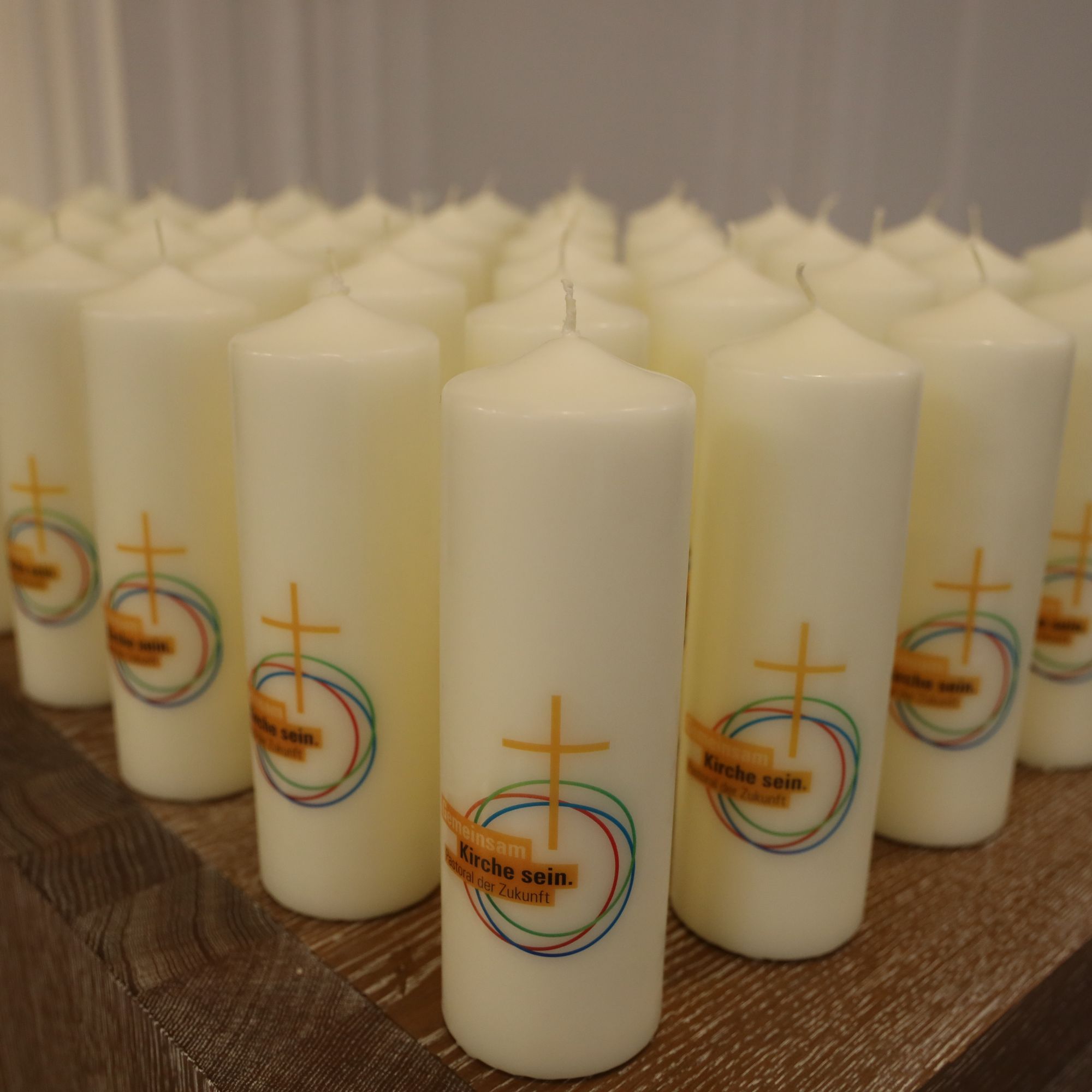Generalvikar Vorndran erläuterte vor der Übergabe an die Vertreter der Steuerungsgruppen das Motiv auf den Kerzen. Dieses zeigt ein Kreuz, umgeben von drei Kreisen. Diese stehen für die diözesanen Schwerpunkte „kontemplativ leben“, „sprachfähig werden im Glauben“ und „solidarisch handeln“.
