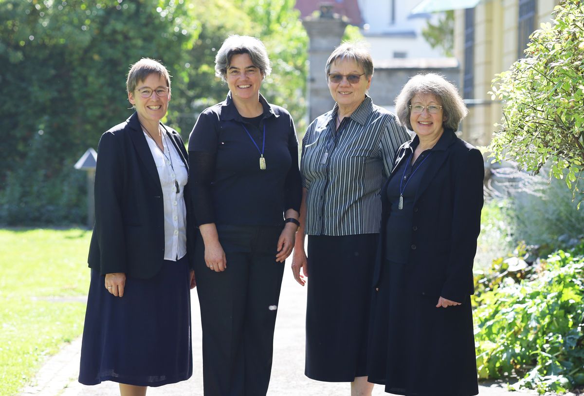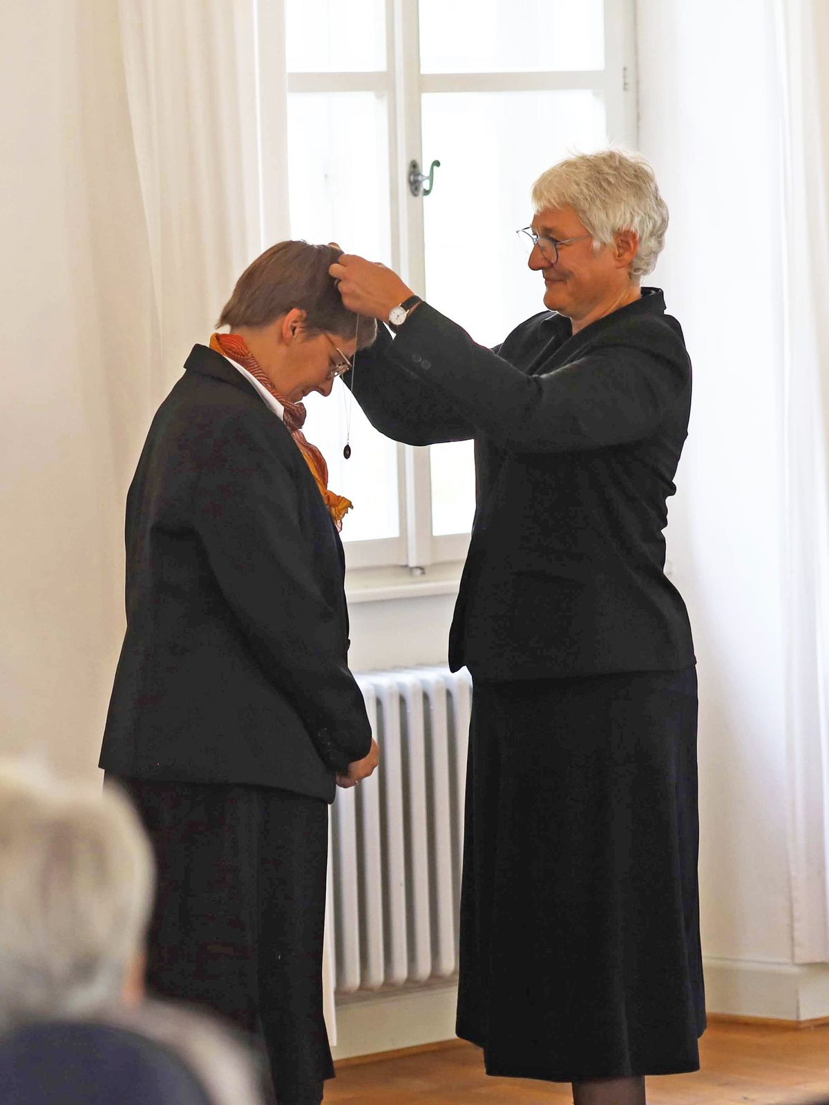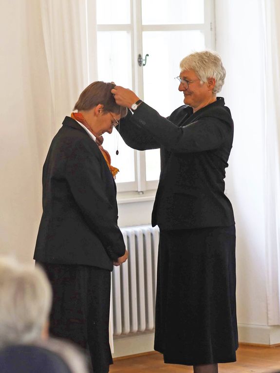 Mit Bibel und Lebensordnung übergab Ganz an Seelmann die geistliche Leitung der Gemeinschaft, mit Siegel und Gründerinnenmedaille die rechtliche und organisatorische Verantwortung. Für das neue Team hatte sie ein Windspiel mitgebracht – als Symbol für unterschiedliche Stimmen, die gemeinsam eine Melodie ergeben, getragen vom Wehen des Heiligen Geistes. Gemeinsam mit allen Anwesenden ließ sie diese Melodie erklingen, indem sie zu einem Klangteppich aus Summtönen einlud und dem neuen Leitungsteam dieses tragende Gefühl schenkte. Zum Schluss dankte Ganz ihren Mitschwestern, den Mitarbeitenden und Wegbegleitern und verband das mit der Bitte um Verzeihung an „alle, denen ich in meiner Amtszeit weh getan habe, wo ich nicht die richtigen Worte fand oder mich geirrt habe“.