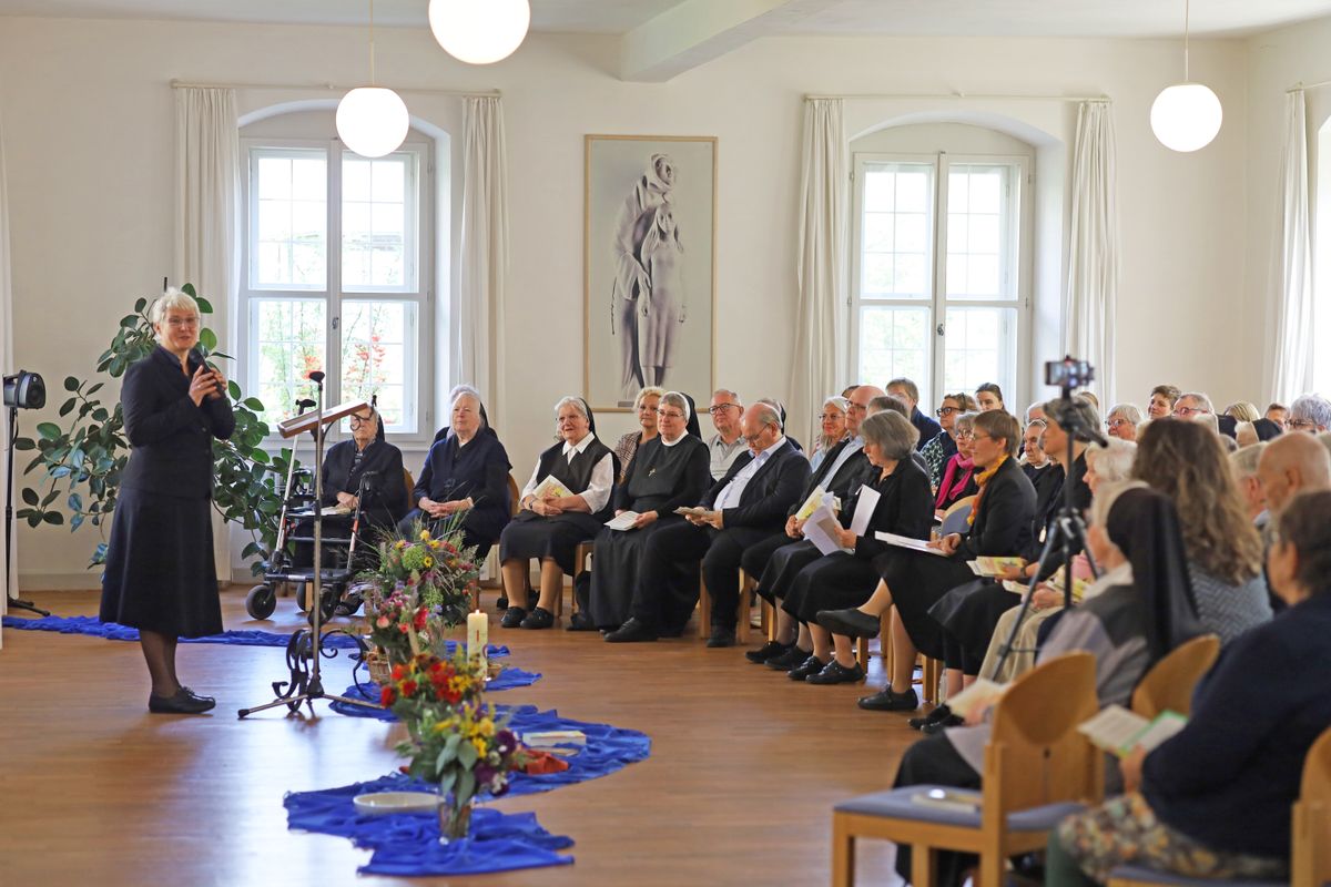 Erstmals wurde die Amtsübergabe nicht nur im Kreis der Schwestern, sondern in einem größeren Rahmen mit Mitarbeitenden, Weggefährtinnen und Weggefährten, Familienangehörigen sowie Vertreterinnen und Vertretern des Bistums Würzburg gefeiert. Ganz erzählte in ihrer Begrüßung, wie sie sich in den vergangenen Monaten immer wieder an Flüssen aufgehalten und in verschiedenen Fähren geübt habe, „das eine Ufer loszulassen, sich dem Wasser anzuvertrauen und darauf zu vertrauen, dass es drüben weitergeht“.