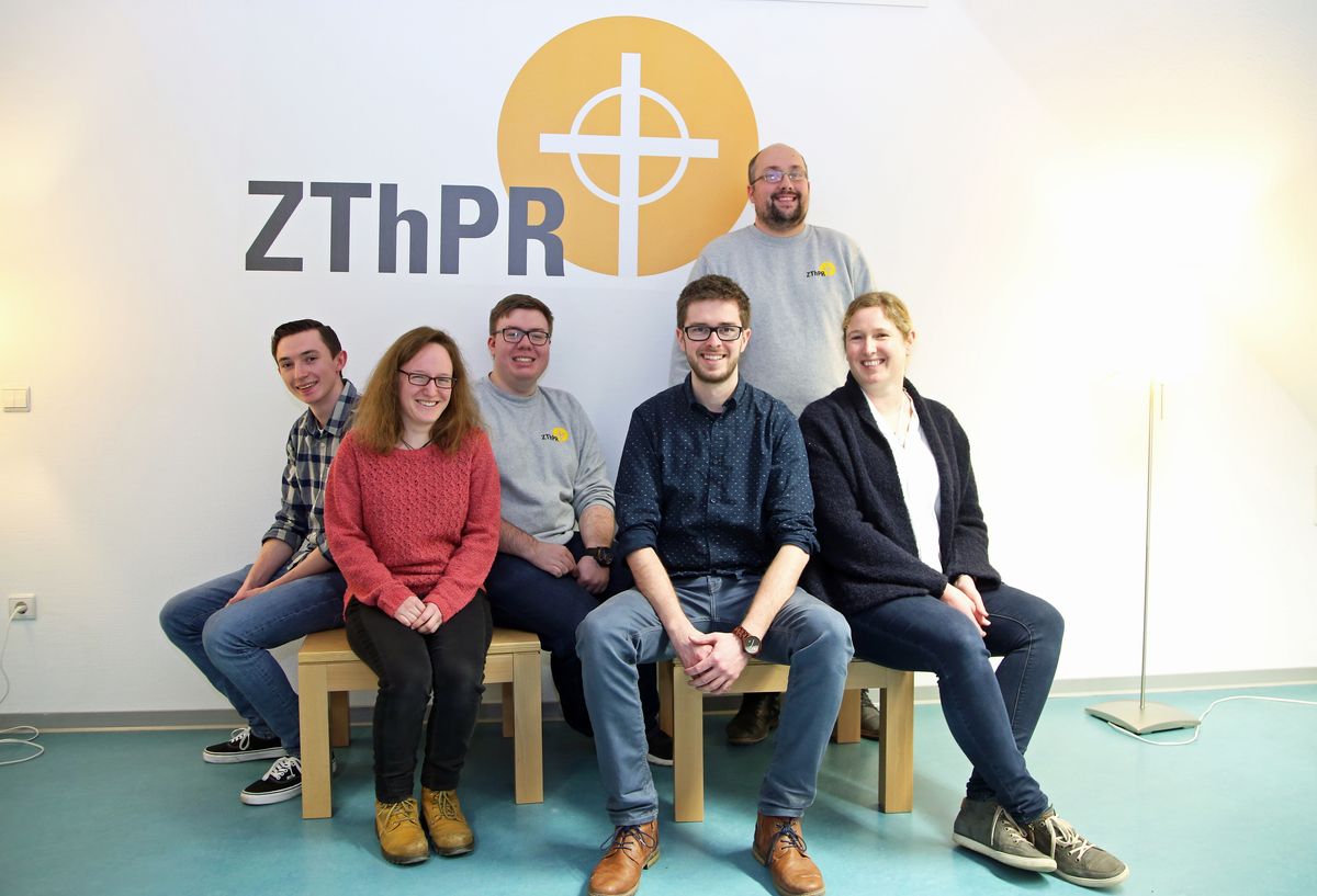 Lea Brenner, Gabriel Abb, Benjamin Hauck, Christoph Schuhmann und Fabian Waldherr klebten das 170 auf 90 Zentimeter große Wandtattoo gemeinsam mit Pastoralreferentin Andrea Schoknecht, Ausbildungsleiterin für die erste Bildungsphase, auf. Es zeigt ein Kreuz in einem gelben Kreis, links davon ist der Schriftzug „ZThPR“ zu lesen. Die Idee eines eigenen Logos sei bereits vor mehreren Jahren entstanden, erklärt Schoknecht. Im Wintersemester 2017/2018 habe eine Arbeitsgruppe dann dieses Logo entworfen, das von Sven Jäger vom Medienhaus der Diözese Würzburg umgesetzt wurde. Der Kreis in der Bistumsfarbe Gelb stehe für „etwas Zentrales“, erklärt Abb. Ein Zentrum bringe Menschen und Erfahrungen zusammen. Das an ein Keltenkreuz angelehnte Kreuz soll an den Bistumspatron, den heiligen Kilian, erinnern. Es sei zudem nach unten offen als Symbol für die Offenheit nach außen. „Und mit der Abkürzung ZThPR ist man gleich bei unserem Internetauftritt“, sagt Abb. Es gibt bereits T-Shirts und Sweatshirts mit dem neuen Logo. In Planung sind zudem ein Roll-up sowie eigene Flyer, um Werbung für die Einrichtung zu machen. Auch auf Kugelschreibern und Stickern kann sich das Team das Logo gut vorstellen. Informationen zum ZThPR gibt es im Internet unter www.zthpr.bistum-wuerzburg.de.