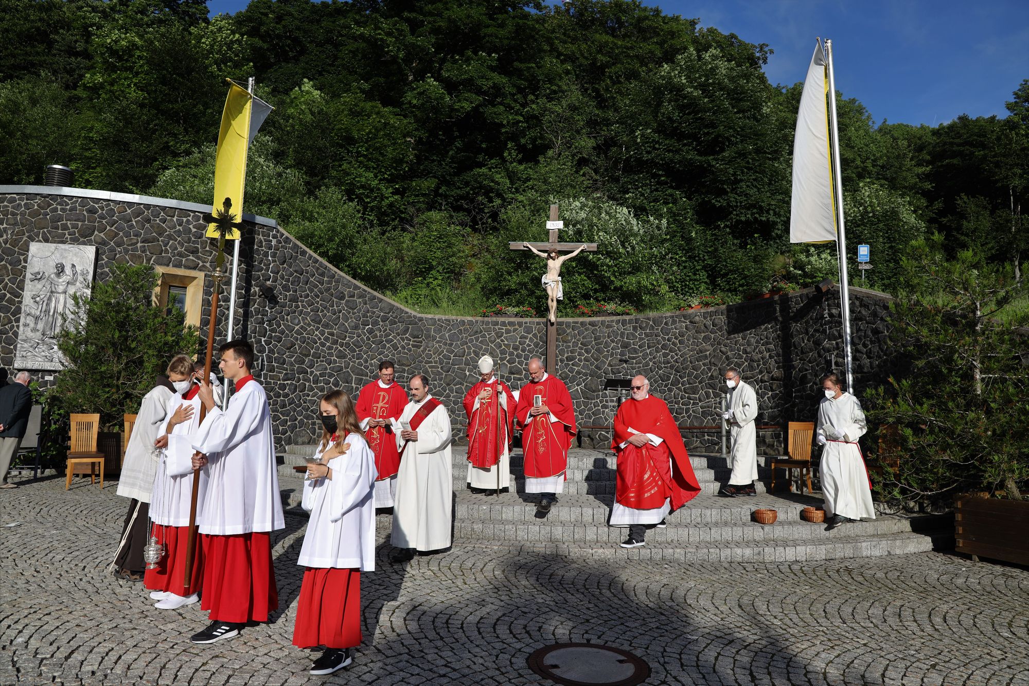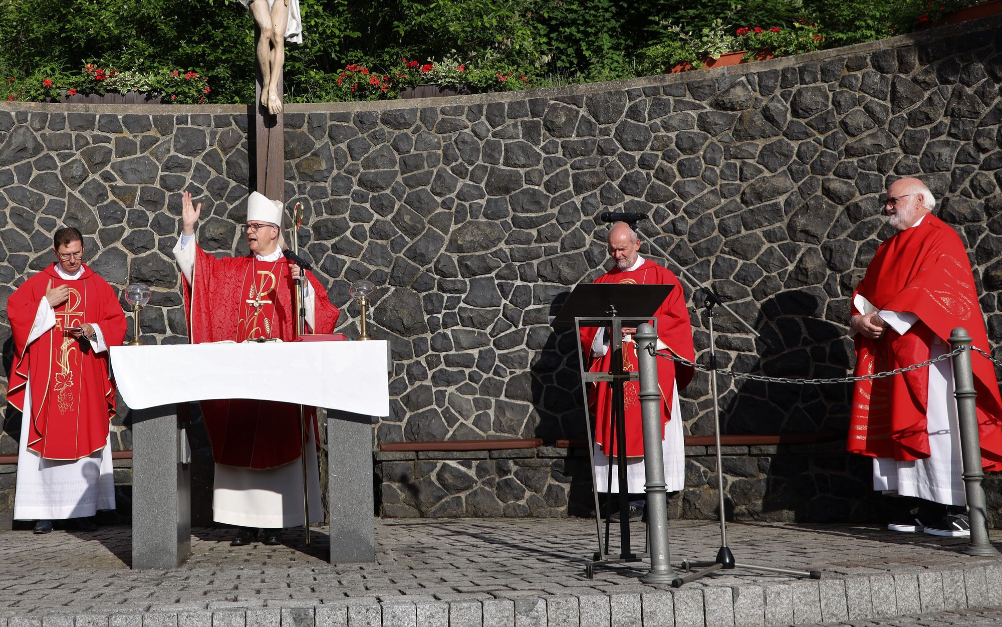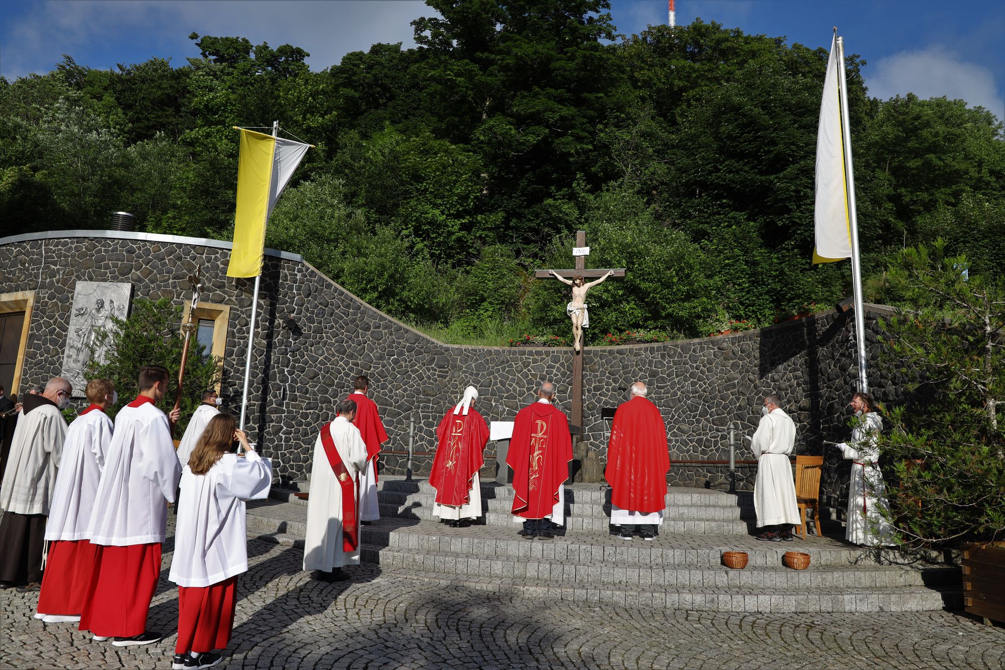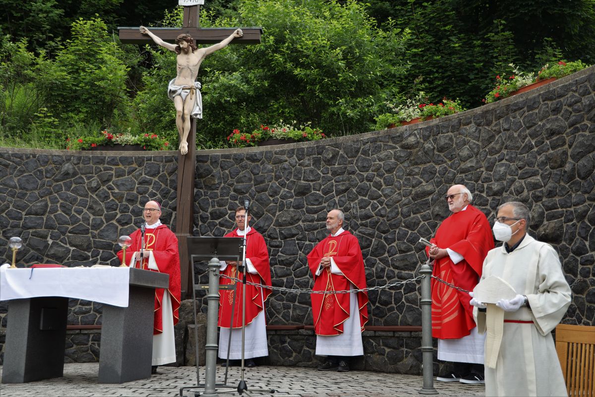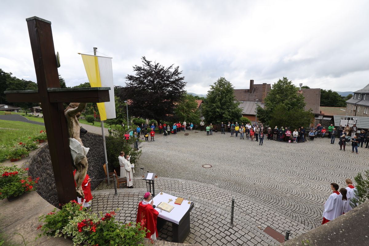Kloster Kreuzberg (POW) Die Haltung der Barmherzigkeit hat Bischof Dr. Franz Jung am Montagabend, 5. Juli, beim Kiliani-Pontifikalgottesdienst auf dem Kreuzberg, als unverzichtbar bezeichnet: „Nur wer fühlt, was er sieht, tut, was er kann.“ Mit rund 110 Gläubigen feierte der Bischof auf dem Platz vor der Wallfahrtskirche auf dem Kreuzberg (Landkreis Rhön-Grabfeld) die erste regionale Messe der coronabedingt auch in diesem Jahr modifizierten Wallfahrtswoche. „Wenn es nicht möglich ist, dass die Menschen zu Kiliani nach Würzburg kommen, kommt Kiliani zu den Menschen“, sagte er. Es sei schön, sich Jahr für Jahr auf die Glaubenswurzeln zu besinnen. Eingeladen waren zu dem Gottesdienst insbesondere Politiker und Mitglieder kirchlicher Räte. Mit dem Bischof standen die Dekane der drei angrenzenden Dekanate am Freialtar, Armin Haas (Dekanat Hammelburg), Stephan Hartmann (Dekanat Bad Kissingen) und Dr. Andreas Krefft (Dekanat Rhön-Grabfeld). Sie und alle Gläubigen begrüßte Franziskanerpater Korbinian Klinger, Guardian des Klosters auf dem Kreuzberg, zu Beginn der Feier. Auch die äußeren Bedingungen passten: War der Heilige Berg der Franken anfangs wolkenverhangen, so gab es zum Schlusssegen Sonnenschein und blauen Himmel.