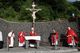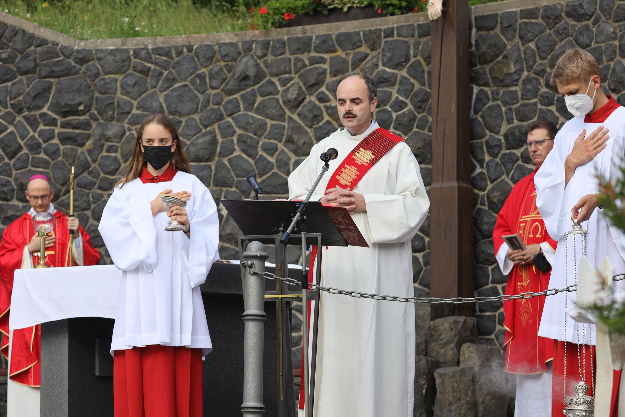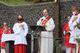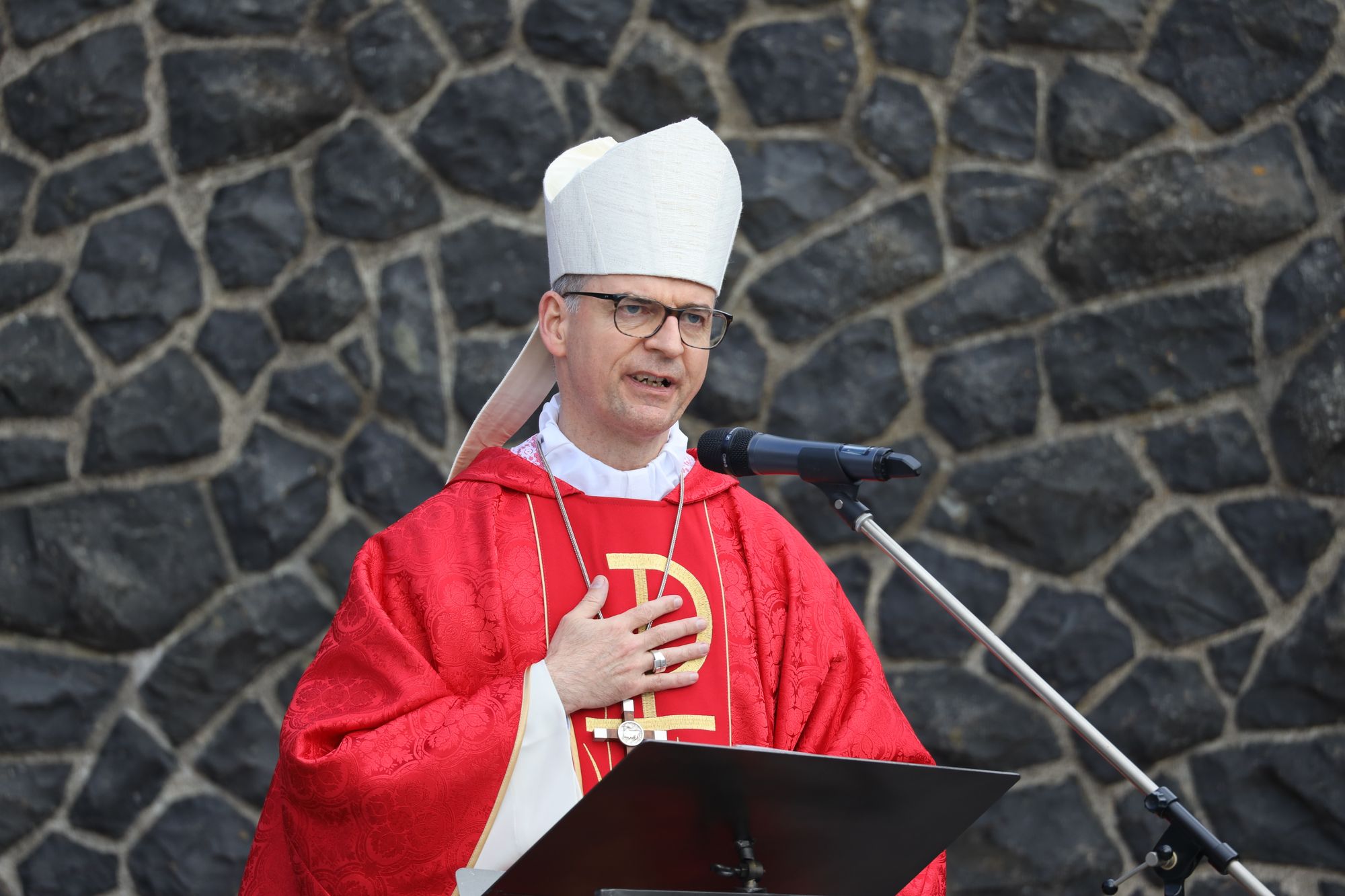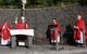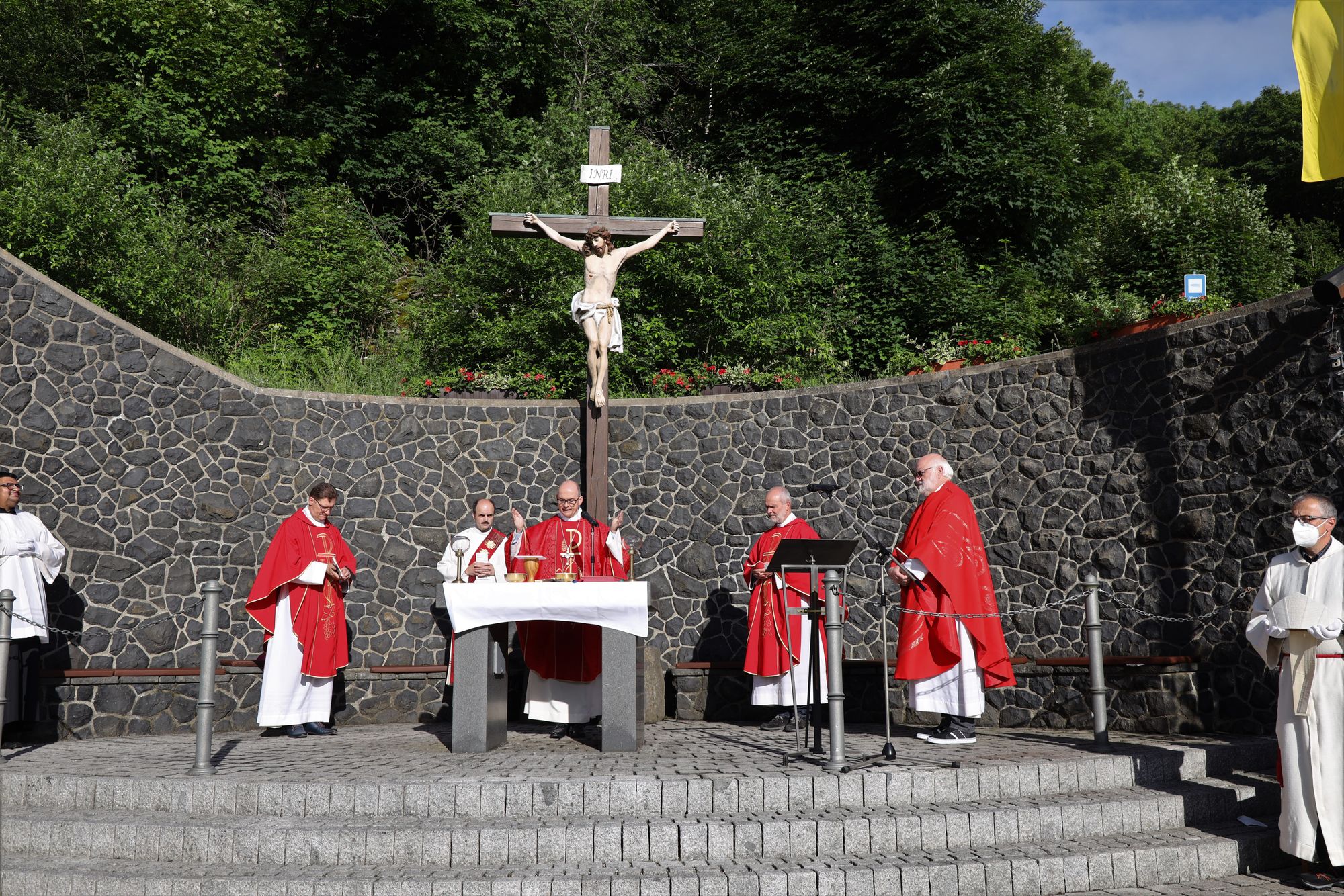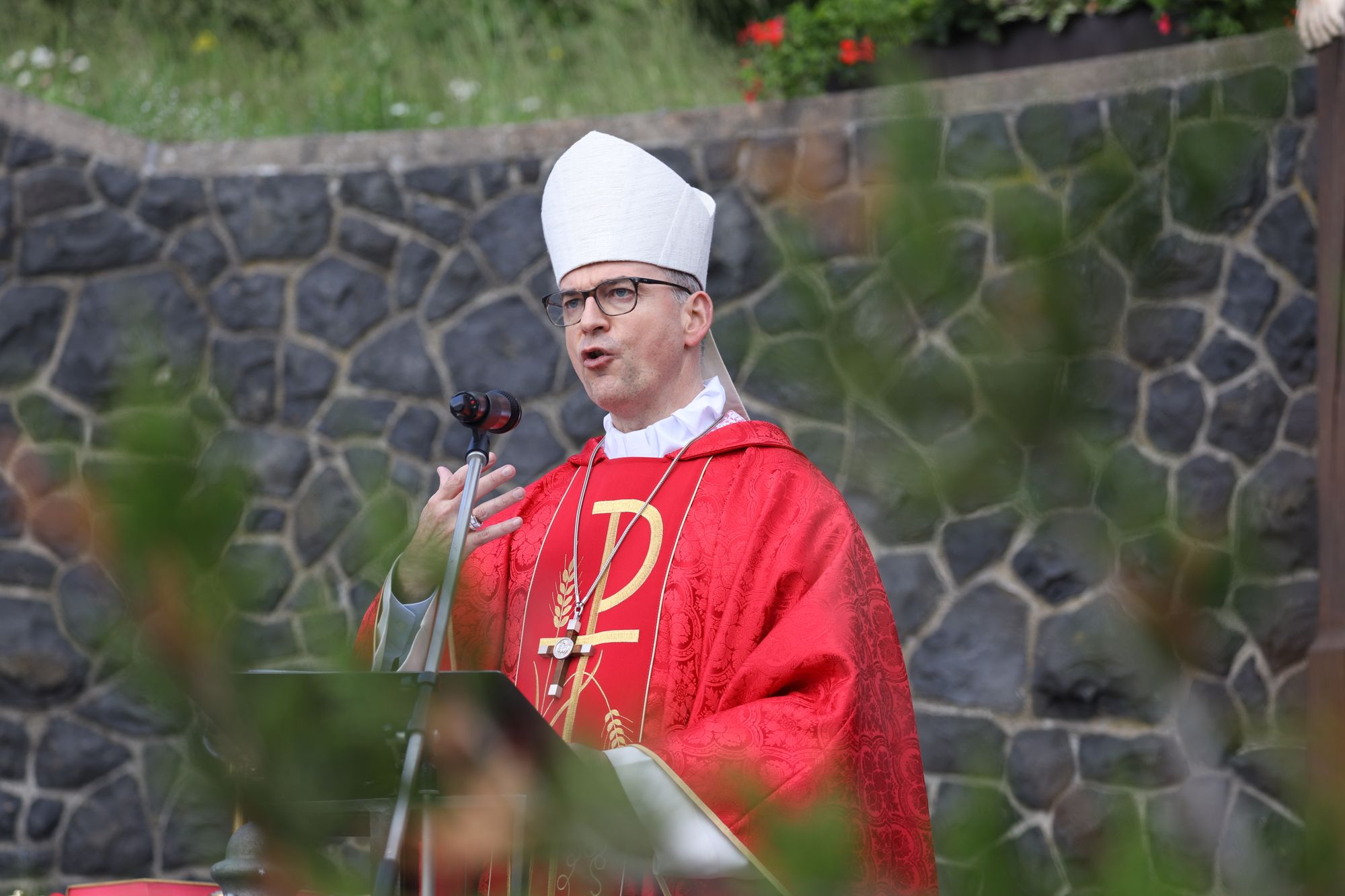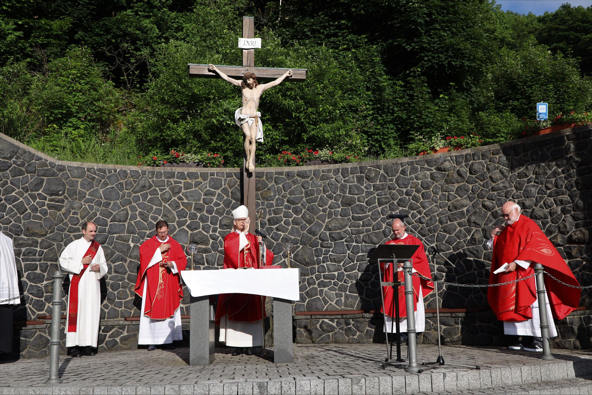 Kloster Kreuzberg (POW) Die Haltung der Barmherzigkeit hat Bischof Dr. Franz Jung am Montagabend, 5. Juli, beim Kiliani-Pontifikalgottesdienst auf dem Kreuzberg, als unverzichtbar bezeichnet: „Nur wer fühlt, was er sieht, tut, was er kann.“ Mit rund 110 Gläubigen feierte der Bischof auf dem Platz vor der Wallfahrtskirche auf dem Kreuzberg (Landkreis Rhön-Grabfeld) die erste regionale Messe der coronabedingt auch in diesem Jahr modifizierten Wallfahrtswoche. „Wenn es nicht möglich ist, dass die Menschen zu Kiliani nach Würzburg kommen, kommt Kiliani zu den Menschen“, sagte er. Es sei schön, sich Jahr für Jahr auf die Glaubenswurzeln zu besinnen. Eingeladen waren zu dem Gottesdienst insbesondere Politiker und Mitglieder kirchlicher Räte. Mit dem Bischof standen die Dekane der drei angrenzenden Dekanate am Freialtar, Armin Haas (Dekanat Hammelburg), Stephan Hartmann (Dekanat Bad Kissingen) und Dr. Andreas Krefft (Dekanat Rhön-Grabfeld). Sie und alle Gläubigen begrüßte Franziskanerpater Korbinian Klinger, Guardian des Klosters auf dem Kreuzberg, zu Beginn der Feier. Auch die äußeren Bedingungen passten: War der Heilige Berg der Franken anfangs wolkenverhangen, so gab es zum Schlusssegen Sonnenschein und blauen Himmel.
