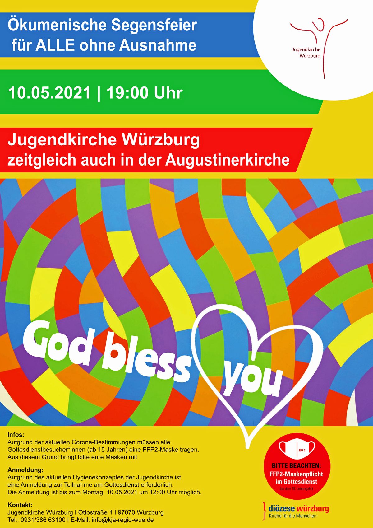 Zeitgleich wird ein Segensgottesdienst in der Würzburger Augustinerkirche gefeiert. Die bundesweite Aktion #liebegewinnt ruft für diesen Tag zur Feier von Gottesdiensten auf, in denen Menschen ausnahmslos den Segen empfangen, um den sie bitten, schreibt die kja. „Wir laden alle ein, den Segen Gottes zu feiern und sich schenken zu lassen, den Gott uns aus Liebe geben will.“ Vor einigen Wochen habe der Vatikan ein Schreiben herausgebracht, in dem festgestellt werde, dass die Kirche keine Berechtigung habe, homosexuelle Beziehungen zu segnen. Für viele sei es unverständlich, dass Liebe, „auch wenn sie uns in vielfältiger Form begegnet“, nicht gesegnet werden könne. „Mit einem Segensgottesdienst für alle ohne Ausnahme bekennen wir uns zu dieser Vielfalt der Lebensentwürfe und Lebensgeschichten“, schreibt die kja. Das Tragen einer FFP2-Maske ist für alle Teilnehmer ab 15 Jahren vorgeschrieben. Aufgrund des aktuellen Hygienekonzeptes der Jugendkirche ist eine Anmeldung bis Montag, 10. Mai, 12 Uhr unter Telefon 0931/38663100 oder per E-Mail an info@kja-regio-wue.de erforderlich. Weitere Informationen im Internet.