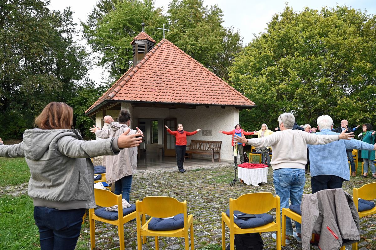 Um den eigenen Weg zu finden, können auch Körperübungen hilfreich sein. Die über 30 Gläubigen aus vielen Teilen des Bistums streckten sich einmal mit weit nach oben gereckten Armen nach Gott aus, ehe sie mit ihren Händen den Boden berührten oder sich weit machten, um am Ende mit einer Geste Richtung Herz zu sich selbst zu kommen.