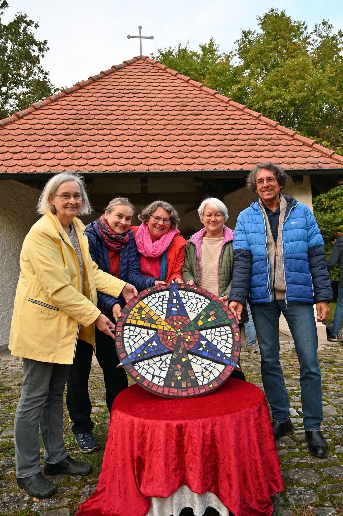 Als Orientierungshilfe wurde das neu gestaltete Meditationsrad vorgestellt, das vorher unter einem roten Tuch verborgen war. Der Rahmen ist nach dem Motiv von Bruder Klaus aus Holz gefertigt. Vor zwei Jahren wurden beim Bruder-Klaus-Gebet die ersten Glassteine hineingelegt. Barbara Düchs, stellvertretende Vorsitzende des KLB-Bildungswerks, hat das Rad fertiggestellt und kunstvoll mit vielen verschiedenfarbigen Glasscherben gestaltet. Scharl betonte, dass auch aus Brüchen und Stücken Neues und Wertvolles entstehen könne. Dann erläuterte er die vielfältigen Ideen, die sich hinter der Farbwahl der Glasstücke und den Symbolen des Meditationsrads verbergen.