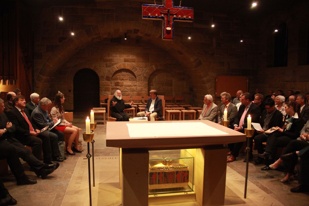 Münsterschwarzach (POW) Im Kreis von Weinhoheiten und Weinrepräsentanten, Vertretern der Winzergenossenschaften Nordheim am Main und Sommerach sowie Mitarbeitern der Abtei Münsterschwarzach hat Bestsellerautor Benediktinerpater Anselm Grün sein neues Buch zum Wein vorgestellt. „Der Wein – Geschenk des Himmels und der Erde“ lautet der Titel des mit stimmungsvollen und großformatigen Fotografien der Künstlerin Pia Vogel gestalteten Werks, dessen erste Auflage bereits nach wenigen Tagen vergriffen ist. Ungewöhnlich, doch passend zugleich war der Ort der Präsentation am Dienstagabend, 18. September: die Krypta der Abteikirche, dort, wo bei der Eucharistiefeier am Altar Wein zu Blut Christi verwandelt wird.