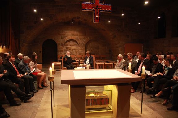 Ein weiterer Vorschlag: über den Wein den Feierabend in der Familie wieder zu entdecken und bei einem Glas Wein den Tag abzuschließen. „Beim Weintrinken lässt man den Tag nochmals Revue passieren, man schaut ihn im Licht Gottes nochmals an, um ihn dann loszulassen, in Gottes Hände zurückzugeben. Der Feierabend, an dem wir gemeinsam Wein trinken, weist aber auch schon auf den kommenden Tag hin, der ein Fest sein wird, weil Gott ihn mit uns leben wird.“ Letzteren Rat greifen die Gäste sofort auf: Nach der Buchvorstellung in der Krypta klingt der Abend bei den von den Winzergenossenschaften Divino Nordheim und Winzerkeller Sommerach neu kreierten Münsterschwarzacher Klosterweinen aus: bei einer 2011er Sommeracher Kösterei Cuvée weiß und einem 2011er Nordheimer Zehnthof Cuvée rot.
