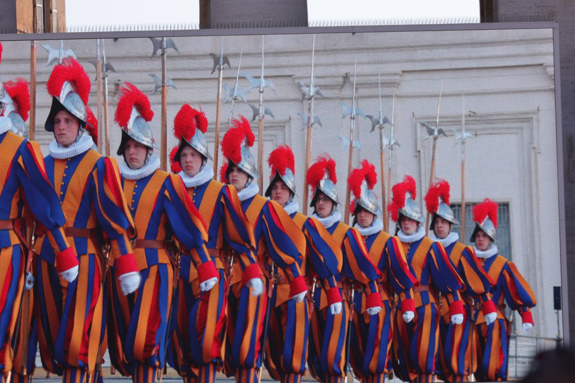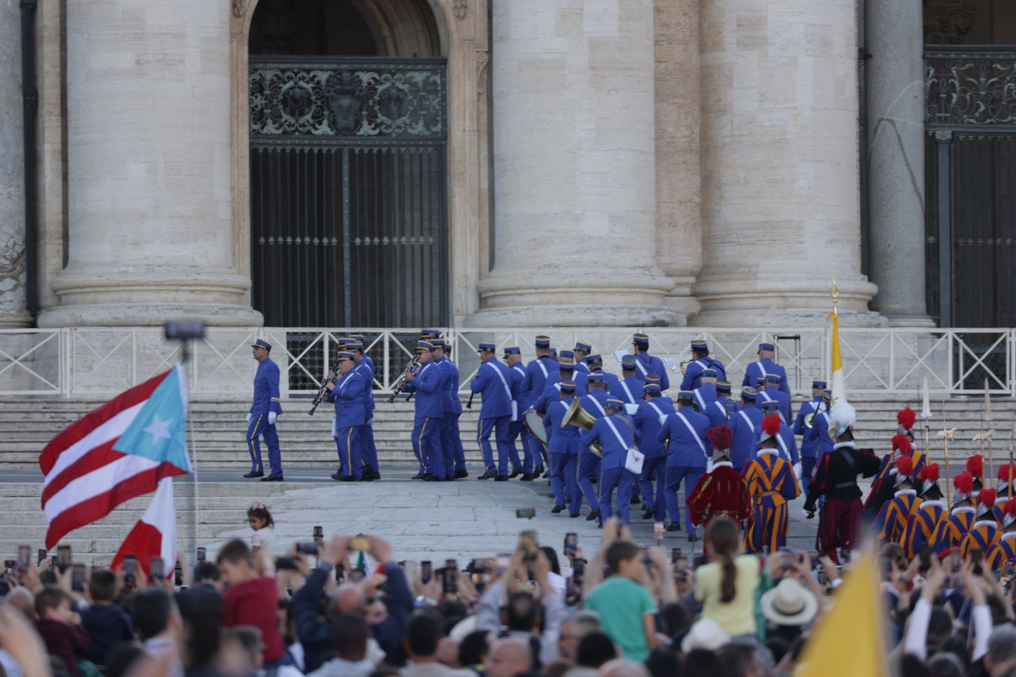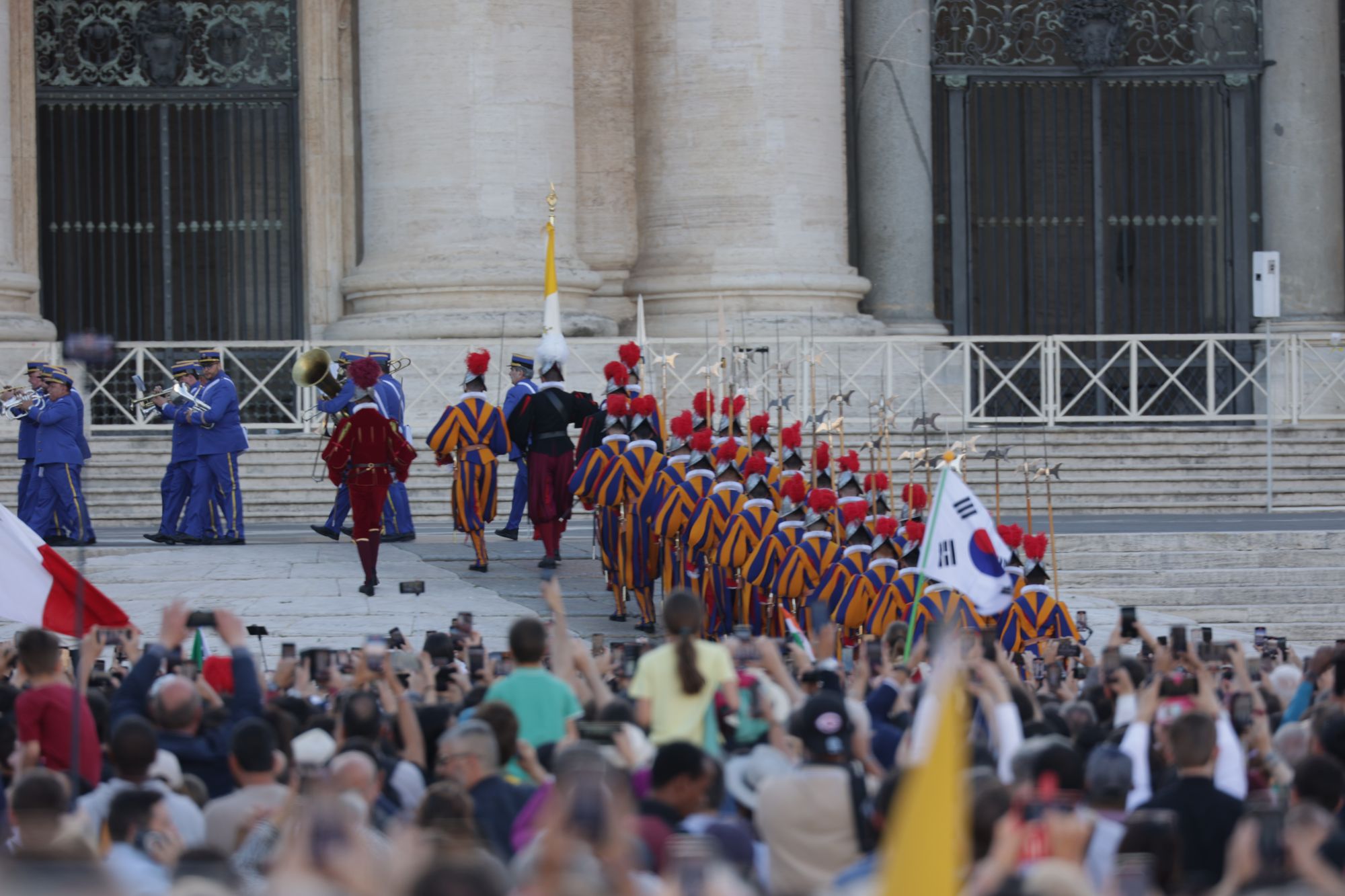 Mit dröhnenden Trommelschlägen marschieren uniformierte Blaskapellen von Militär und Polizei zusammen mit der Schweizer Garde, gekleidet in ihre bunten Festtagsuniformen und mit rotem Federschmuck an ihren Helmen, über den Platz und die Treppen hinauf zum erhöhten Vorplatz an der Fassade des Petersdoms.