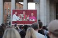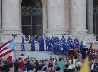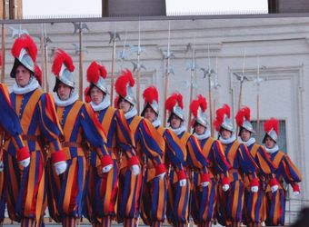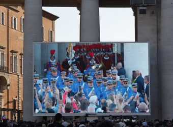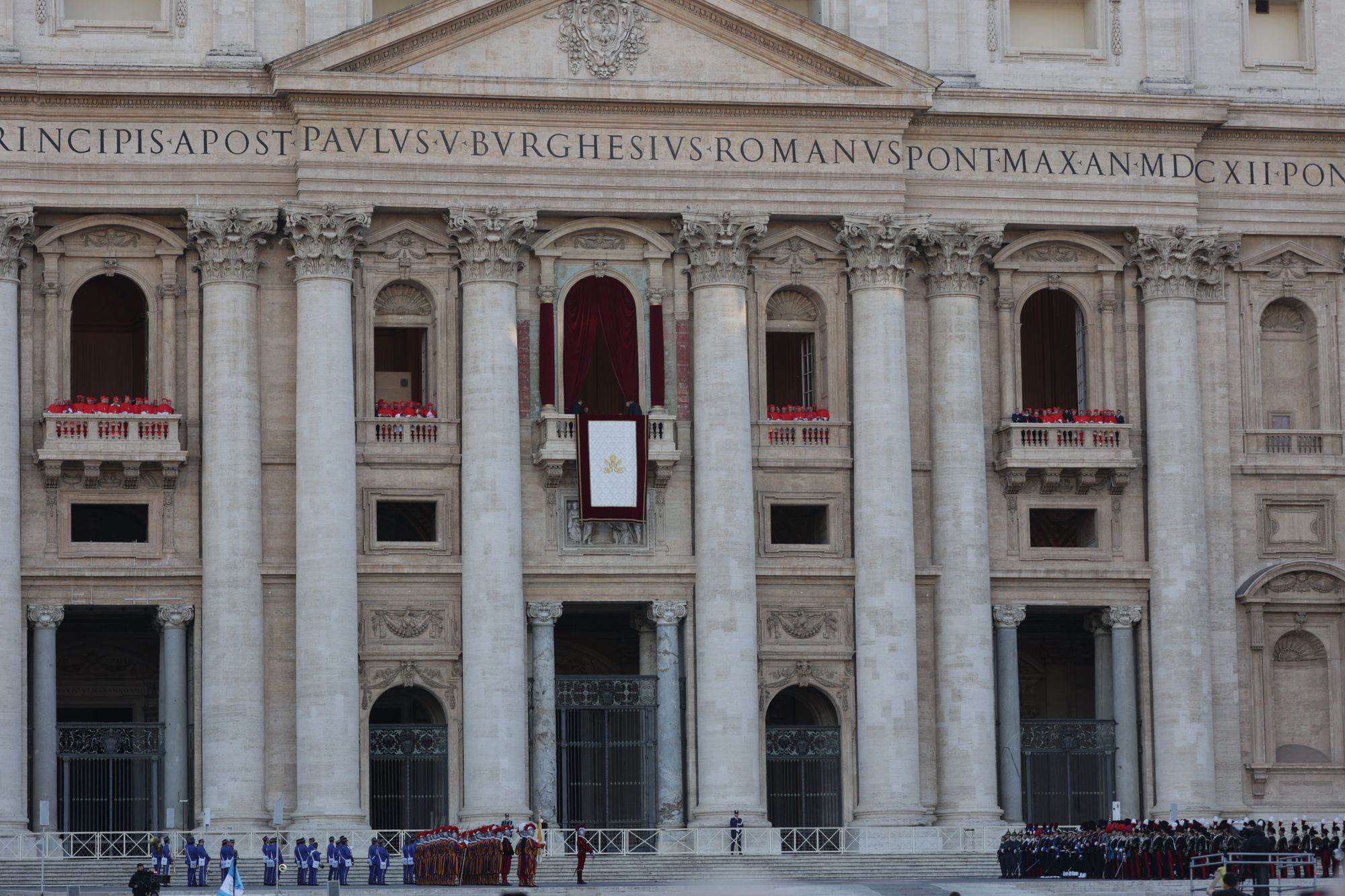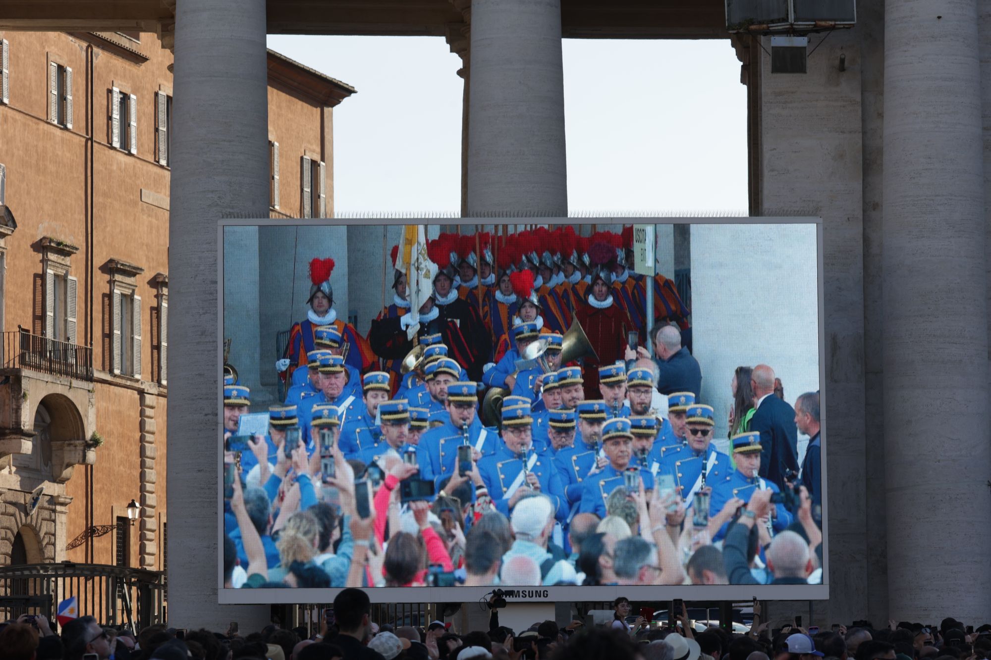 Mit dröhnenden Trommelschlägen marschieren uniformierte Blaskapellen von Militär und Polizei zusammen mit der Schweizer Garde, gekleidet in ihre bunten Festtagsuniformen und mit rotem Federschmuck an ihren Helmen, über den Platz und die Treppen hinauf zum erhöhten Vorplatz an der Fassade des Petersdoms.