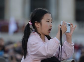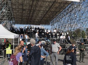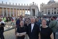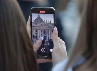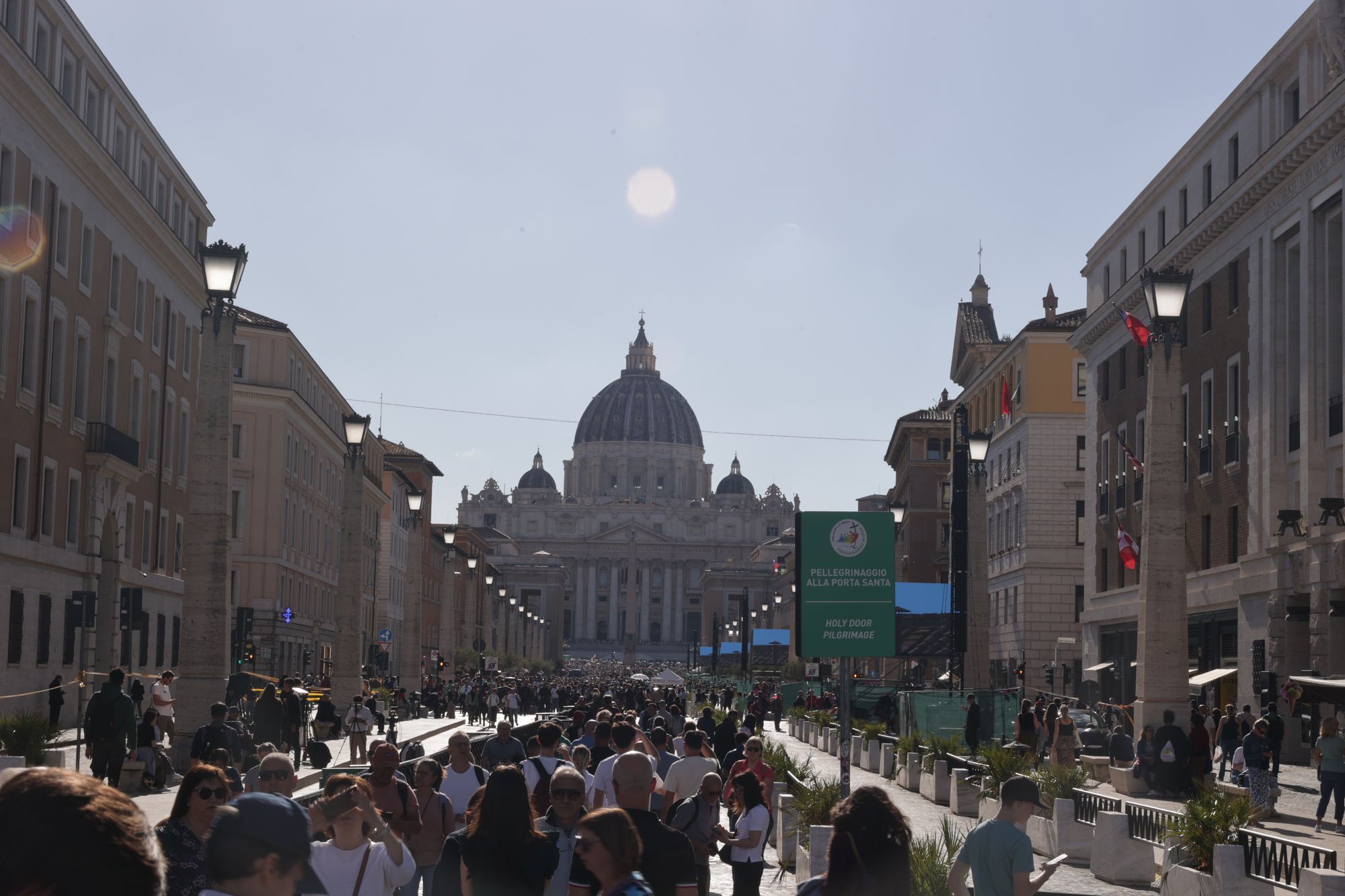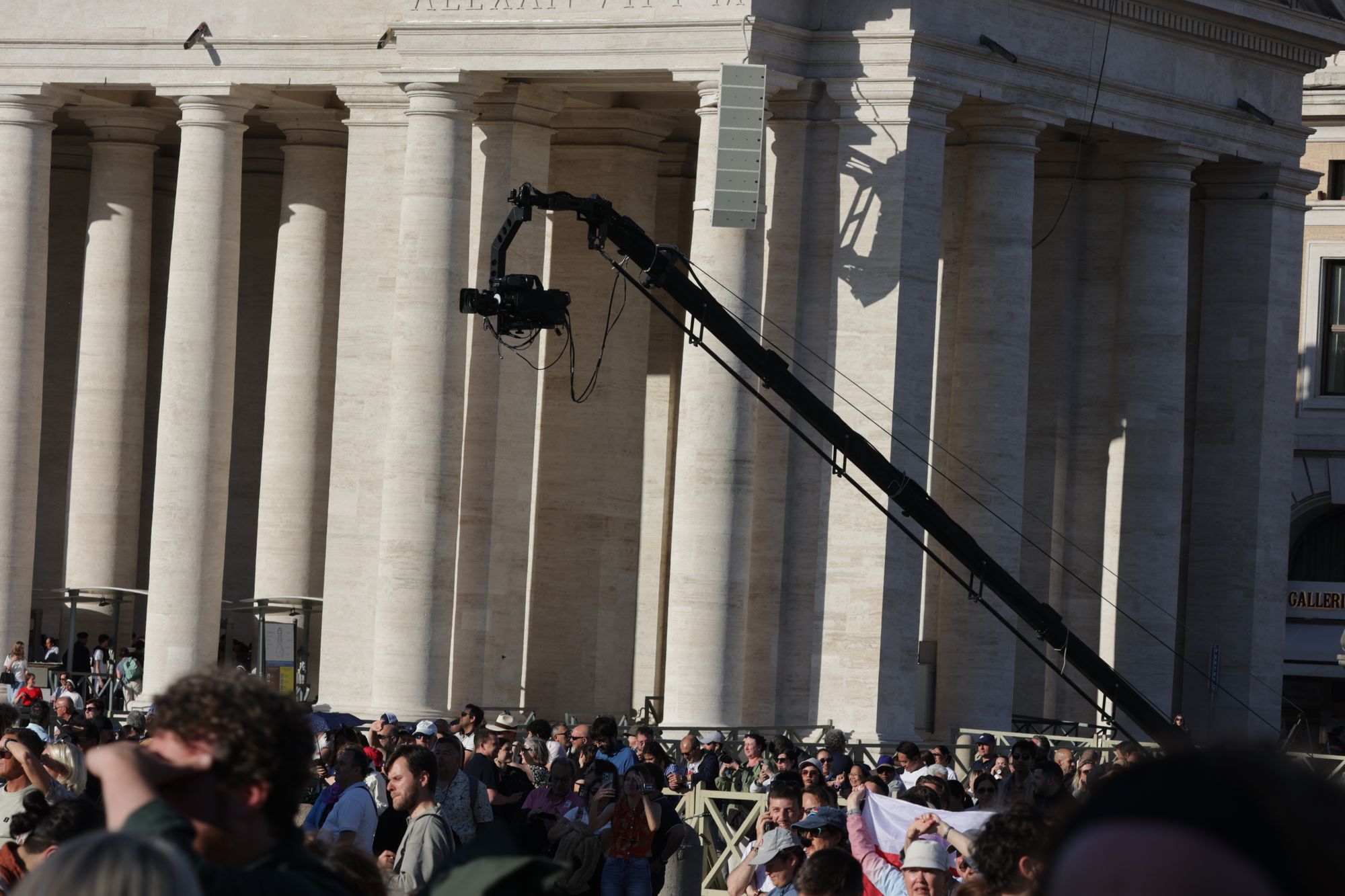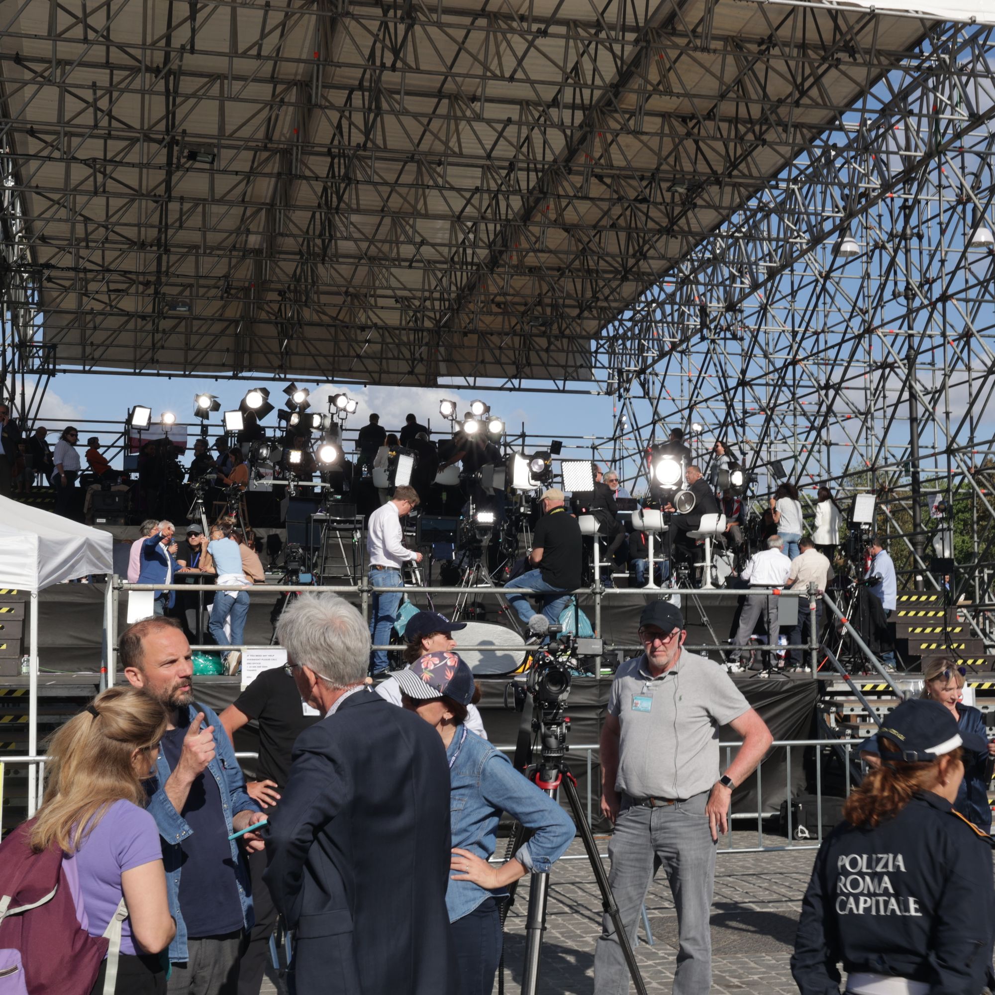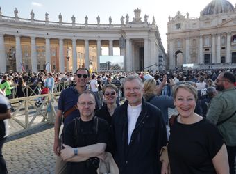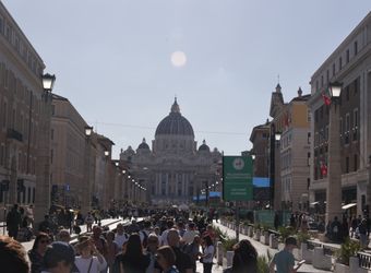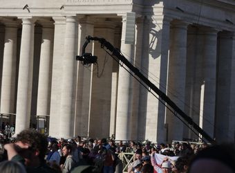 Nach einer ausführlichen Tour durch das touristische Rom am ersten Tag der Wallfahrt zum Heiligen Jahr für Mitarbeiterinnen und Mitarbeiter des Bistums haben an diesem Abend nicht mehr alle die Energie, sich durch die Menschenmenge in der Via della Conciliazione, der Straße, die von der Engelsburg direkt zum Vatikan führt, zu schlängeln. Es geht vorbei an geschätzt 100 Fernsehkameras, die ebenerdig in einem abgesperrten Bereich der Straße stehen. Ebenso viele haben auf zwei erhöhten Gerüsten an der Engelsburg und gegenüber des Petersplatzes Aufstellung bezogen.