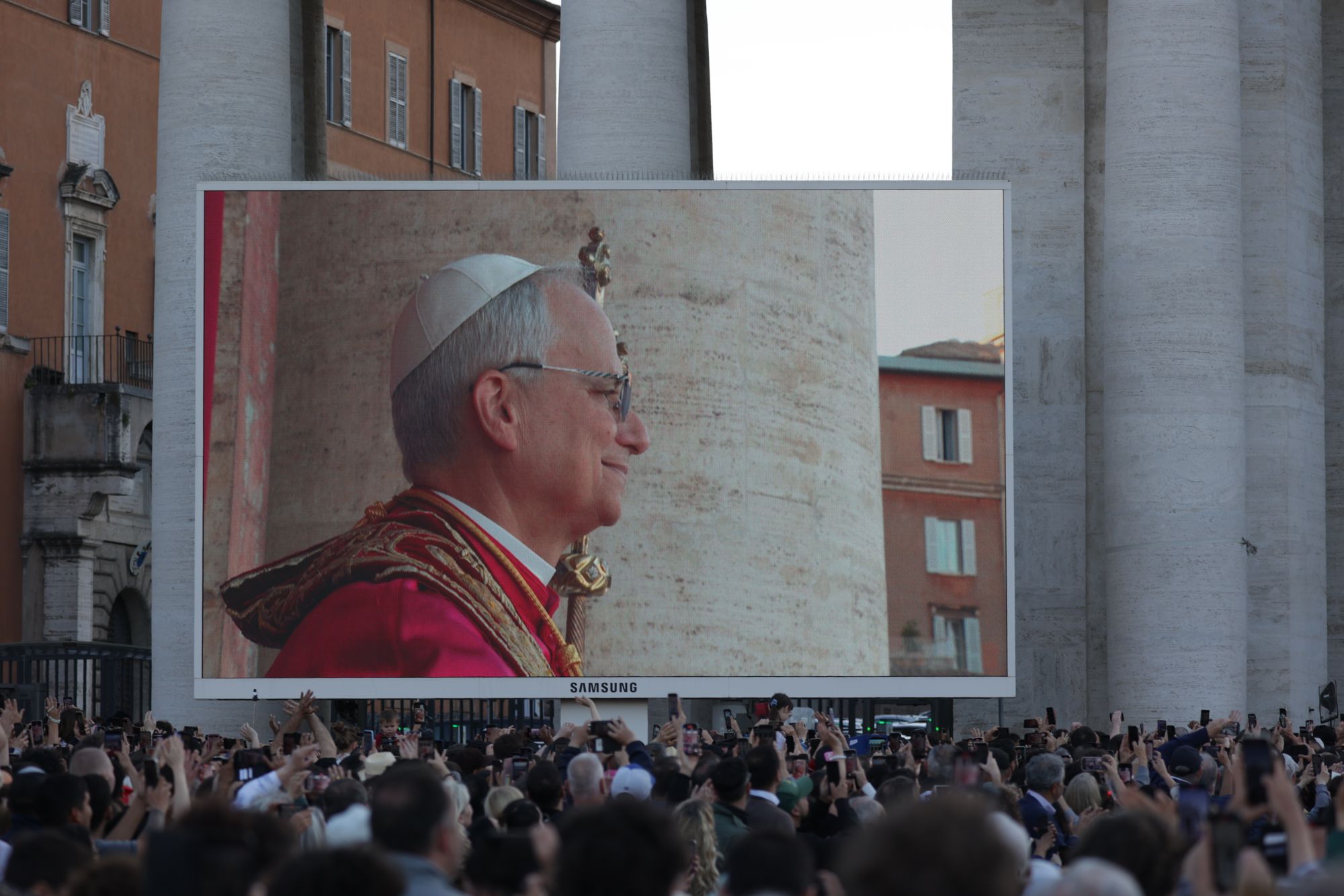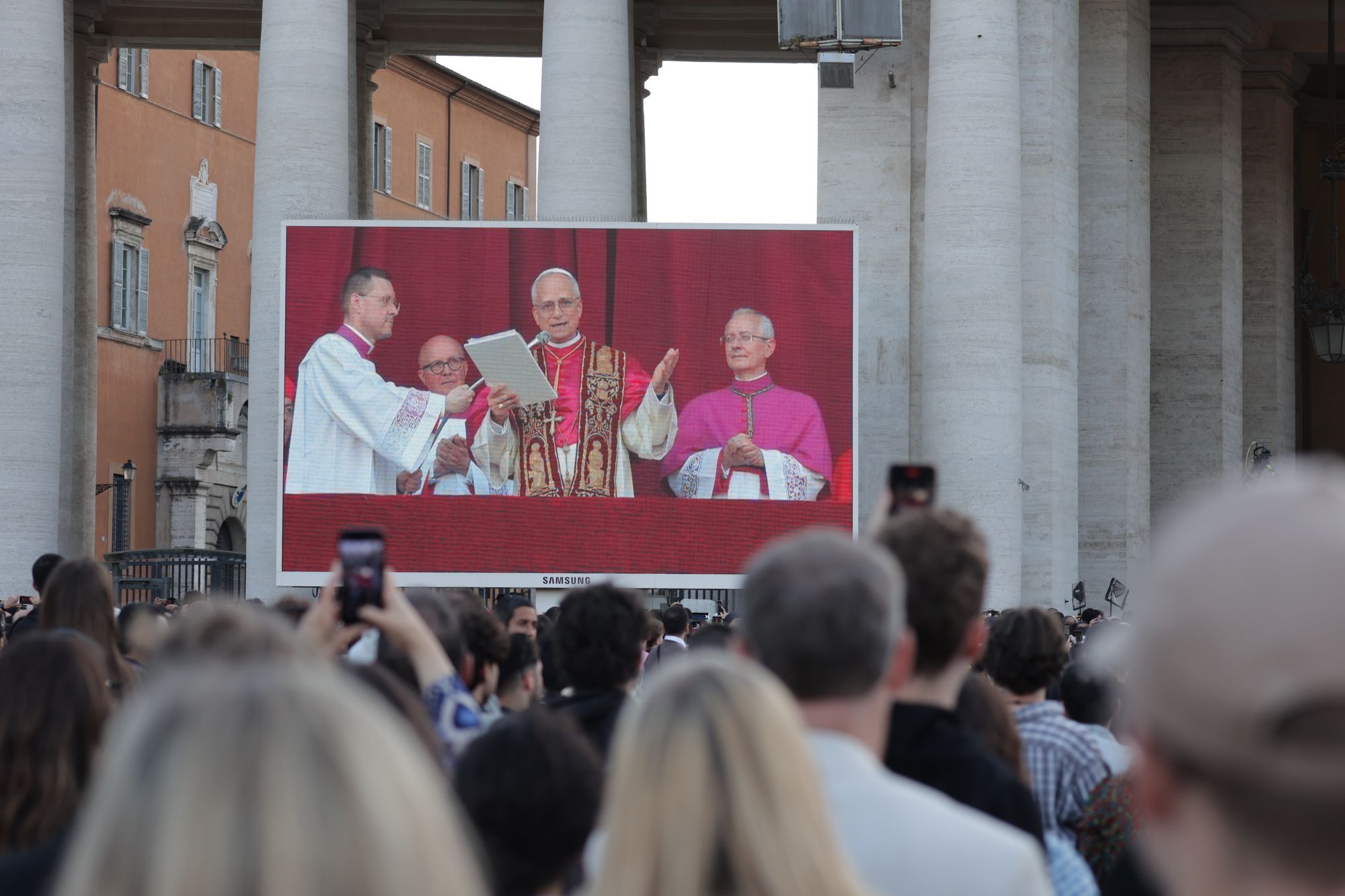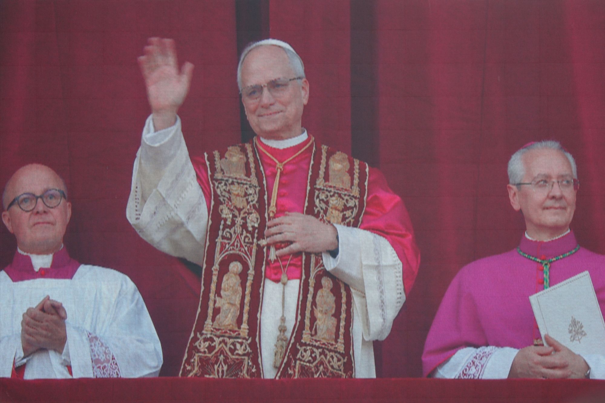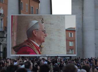 An den Fenstern links und rechts vom zentralen Balkon sind schon die Kardinäle zu sehen. Dort, wo gleich der neue Papst erwartet wird, drapieren eilig Vatikanbedienstete eine große Fahne mit dem Wappen des Vatikans über dem Geländer. „Papa Leone“ klingen derweil schon die Sprechchöre über den Platz. Nach Minuten des Wartens ist es dann endlich so weit: Papst Leo betritt unter tosendem Beifall die Bildfläche. Freude und Rührung sind ihm gleichermaßen anzusehen. Für die Menschen auf dem Platz bieten zahlreiche Videoleinwände besten Blick. Eine Drohne kreist über der Menge und bietet immer wieder spektakuläre Bilder aus der Vogelperspektive.