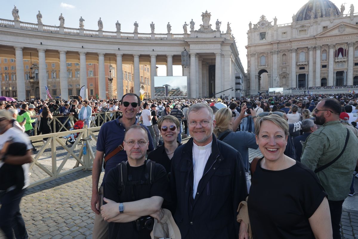 An den Sicherheitsschleusen in den Kolonnaden stauen sich die Massen, die auf den Petersplatz drängen. Zwei italienische Polizisten in Overalls weisen die Deutschen in Richtung einer gerade geöffneten Gasse mit Röntgengerät. Kaum haben Vorndran und seine Begleiter den Platz betreten und sich mittig vor der Loggia des Petersdoms platziert, bricht der Jubel los. „Es ist eine unfassbare Stimmung. Die Leute sind völlig aus dem Häuschen“, sagt der Würzburger Generalvikar. Heute bei einem solchen Weltereignis dabei zu sein, „einfach weil wir als Pilger der Hoffnung im Heiligen Jahr hierhergekommen sind – das ist schon ein großes Glücksgefühl“.