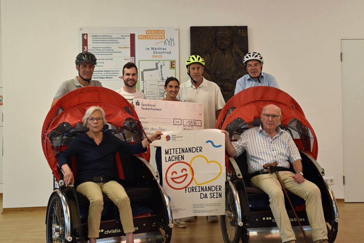 Bildungsreferentin Carolin Lutz nahm den symbolischen Scheck am Montag, 22. Juli, entgegen. Das Geld soll unter anderem für Reparaturen, Radzubehör und Sicherheitswesten verwendet werden. Das kostenlose Angebot „Radeln ohne Alter“ ging im Frühjahr 2022 mit einer Rikscha an den Start. In diesem Sommer wurde eine zweite Rikscha angeschafft. Zehn ehrenamtliche Fahrerinnen und Fahrer fahren zu Seniorenheimen und Tagespflegeeinrichtungen sowie Privatpersonen. „,Radeln ohne Alter‘ setzt sich für die Teilhabe von Menschen mit eingeschränkter Mobilität am gesellschaftlichen Leben und gegen die Vereinsamung und soziale Isolation älterer Mitmenschen ein“, heißt es in der Pressemitteilung des Generationen-Zentrums. Eine Rikscha-Fahrt sei ein Abenteuer, „bei dem gemeinsame Erinnerungen geschaffen und Lebensgeschichten geteilt werden“. Das sei für beide Seiten ein Gewinn. 2019 fuhr Reinhard erstmals mit dem Rad von Kopenhagen bis Barcelona, damals sammelte er Spenden für die Krebsforschung und Krebsstationen. In diesem Jahr fuhren er und Nohe bei der L'Étape Denmark, die ein Teil der „Tour de France“-Breitensport-Serie ist, rund 300 Kilometer mit dem Rad von Flensburg bis Viborg in Dänemark. Mehr Informationen zum Projekt „Radeln ohne Alter“ beim Generationen-Zentrum Matthias Ehrenfried, Bahnhofstraße 4-6, 97070 Würzburg, Telefon 0931/38668700, E-Mail info@generationen-zentrum.com, Internet www.generationen-zentrum.com.