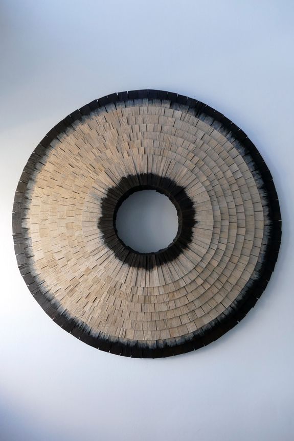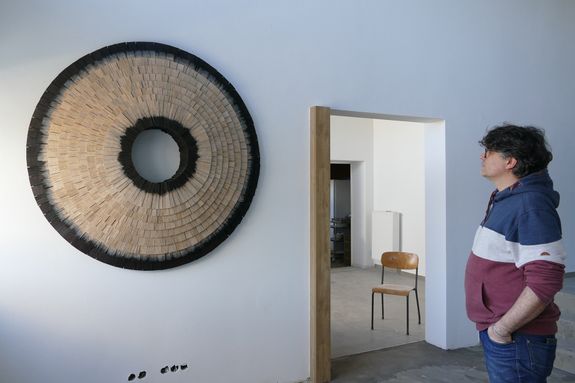 Schmitts Kunstwerk hängt jetzt im zukünftigen Café des Zentrums. Die Arbeit „Winterauge“ ist inspiriert von der menschlichen Iris und besteht aus vielen Holzschindeln, die kreisrund montiert sind. Sie lässt in der Mitte, wo man beim Auge die Pupille erwarten würde, einen Durchblick. Das Werk hat einen Durchmesser von 160 Zentimetern, ist laut Schmitt bereits vor zehn Jahren entstanden und war zwischenzeitlich auf verschiedenen Ausstellungen zu sehen, unter anderem in Schweinfurt und Grünsfeld. „Das Holz zerlegen und spalten und ihm eine neue Form geben, ist für mich etwas Faszinierendes und kommt immer wieder in meinen Arbeiten vor“, erklärt Schmitt. Die Farbgebung – Beige-, Braun- und Schwarztöne in unterschiedlichen Facetten – erinnere sowohl an die dunkle Jahreszeit als auch das Spektrum des menschlichen Auges.