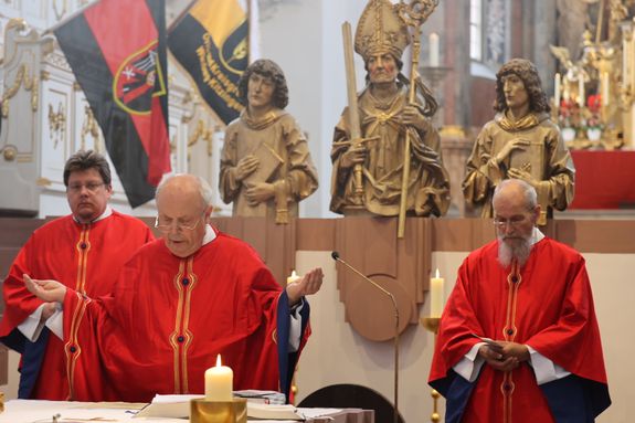 Würzburg (POW) Einen Kiliani-Wallfahrtsgottesdienst für Aussiedler und Vertriebene hat Pfarrer i. R. Adam Possmayer gemeinsam mit Pfarrer Sebastian Krems und Pfarrer i. R. Klaus Oehrlein am Freitag, 12. Juli, im Würzburger Neumünster gefeiert. Rund 100 Gläubige, darunter Fahnenabordnungen von Ackermann-Gemeinde, Sudetendeutschen, Oberschlesiern, Russlanddeutschen und Banater Schwaben, nahmen daran teil.