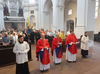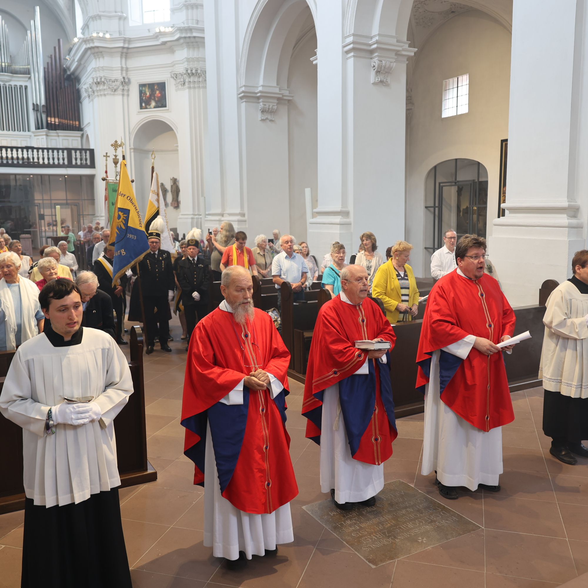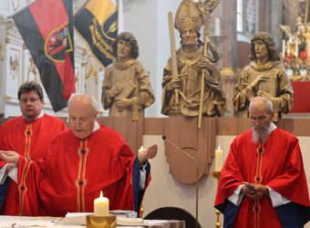 Würzburg (POW) Einen Kiliani-Wallfahrtsgottesdienst für Aussiedler und Vertriebene hat Pfarrer i. R. Adam Possmayer gemeinsam mit Pfarrer Sebastian Krems und Pfarrer i. R. Klaus Oehrlein am Freitag, 12. Juli, im Würzburger Neumünster gefeiert. Rund 100 Gläubige, darunter Fahnenabordnungen von Ackermann-Gemeinde, Sudetendeutschen, Oberschlesiern, Russlanddeutschen und Banater Schwaben, nahmen daran teil.