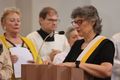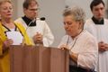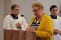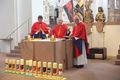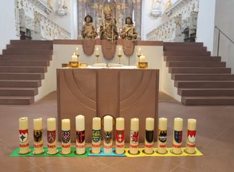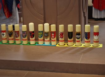 Vor den Fürbitten entzündeten teils in den Trachten ihrer Herkunftsregionen bekleidete Heimatvertriebene große Kerzen mit den Wappen und den Namen ihrer alten Heimatregionen und der neuen Heimat Franken vor dem Altar. Dabei betete Pfarrer Possmayer für alle Menschen, die sich in Deutschland und in den früheren Heimatregionen um Frieden und Aussöhnung bemühen.