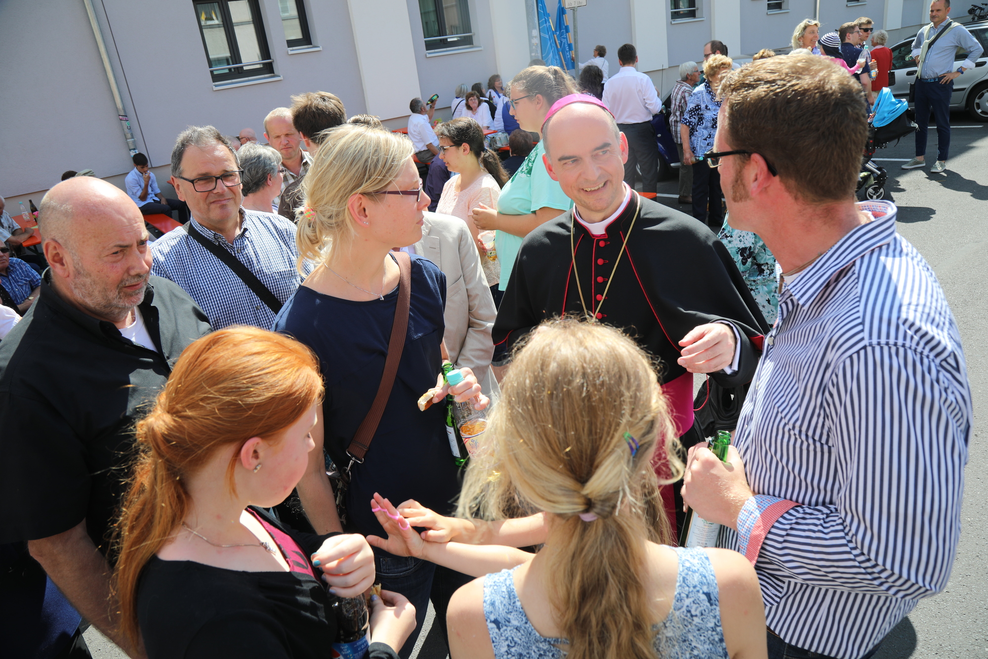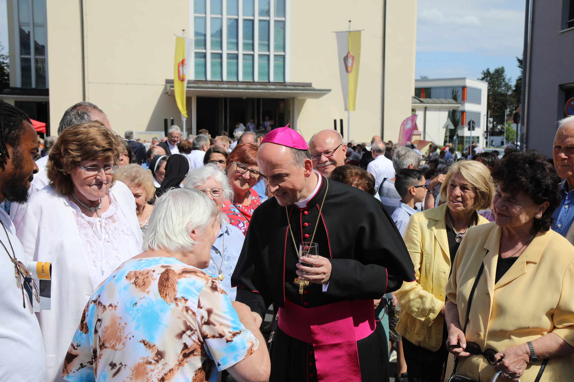 Die Gottesdienstbesucher nutzten bei sommerlichem Wetter im Anschluss die Gelegenheit, ihrem neuen Bischof auf dem Platz vor der Kirche zu begegnen. Es gab kostenloses Gebäck und Getränke für alle. Die Menschen aus dem Raum Schweinfurt und dem Landkreis Haßberge überreichten Bischof Jung persönliche Geschenke, schossen ein Foto mit ihm oder nutzten einfach die Chance, den neuen Oberhirten willkommen zu heißen. „Wir freuen uns, dass wir Sie als Bischof bekommen haben. Sie passen zu uns“, sagte eine ältere Dame.