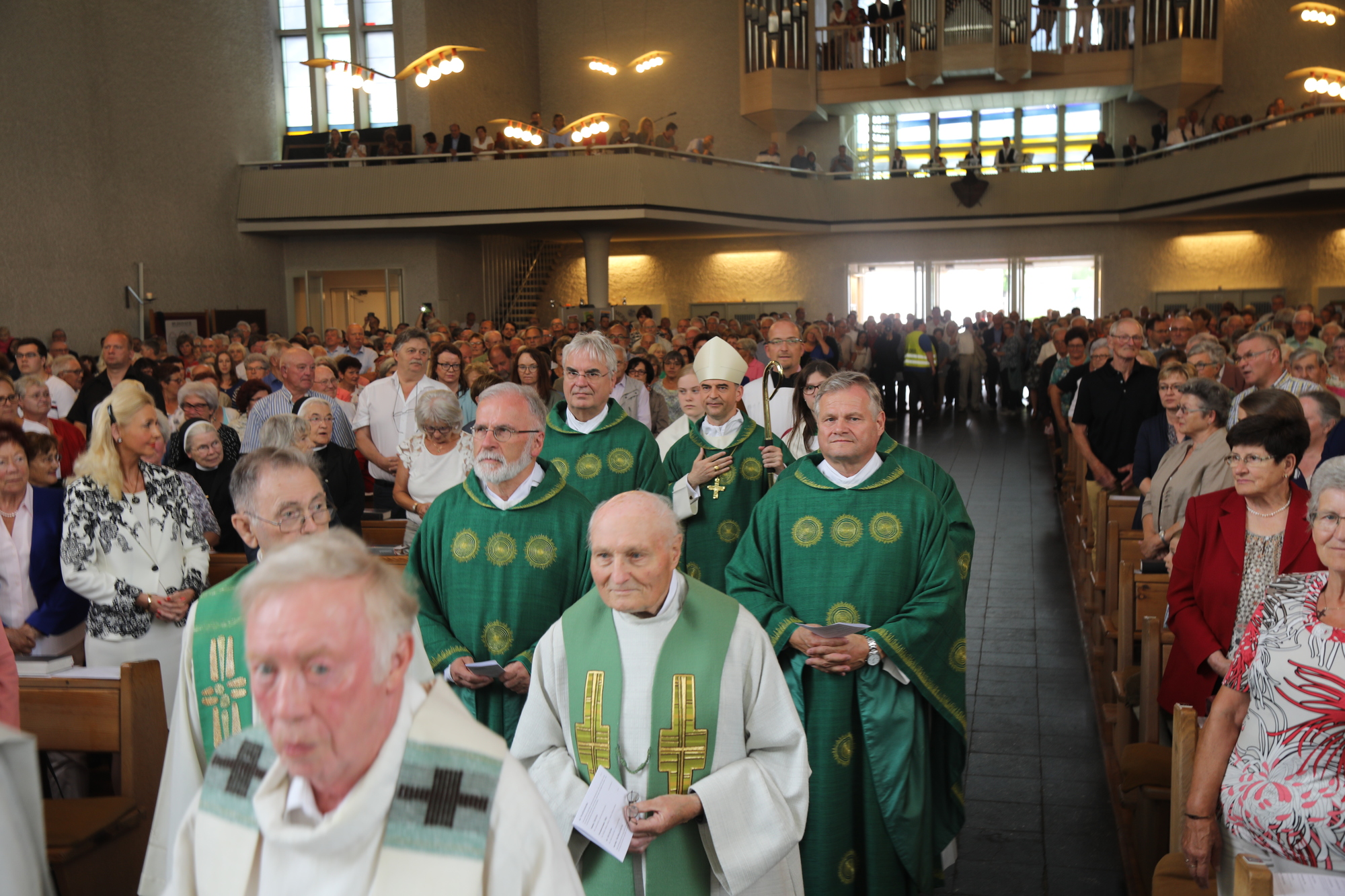 Schweinfurt (POW) Mit über 1000 Gläubigen aus der Region hat am Sonntag, 17. Juni, Bischof Dr. Franz Jung einen Pontifikalgottesdienst in der Schweinfurter Pfarrkirche Sankt Kilian gefeiert. Mehr als 30 Fahnenabordnungen, rund 40 Ministranten, mehr als ein Dutzend Gemeinde- und Pastoralreferentinnen und -referenten, ebenso viele Diakone und etwa 20 Priester zogen dem Bischof voran in die Kirche ein. Es konzelebrierten der Schweinfurter Stadtpfarrer Joachim Morgenroth und die Dekane Werner Kirchner (Schweinfurt-Süd), Gregor Mühleck (Schweinfurt-Nord) und Stefan Gessner (Haßberge). Als Vertreter der Politik nahmen Landtagsabgeordnete Kathi Petersen, Schweinfurts Oberbürgermeister Sebastian Remelé, Landrat Florian Töpper (Landkreis Schweinfurt) und Oskar Ebert für den Landkreis Haßberge an der Feier teil. Pfarrer Heiko Kuschel vertrat die evangelisch-lutherische Kirche.
