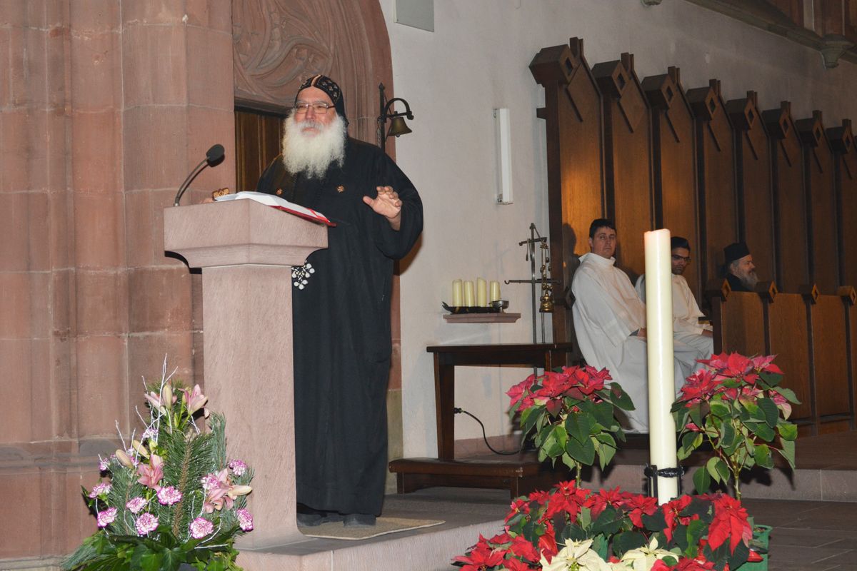 Gegenwärtig lebt Damian in einem Kloster im nordrhein-westfälischen Höxter-Brenkhausen. Im Kreis Höxter gebe es eine große Flüchtlingsunterkunft, erzählte der Bischof. Kopten und andere Christen würden sich dort um die Bewohner kümmern, egal ob diese christlichen, muslimischen oder alevitischen Glaubens seien. „Wir nehmen die Menschen auf, weil sie Ebenbilder Gottes sind.“ Ausdrücklich dankte der Bischof der Gemeinschaft Sant‘Egidio, die zum Gottesdienst eingeladen hatte. Sie lasse Gastfreundschaft lebendig werden, indem sie Flüchtlingen etwa Übersetzungsdienste leiste oder bei Behördengängen helfe.