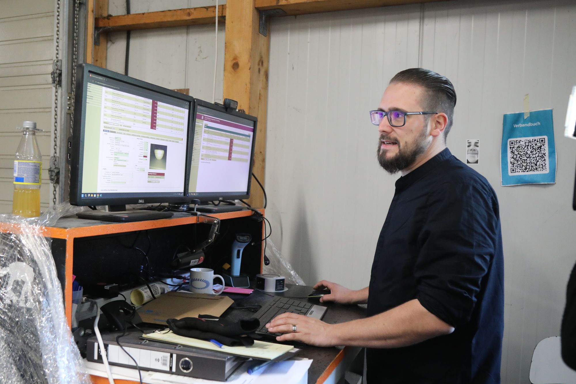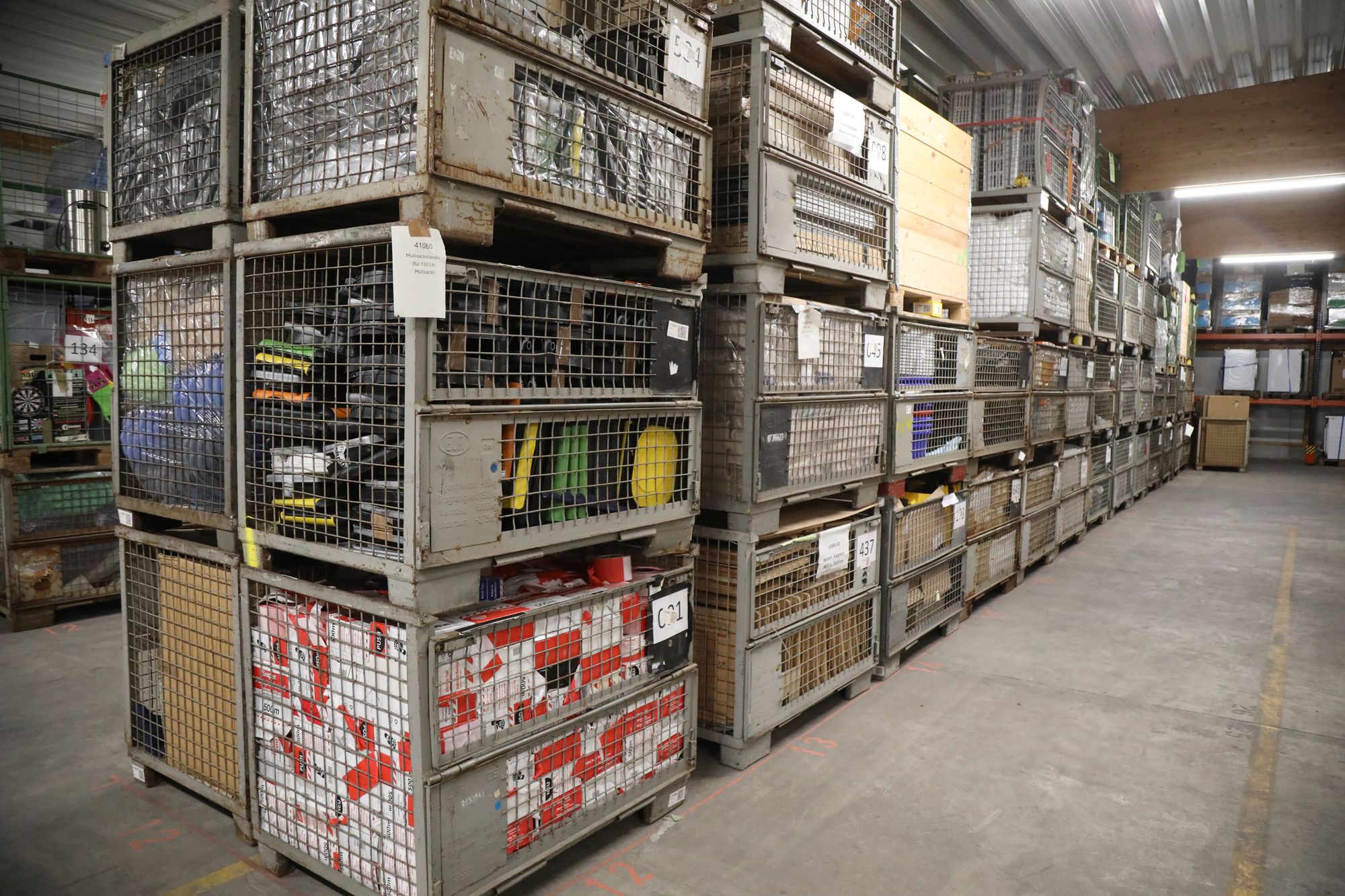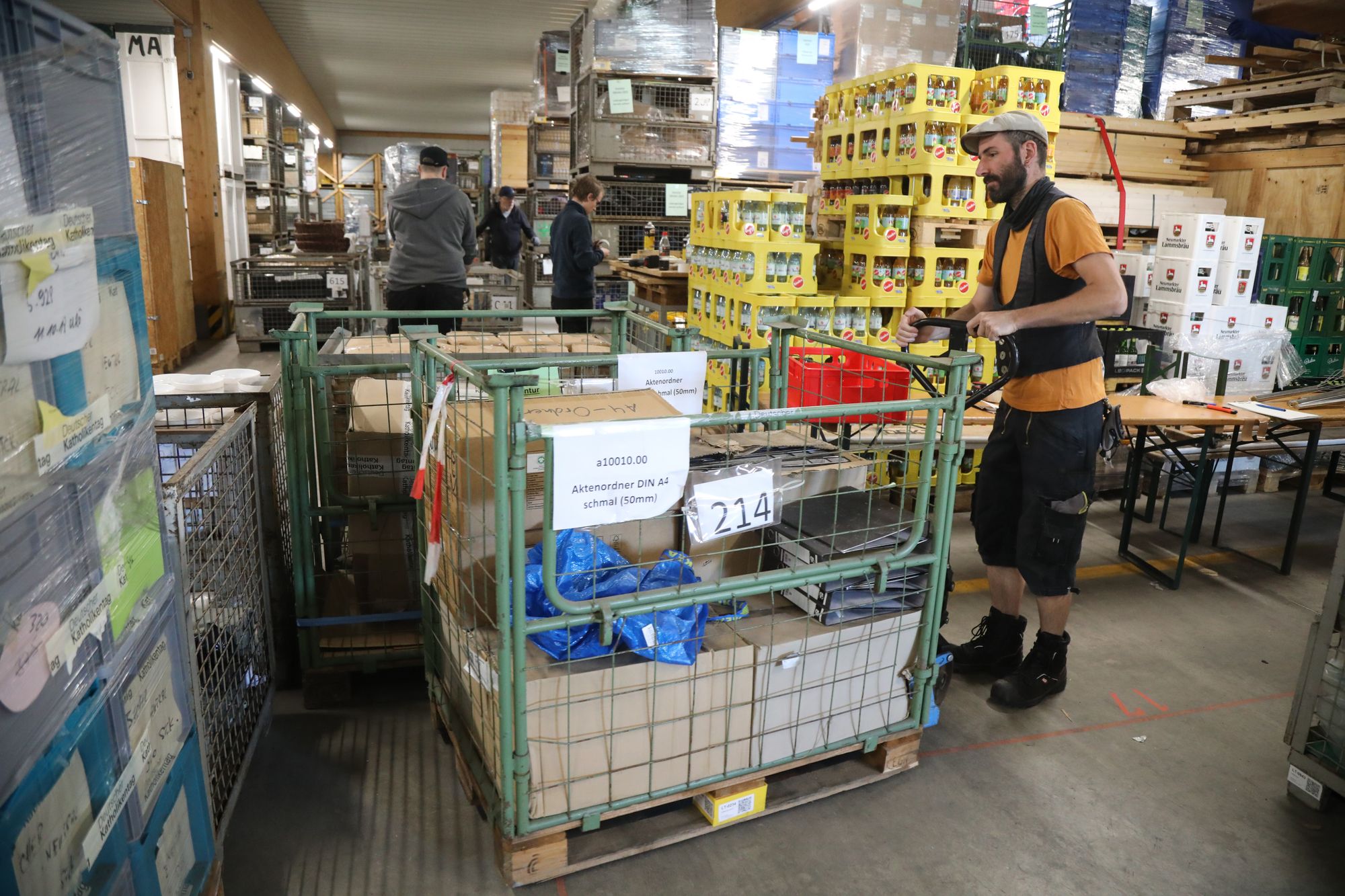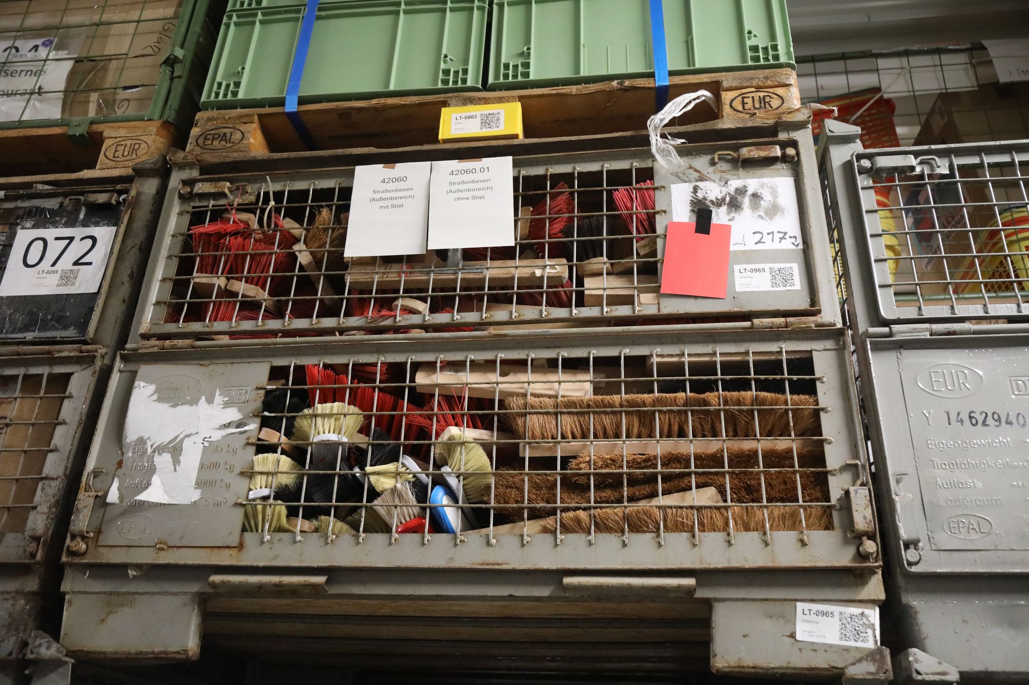 Rund 900 Boxen und Container stapeln sich in der 1180 Quadratmeter großen Halle. Wie viele Artikel hier insgesamt gelagert werden? Michael Dahlke-Schawohl leitet seit zweieinhalb Jahren die Abteilung Beschaffung und Logistik beim Deutschen Evangelischen Kirchentag. „Das ist ganz schwierig“, sagt er. „Zweieinhalb Millionen? Aber das wäre ins Blaue geraten.“ Es komme auch auf die Einheit an: Zählt man nun Stifteschachteln, oder jeden einzelnen Stift? Zum Glück muss nicht alles gezählt werden. „Wenn es um einen Handbesen geht, ist es völlig egal, wo der herkommt. Wenn er gebraucht wird, wird er benutzt“, sagt Dahlke-Schawohl. Aber es gebe auch Dinge, die sehr speziell katholisch oder evangelisch sind. „Ziborienschalen zum Beispiel.“ Ein Ziborium ist ein Behälter für geweihte Hostien und wird nur für den Katholikentag benötigt. Die Kaffeebecher mit dem Jerusalemkreuz dagegen, dem Logo des Evangelischen Kirchentags, werden im kommenden Jahr nicht gebraucht und müssen also auch nicht gezählt werden.