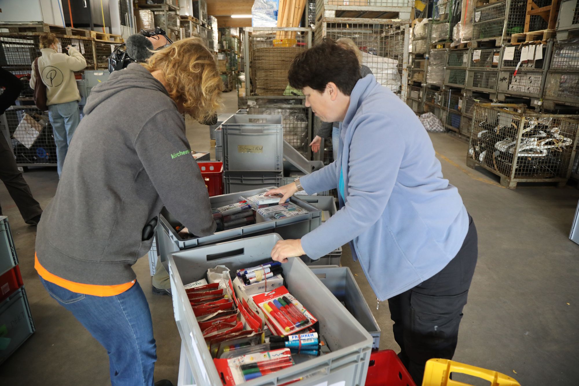 Hünfeld/Würzburg (POW) Anja Ewald beugt sich über eine große Plastikbox mit Filzstiften und Textmarkern in allen denkbaren Farben. Viele sind noch in der Originalverpackung aus transparentem Kunststoff, andere sind mit einem Gummiband zusammengezurrt. Anja Ewald nimmt eine Pappschachtel heraus und schüttelt sie. „Beim Schütteln merkst Du, ob die nur halbvoll ist“, erklärt sie einer weiteren Helferin. Die Lagerinventur für den 104. Deutschen Katholikentag vom 13. bis 17. Mai 2026 in Würzburg ist in vollem Gange. Im Ökumenischen Logistikzentrum in Hünfeld im Landkreis Fulda lagert alles, was man für einen Katholikentag beziehungsweise einen Evangelischen Kirchentag benötigt – von Büromaterial über Geschirr und Mülleimer bis hin zu Feldbetten. Alles, was für den Katholikentag in Würzburg gebraucht wird, muss kontrolliert und gezählt werden. Anja und Carsten Ewald aus Hirschberg an der Bergstraße (Rhein-Neckar-Kreis) gehören seit 2012 zum ehrenamtlichen Helferteam im Lager. Zwischen 14 und 20 Urlaubstagen investieren die beiden jedes Jahr. „Es ist wie ein Virus“, sagt Anja Ewald. „Wenn man einmal dabei war, ist man immer dabei.“