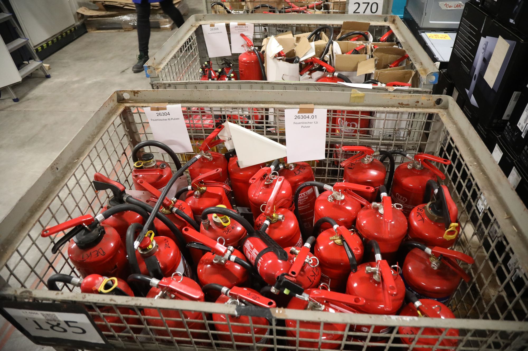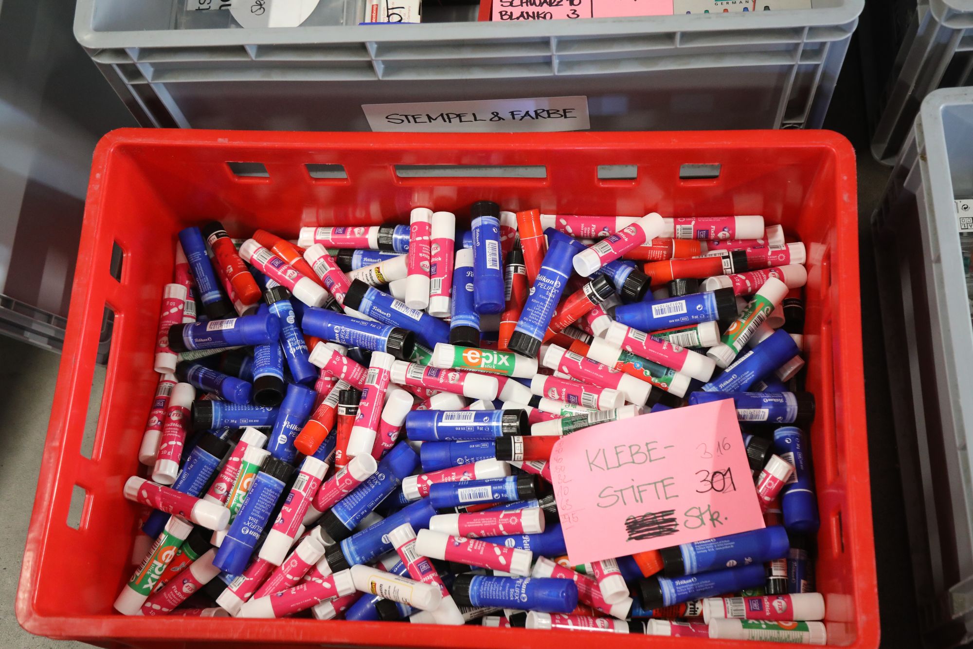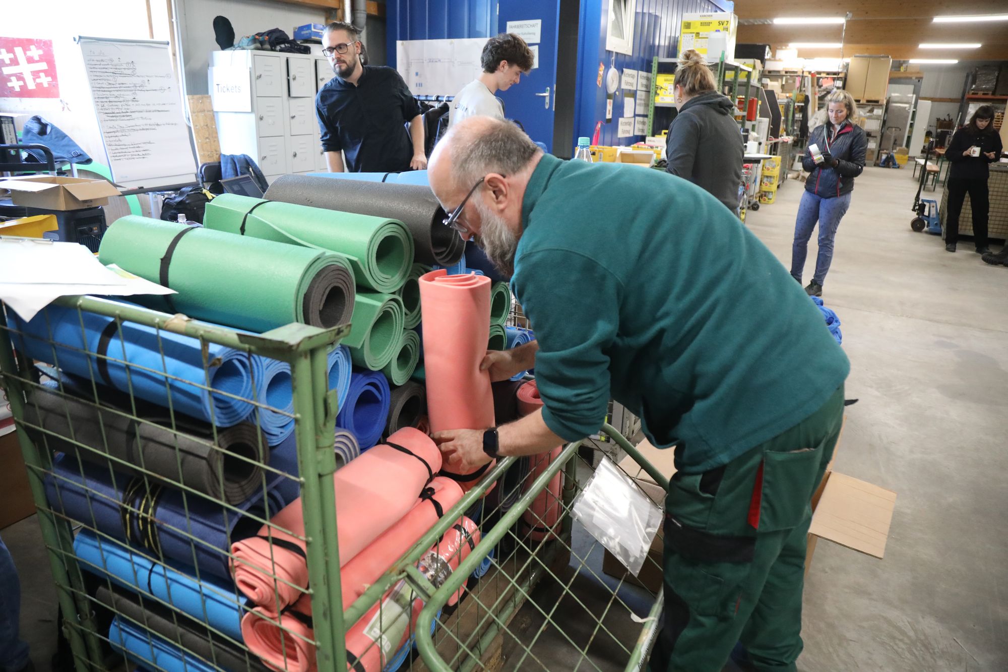 Vieles, was hier gelagert wird, sind ganz normale Gebrauchsartikel, etwa Büromaterial wie Textmarker, Papier und Schnellhefter. Bunte Klebepunkte in verschiedenen Größen, um Orte auf Stadtplänen zu markieren. Servietten und Mülleimer, Kochtöpfe und Schneebesen. Ein großes Thema seien Gemeinschaftsquartiere für die Helferinnen und Helfer, sagt Dahlke-Schawohl. „Sie werden von uns mit allem ausgestattet, was für eine kurzfristige Unterbringung von vielen Menschen notwendig ist.“ Das fängt bei Frühstücksgeschirr an und hört bei Isomatten und Feldbetten auf. Nicht zu vergessen Boxen mit Rauchwarnmeldern und Feuerlöschern. „Es gibt nichts, was es nicht gibt“, ist die Erfahrung von Carsten Ewald. Es sei wichtig, „dass man nur Sachen herausgibt, die auch funktionieren und nicht abgelaufen sind“, erklärt er. Kaputte Stifte oder abgelaufenes Desinfektionsmittel etwa müssen entsorgt werden. Anja Ewald sortiert eine Box mit Kleiderbügeln – aus Holz oder Plastik, schwarz, weiß oder naturbelassen. „Wir kontrollieren auch, dass sie sauber und nicht kaputt sind. Stellt Euch vor, der Kanzler kommt und will seine Jacke aufhängen.“ Gerade die scheinbar einfachen Dinge seien wichtig, ist ihre Erfahrung: „Schlimm ist es, wenn zum Beispiel Scheren, Spülmittel oder Händedesinfektionsmittel fehlen.“