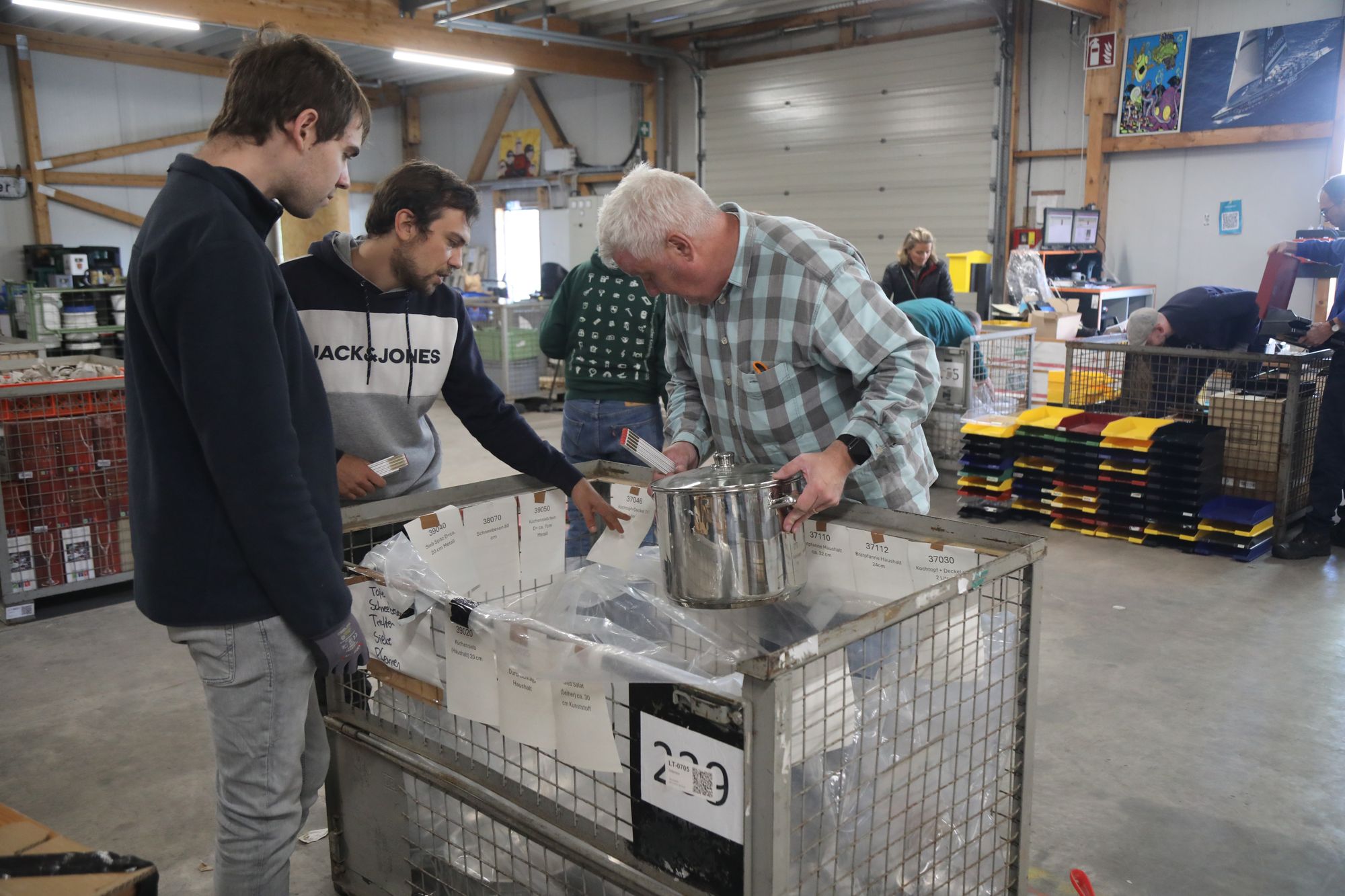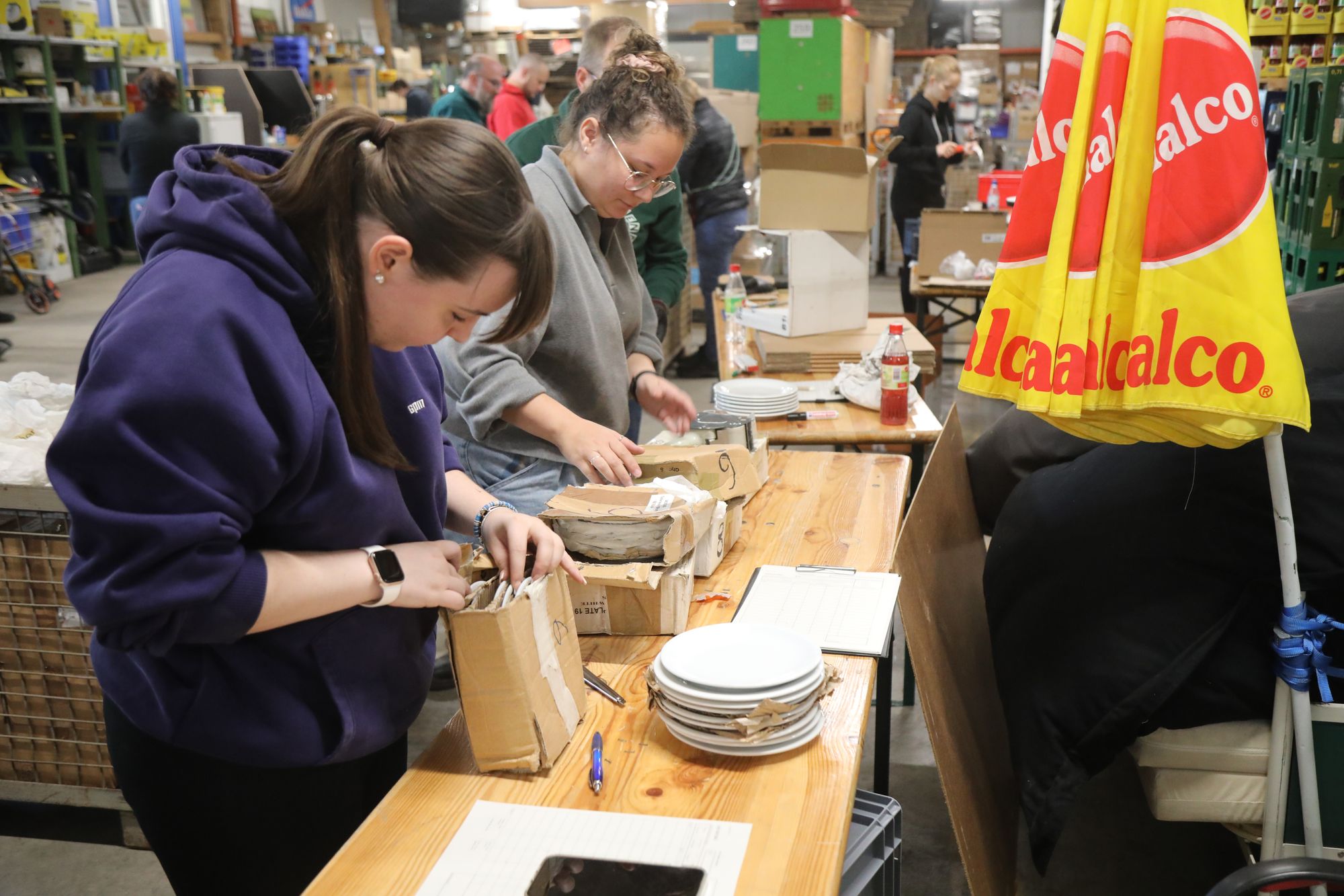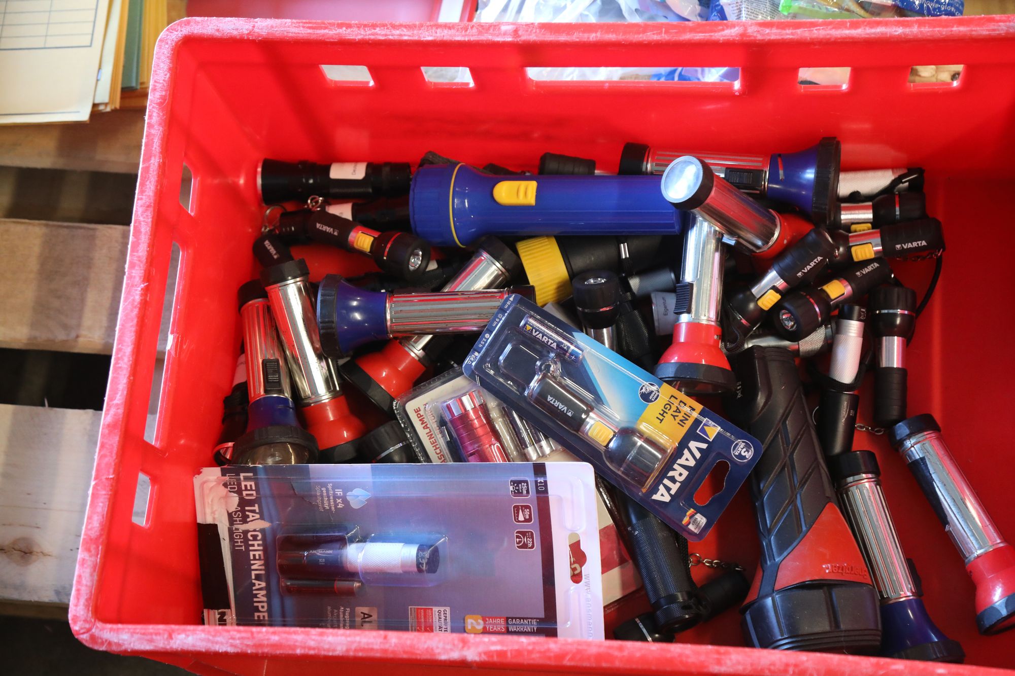 Vieles, was hier gelagert wird, sind ganz normale Gebrauchsartikel, etwa Büromaterial wie Textmarker, Papier und Schnellhefter. Bunte Klebepunkte in verschiedenen Größen, um Orte auf Stadtplänen zu markieren. Servietten und Mülleimer, Kochtöpfe und Schneebesen. Ein großes Thema seien Gemeinschaftsquartiere für die Helferinnen und Helfer, sagt Dahlke-Schawohl. „Sie werden von uns mit allem ausgestattet, was für eine kurzfristige Unterbringung von vielen Menschen notwendig ist.“ Das fängt bei Frühstücksgeschirr an und hört bei Isomatten und Feldbetten auf. Nicht zu vergessen Boxen mit Rauchwarnmeldern und Feuerlöschern. „Es gibt nichts, was es nicht gibt“, ist die Erfahrung von Carsten Ewald. Es sei wichtig, „dass man nur Sachen herausgibt, die auch funktionieren und nicht abgelaufen sind“, erklärt er. Kaputte Stifte oder abgelaufenes Desinfektionsmittel etwa müssen entsorgt werden. Anja Ewald sortiert eine Box mit Kleiderbügeln – aus Holz oder Plastik, schwarz, weiß oder naturbelassen. „Wir kontrollieren auch, dass sie sauber und nicht kaputt sind. Stellt Euch vor, der Kanzler kommt und will seine Jacke aufhängen.“ Gerade die scheinbar einfachen Dinge seien wichtig, ist ihre Erfahrung: „Schlimm ist es, wenn zum Beispiel Scheren, Spülmittel oder Händedesinfektionsmittel fehlen.“