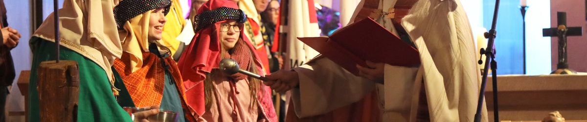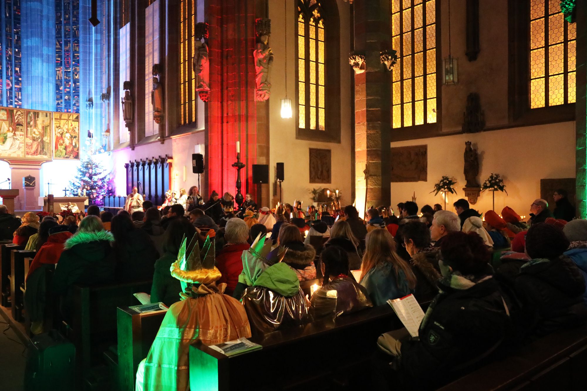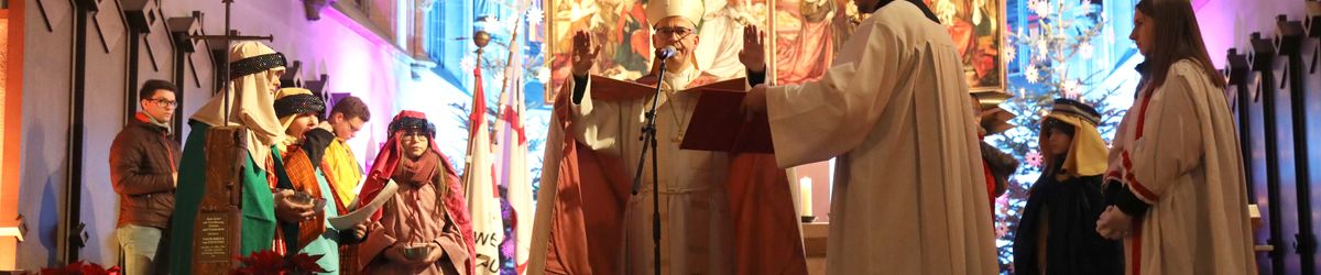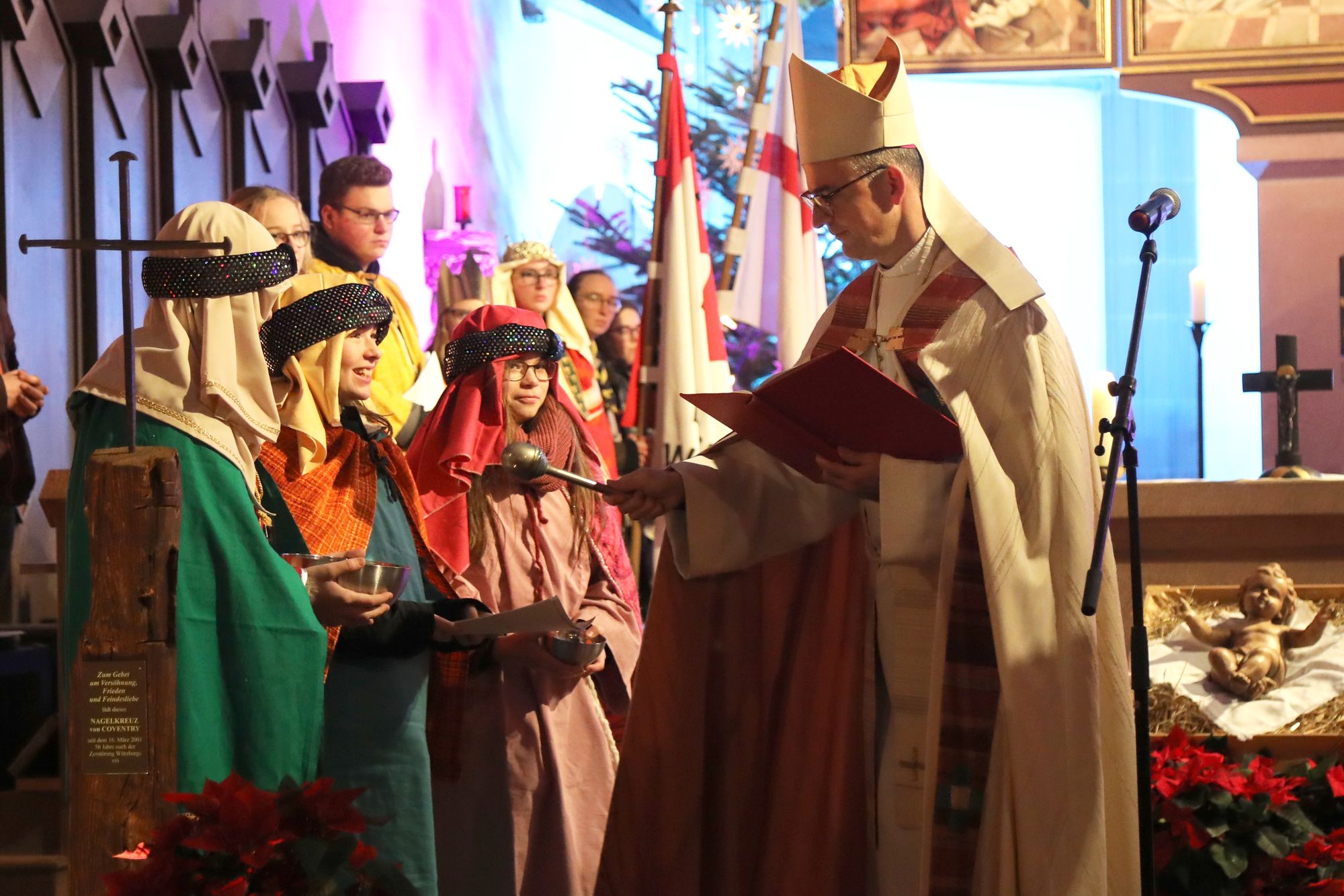 Die Heiligen Drei Könige würden auch die drei Weisen aus dem Morgenland genannt. „Weise, weil ihre Klugheit von der Krippe stammt, vom Kind, das den Frieden bringt. Morgenland, weil überall da, wo sie hinkommen, ein neuer Morgen anbricht. Das Land, das morgen anfängt, das aber heute verkündet werden muss“, sagte Bischof Jung. „Heute werdet Ihr ausgesandt, damit das Morgen Gottes in unseren Häusern, in unseren Pfarreien, in unserem Bistum anbricht.“ Am Ende der Feier brachten Sternsinger symbolisch Kreide und Weihrauch zum Altar und ließen sie vom Bischof segnen. Musikalisch begleitet wurde das Abendgebet von der Sternsinger-Projektband. Farbige Scheinwerfer tauchten die Marienkapelle in ein märchenhaftes Licht.