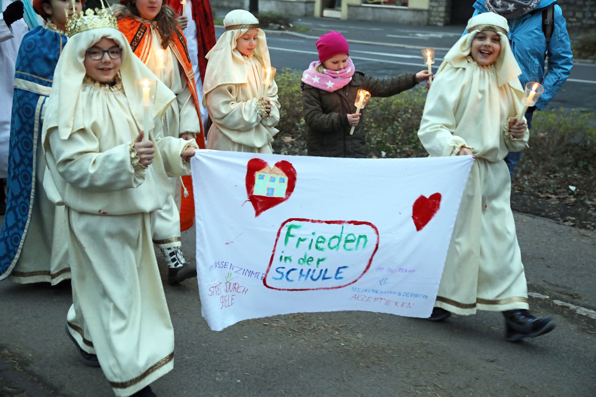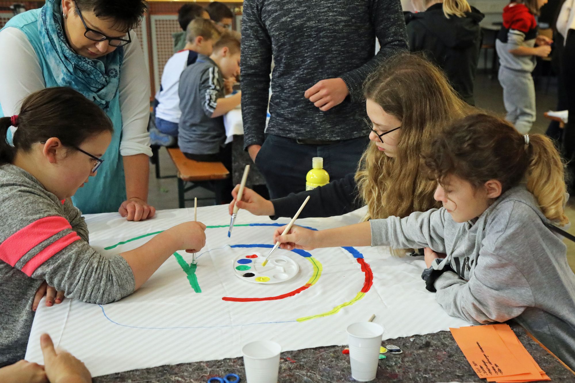Dann stellten sich zwei Würzburger Initiativen für den Frieden vor. Elisabeth Nikolai von der Nagelkreuz-Initiative Würzburg erzählte den Jungen und Mädchen, wie ihre Mutter und Geschwister aus dem brennenden Haus in einen Keller hinter der Residenz flüchteten. „Meine Großmutter konnte nicht mehr aus dem Keller und ist erstickt.“ Das alles habe sich noch vor ihrer Geburt ereignet. Das Wandernagelkreuz aus Coventry sei 2001 als Symbol für den Frieden nach Würzburg verliehen worden. Seit Ende 2017 gibt es den Verein „pics4peace“. Sie habe Angst um den Frieden in der Gesellschaft gehabt, erklärte Initiatorin Dr. Pia Beckmann. In kreativen Projekten befassen sich junge Menschen mit Themen wie Meinungsfreiheit, Mobbing oder Fake News. „Sie können durch Videos, Texte, Bilder oder Lieder einen Beitrag leisten für den Frieden in der Gesellschaft“, erklärte Beckmann.