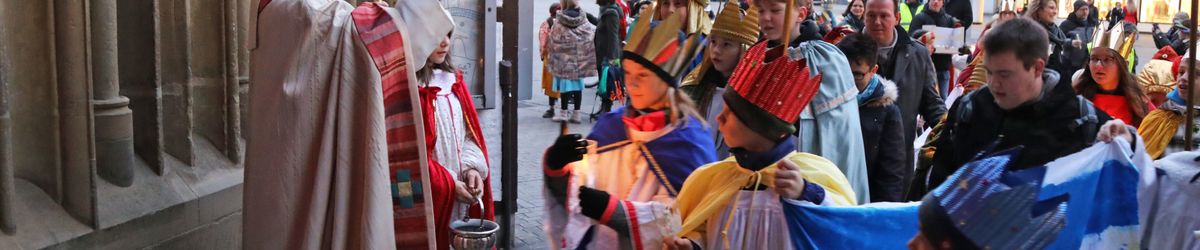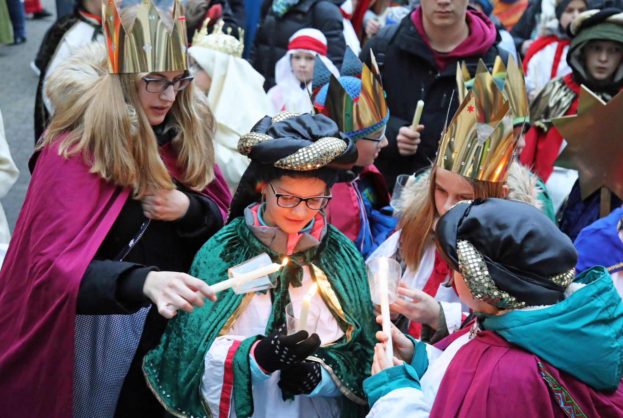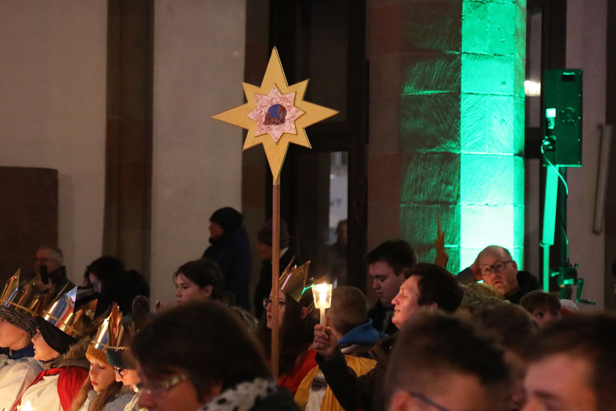 Würzburg (POW) Rund 200 Mädchen und Jungen aus allen Regionen des Bistums Würzburg mit ihren Begleitern haben am Freitagnachmittag, 3. Januar, an der diözesanen Aussendungsfeier der Sternsinger in Würzburg teilgenommen. Die jungen Königinnen und Könige zogen vom Kilianeum-Haus der Jugend über die Balthasar-Neumann-Promenade und durch die Innenstadt zur Marienkapelle. Dort sandte Bischof Dr. Franz Jung die Sternsinger bei einem Abendgebet aus. Es gebe bei den Menschen eine Sehnsucht, dass der Friede des Kindes in der Krippe in die Häuser und Familien einziehe, sagte der Bischof zu den Jungen und Mädchen. „Es ist schön, dass Ihr Euch senden lasst. Der Friede Gottes beflügelt Euch, zu den Menschen zu gehen und Boten Christi zu sein.“ In den Tagen um das Dreikönigsfest am 6. Januar werden rund 8000 Sternsingerinnen und Sternsinger in den Gemeinden des Bistums Würzburg unterwegs sein. Die diesjährige 62. Aktion Dreikönigssingen steht unter dem Leitwort „Segen bringen, Segen sein. Frieden! im Libanon und weltweit“.