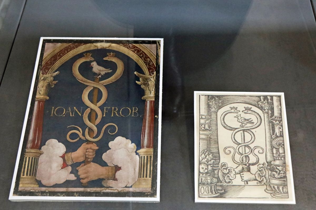Schon immer waren Archive und Bibliotheken auf großzügige Spender angewiesen. So habe etwa der Basler Buchdrucker und Verleger Johann Froben (1460-1527), ein gebürtiger Hammelburger, seiner Heimatstadt zeitlebens Exemplare seiner Druckwerke geschenkt, erzählt Willner. Über die alte Hammelburger Kirchenbibliothek seien diese in die Bibliothek des Franziskanerklosters Altstadt bei Hammelburg gekommen, die 2012 von der Diözesanbibliothek übernommen wurde. So sind in einer Vitrine nun ein von Froben gedruckter Bibelkommentar aus dem Jahr 1507 sowie Reproduktionen seines Druckersignets zu sehen – ein Stab mit einer Taube, umwunden von zwei Schlangen. „Hans Holbein der Jüngere hat sie für Froben gestaltet.“ Beide lebten und arbeiteten zur gleichen Zeit in Basel.