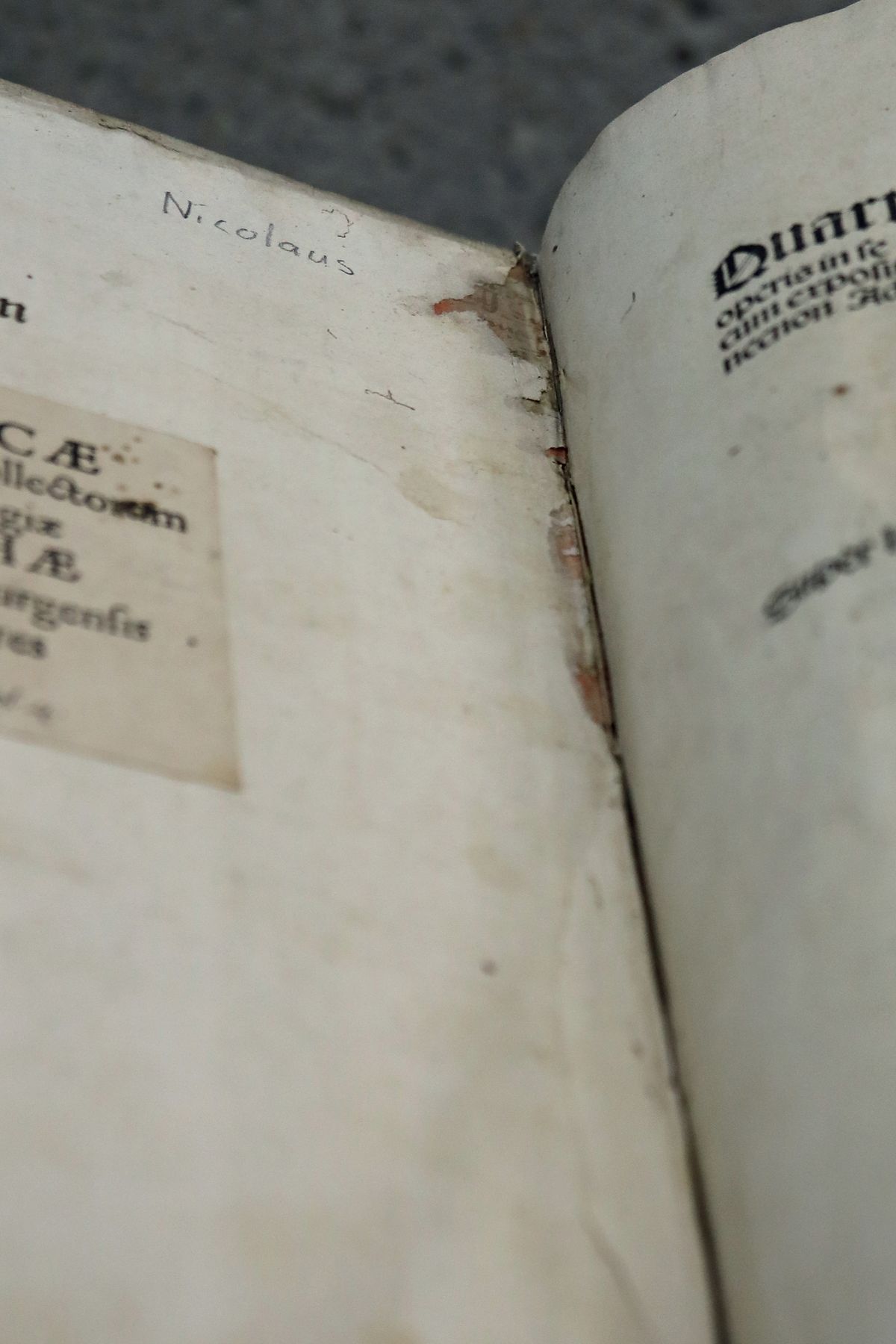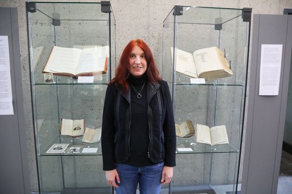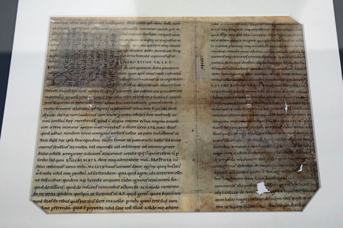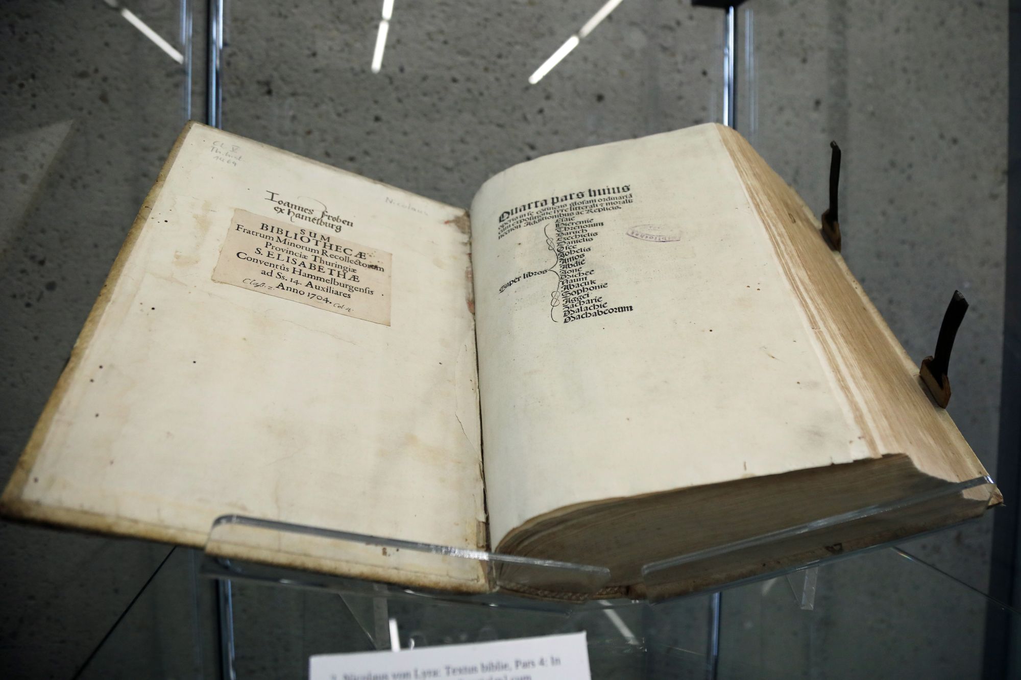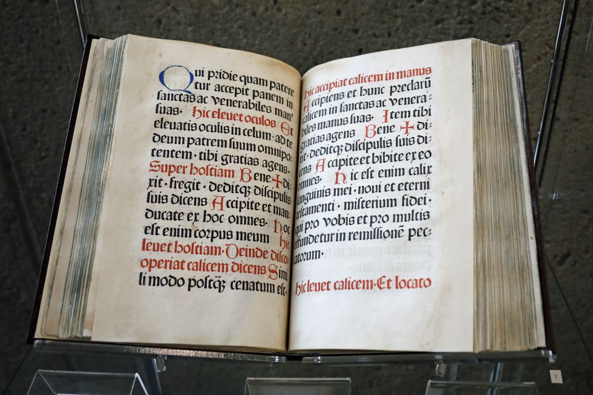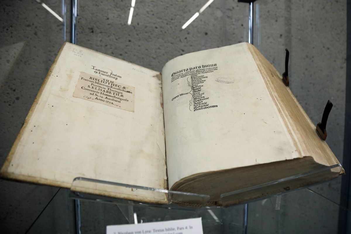 Ein besonderes Werk ist sicherlich ein Messbuch (Missale) von 1495. Es ist das älteste Missale aus dem Bistum Würzburg, das im Bestand der Diözesanbibliothek vorhanden ist. Auffällig ist die übergroße, gut lesbare Schrift – der Papierverbrauch scheint keine Rolle gespielt zu haben. Pergament hingegen sei ein „wertvoller Rohstoff“ gewesen, erzählt Willner. „Wenn Handschriften nicht mehr gebraucht wurden, wurden sie als Einbände recycelt oder in Streifen geschnitten, um Buchrücken zu stärken.“ Den Adleraugen von Archivrat Dr. Norbert Kandler ist es zu verdanken, dass das rund 1000 Jahre alte Fragment einer Cicero-Handschrift aus der Würzburger Domschreibschule erhalten ist. Das Doppelblatt wurde im 16. Jahrhundert als Einband für ein Rechnungsbuch des Benediktinerinnenpriorats Sankt Ulrich in Würzburg wiederverwendet. „Kandler hatte einen Blick dafür. Er hat gesehen, dass um das Rechnungsbuch herum ein alter Einband ist, und hat ihn von einem Restaurator ablösen lassen.“ Die Ausstellung zeigt eine originalgetreue Reproduktion – das Original wäre zu empfindlich. Wer mag, kann sich in der Ausstellung selbst auf die Suche nach einer solchen verborgenen Kostbarkeit machen. Kleiner Tipp: Es lohnt sich, den Falz des Bibelkommentars in der Vitrine zur Bibliothek des Franziskanerklosters Altstadt einmal ganz genau zu betrachten.