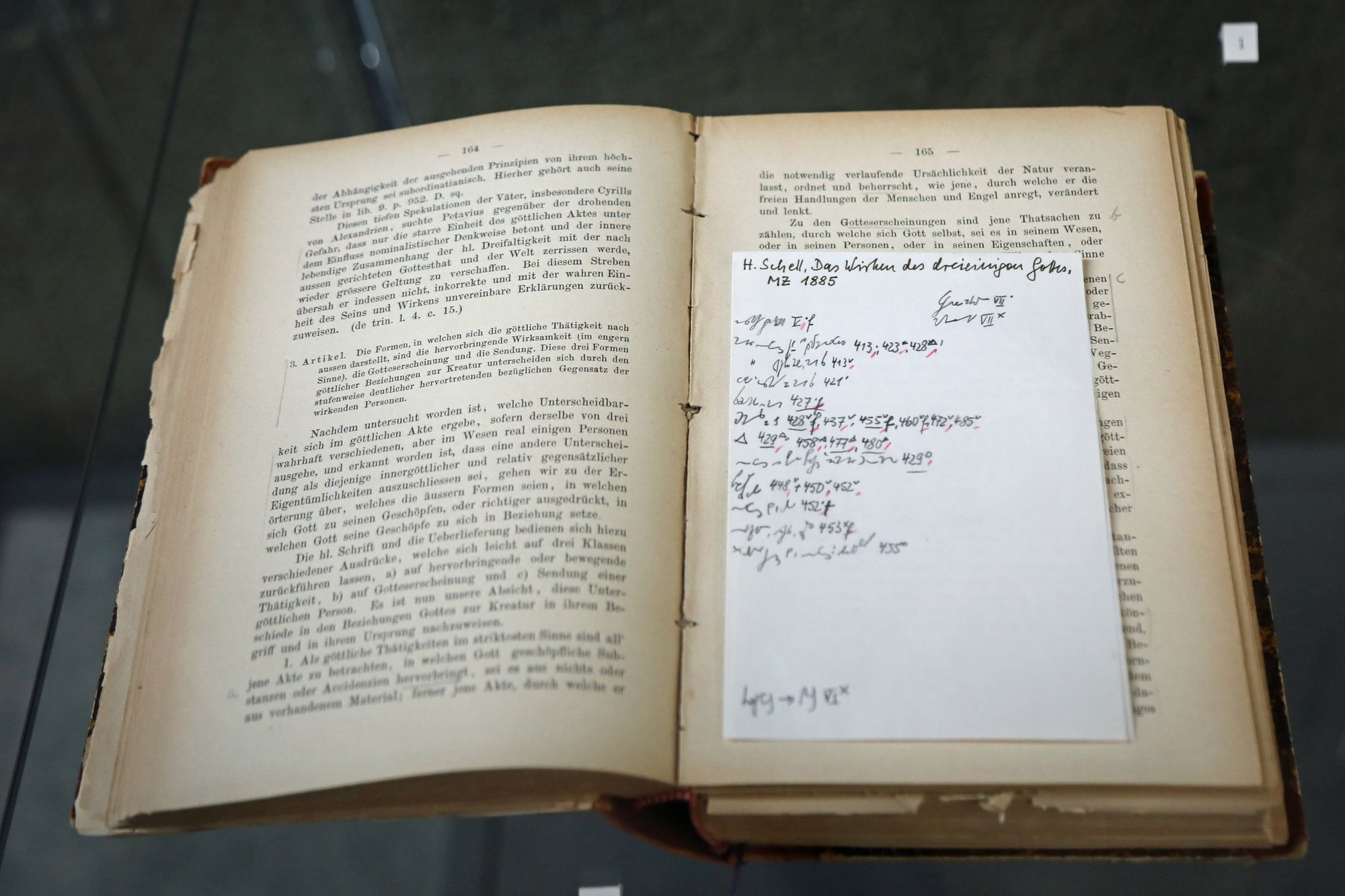 Manchen Werken sieht man an, dass mit ihnen intensiv gearbeitet wurde. So unterstrich der verstorbene Bischof Dr. Paul-Werner Scheele in dem Buch „Das Wirken des dreieinigen Gottes“ etliche Passagen mit Bleistift und hinterließ einen Zettel mit handschriftlichen Anmerkungen – in einem eigenen System aus Abkürzungen und Zahlen. Aus Bischof Scheeles Privatbibliothek wurde übrigens die beachtliche Menge von rund 10.000 Büchern übernommen.