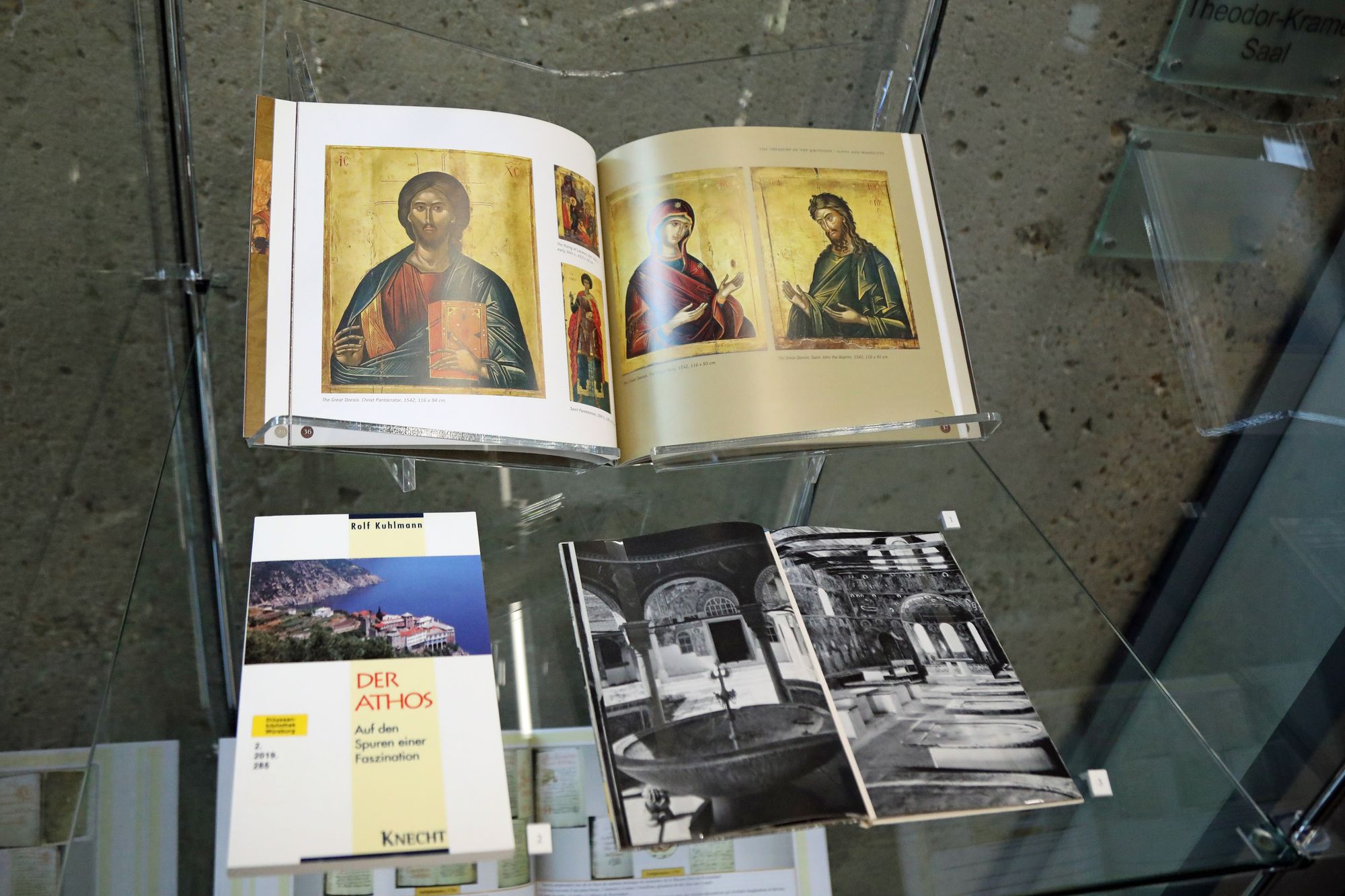 Drei Spezialsammlungen werden in der Ausstellung besonders gewürdigt. Gereon Becking (1931-2016), ehemals Mitarbeiter im Bau- und Kunstreferat der Diözese, vermachte der Diözesanbibliothek im Jahr 2009 seine mehrere tausend Bände umfassende Zisterzienser-Sammlung („Cisterciensia“) mit Schwerpunkt Europa. Manfred Zentgraf, Gründungsmitglied der Fränkischen Sankt Jakobus-Gesellschaft, überließ 2013 seine Sammlung von Jakobus- und Pilgerliteratur, darunter ein entzückend illustriertes „Akkordeon-Büchlein“ zum Aufklappen aus Frankreich. Manche der Werke seien „europaweit nur in unserem Bestand vorhanden“, sagt Willner. Zudem ergänze Zentgraf die Sammlung laufend um die neuesten Publikationen. Jüngstes Beispiel für eine Spezialsammlung ist die umfangreiche private Sammlung von Herbert Pfeifer (1941-2008) zum Berg Athos, die dessen Sohn Michael Pfeifer, Referent für liturgische Bildung, vor fünf Jahren an die Diözesanbibliothek übergab. „Wer sich mit diesen Themen beschäftigt, kann bei uns aus dem Vollen schöpfen“, sagt Willner.