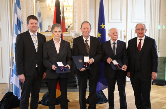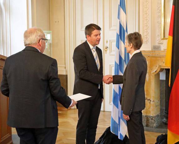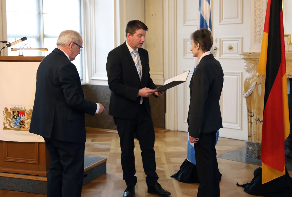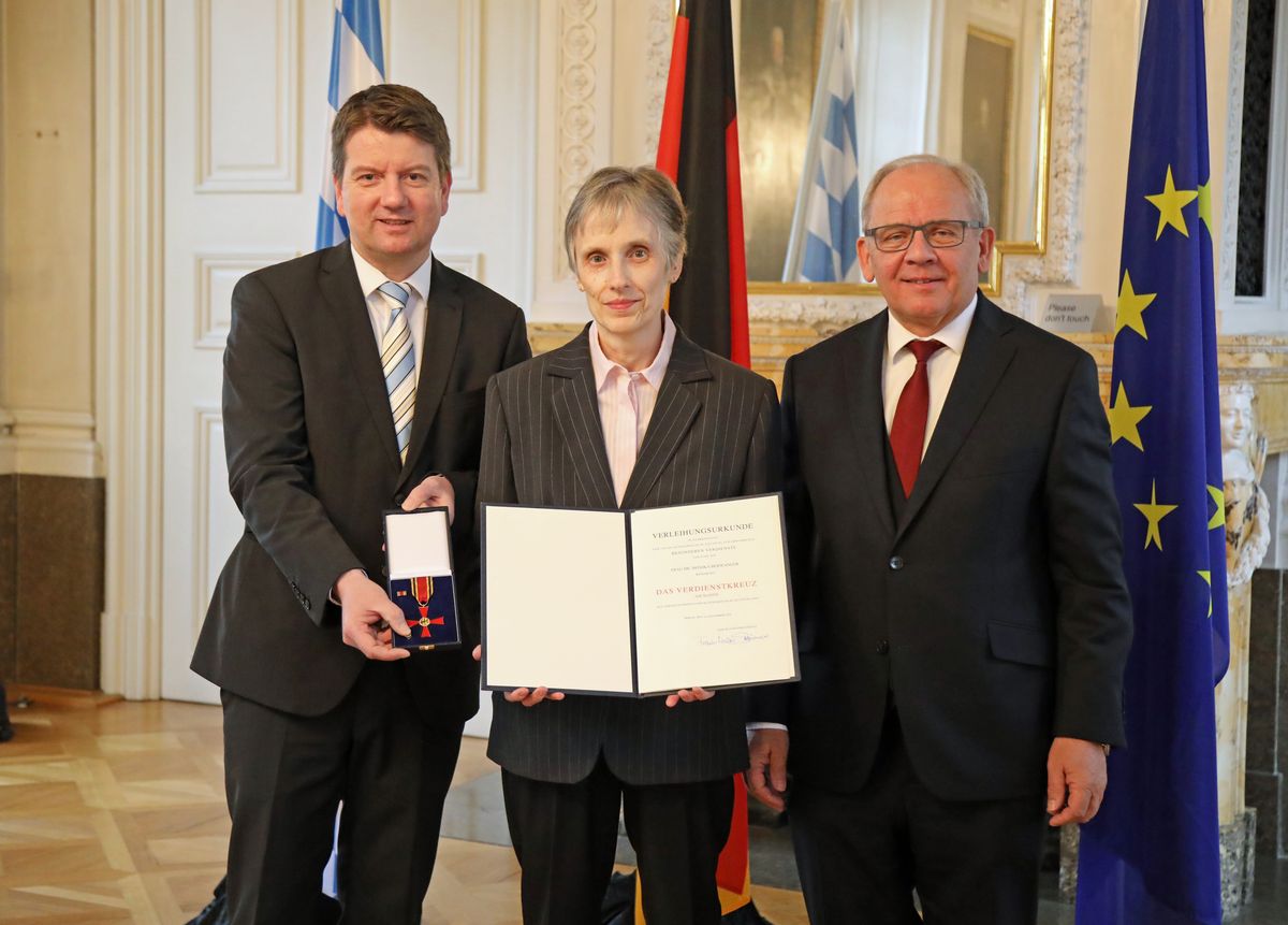 Würzburg (POW) Pastoralreferentin i. R. Dr. Monika Berwanger (67), langjährige Referentin in der Abteilung Fort- und Weiterbildung des Bistums Würzburg, ist am Freitag, 26. April, mit dem Verdienstkreuz am Bande des Verdienstordens der Bundesrepublik Deutschland geehrt worden. Innenstaatssekretär Sandro Kirchner und Regierungspräsident Dr. Eugen Ehmann überreichten die Auszeichnung bei einer Feierstunde in der Würzburger Residenz. „Sie setzen sich vielfältig und unermüdlich im Ehrenamt, insbesondere im Bereich der Integration, ein und haben sich hierbei auszeichnungswürdige Verdienste erworben“, sagte Kirchner in seiner Laudatio. An der Feier nahmen unter anderem Vertreter der Hauptabteilungen Bildung und Kultur sowie Seelsorge des Bistums, der Universität Würzburg sowie des Johanna-Stahl-Zentrums teil.