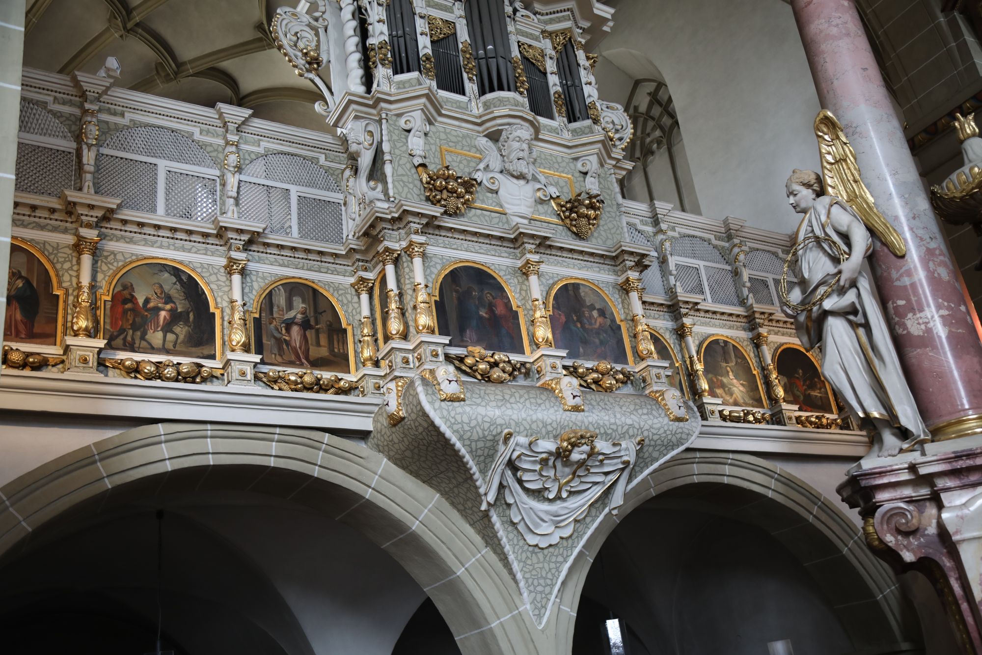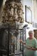 Ausgangspunkt des Teilstücks ist „Maria im Sand“ in Dettelbach. Eine legendäre Wunderheilung im Jahr 1504 war der Beginn der Wallfahrt, die auch die Reformation überdauerte und bis heute besteht. „Das Portal und auch die Kanzel stammen vom protestantischen Künstler Michael Kern“, sagt Ingeborg Weissmann, die regelmäßig Besuchern das Gotteshaus und seine Besonderheiten erläutert. Insgesamt 40 Personen sind auf der Kanzel aus dem Jahr 1626 zu sehen, die als eine der schönsten Steinmetzarbeiten der deutschen Renaissance gilt. Eine Besonderheit der Kirche ist aber auch Pfarrer Treutlein bei seinen bisherigen Besuchen in Dettelbach nicht aufgefallen. An der Emporenbrüstung hinter dem Gnadenaltar von Agostini Bossi sind die Schmerzen Mariens abgebildet, aber statt der gewöhnlich sieben zusätzlich ein achter: „Jesus nimmt Abschied von der Mutter.“