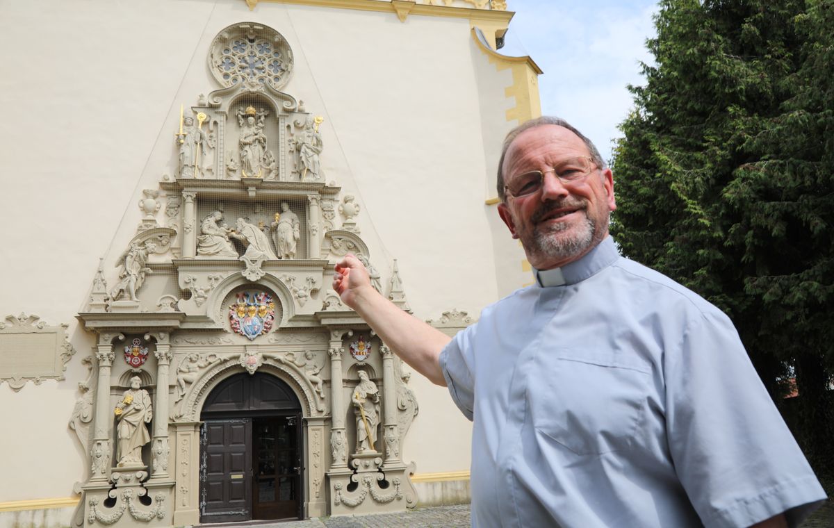 Dettelbach/Volkach (POW) Das prächtige Portal über der Dettelbacher Wallfahrtskirche steht in den Augen von Pfarrer Josef Treutlein, Wallfahrtsseelsorger auf dem Würzburger Käppele, für die Ankunft in einer Marienkirche. „Sie gingen in das Haus und fanden das Kind und seine Mutter“, zitiert der Initiator des Fränkischen Marienwegs aus der Bibel. Dabei zeigt er auf die Darstellung der Anbetung des Jesuskinds durch die drei Weisen über dem Eingangstor. „Wer zu Fuß zwischen den vielen Marienheiligtümern in unserer Heimat unterwegs ist, wird immer auch Jesus Christus dabei ein Stück näherkommen“, ist er überzeugt. Seit 2002 ist der besondere Pilgerweg in Unterfranken beschildert und verbindet auf insgesamt 887 Kilometern gut ausgeschilderter Wander- und Fahrradwege 50 Marienwallfahrtsorte im Bistum Würzburg.