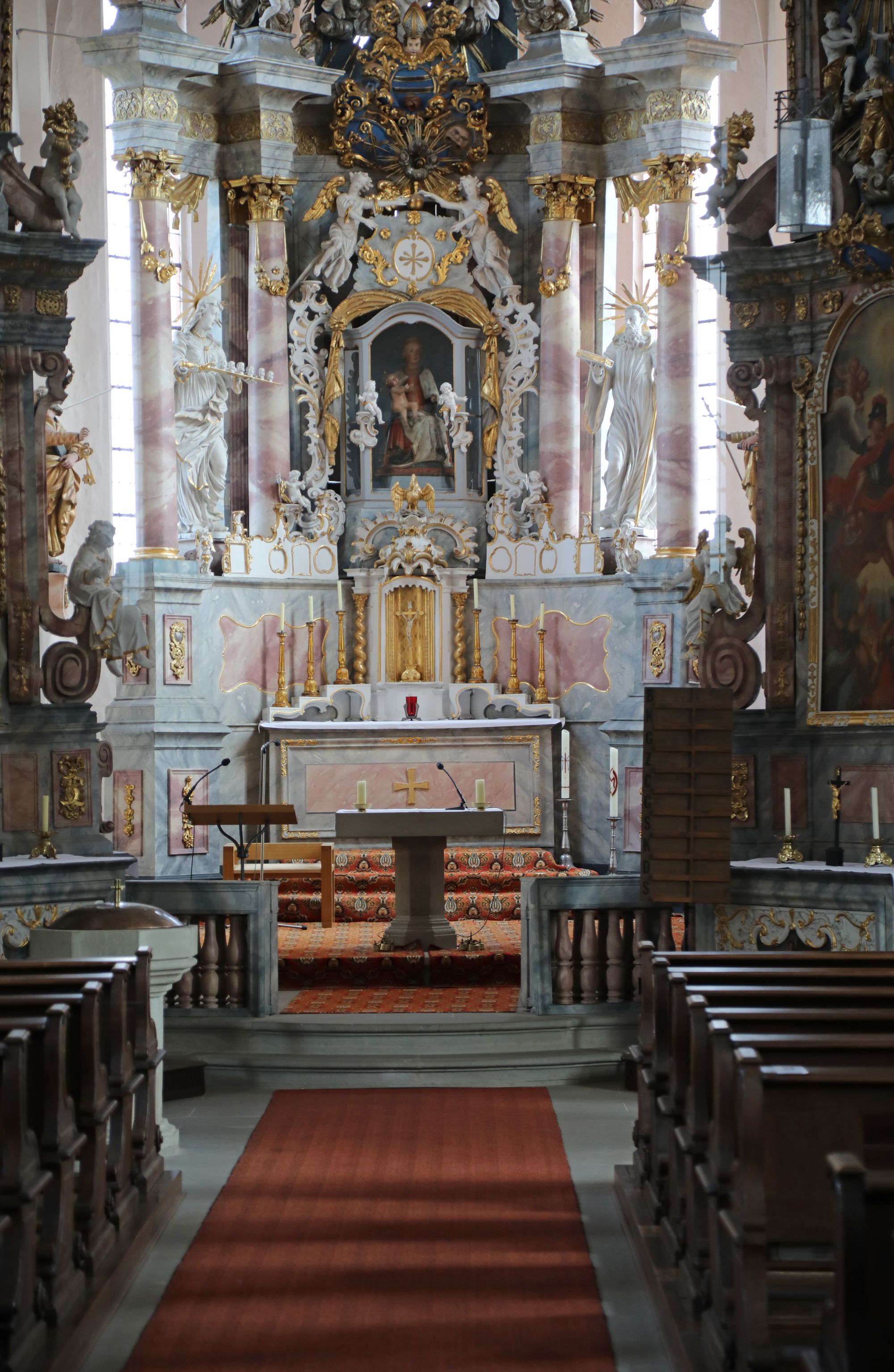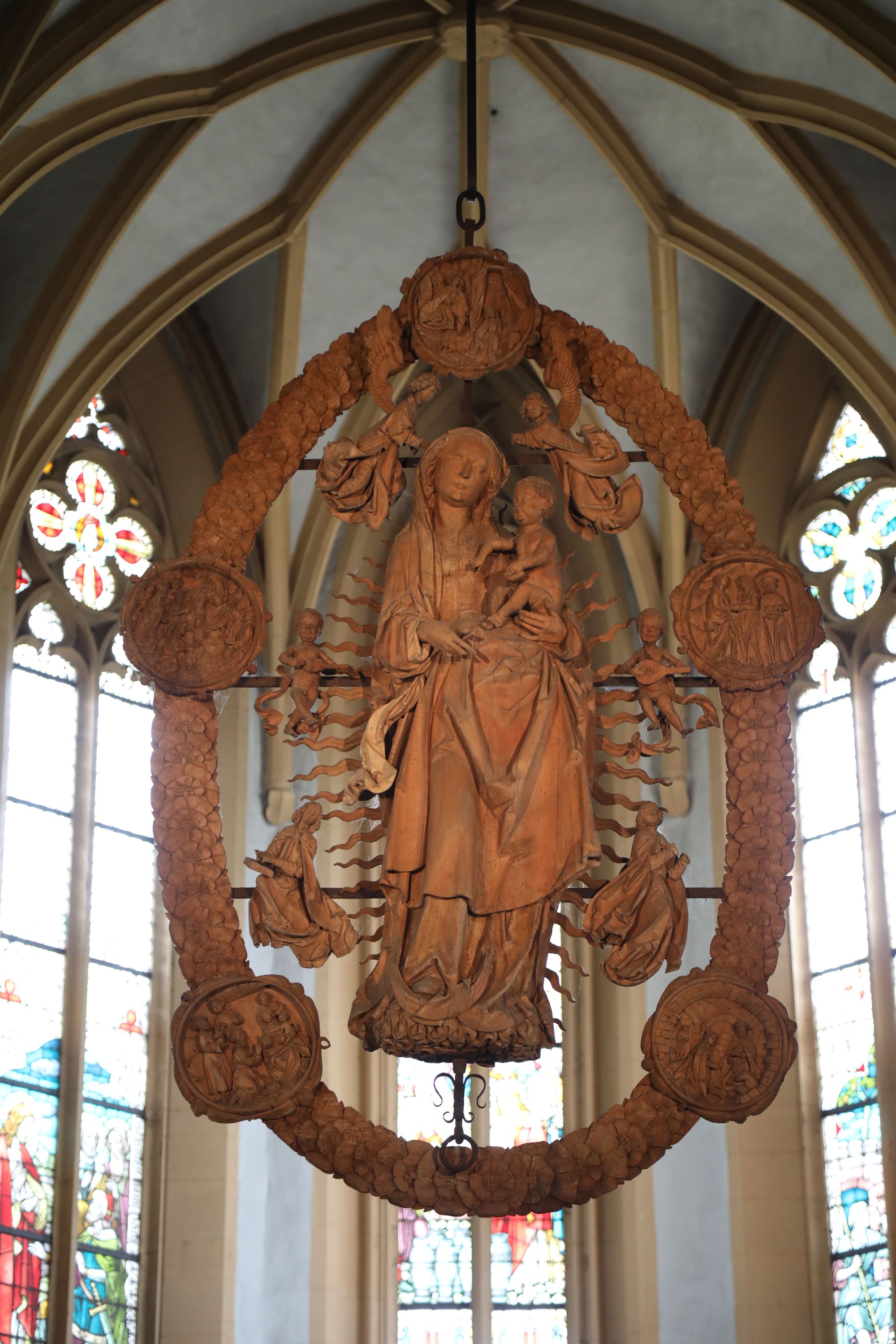 „Der wertvollste Schatz der Kirche ‚Maria im Weingarten‘ ist die weit über die Grenzen Deutschlands bekannte Rosenkranzmadonna.“ 1521 erhielt Tilman Riemenschneider dafür den Auftrag. 1962 wurde sie mit anderen Figuren aus der Kirche gestohlen. Erst nach Zahlung eines hohen Lösegelds kam sie wieder an ihren Platz zurück. Die Täter sind bis heute nicht bekannt. „Das Gnadenbild ist aber diese Pietà aus der Zeit um 1370, wohl das ehemalige Patronatsbild der Marienbruderschaft“, sagt Pfarrer Treutlein und verweist auf den linken Seitenaltar. „Mich hat es sehr beeindruckt, dass einmal für die Reihe ‚Stationen‘ des Bayerischen Fernsehens eine evangelische Pfarrerin eine Kerze vor dem Gnadenbild angezündet hat. Sie erklärte dabei: ‚Ich habe eine Beziehung zu Maria entwickelt, weil sie für mich Vorbild ist, was es heißt, eine glaubensstarke Frau zu sein.‘“