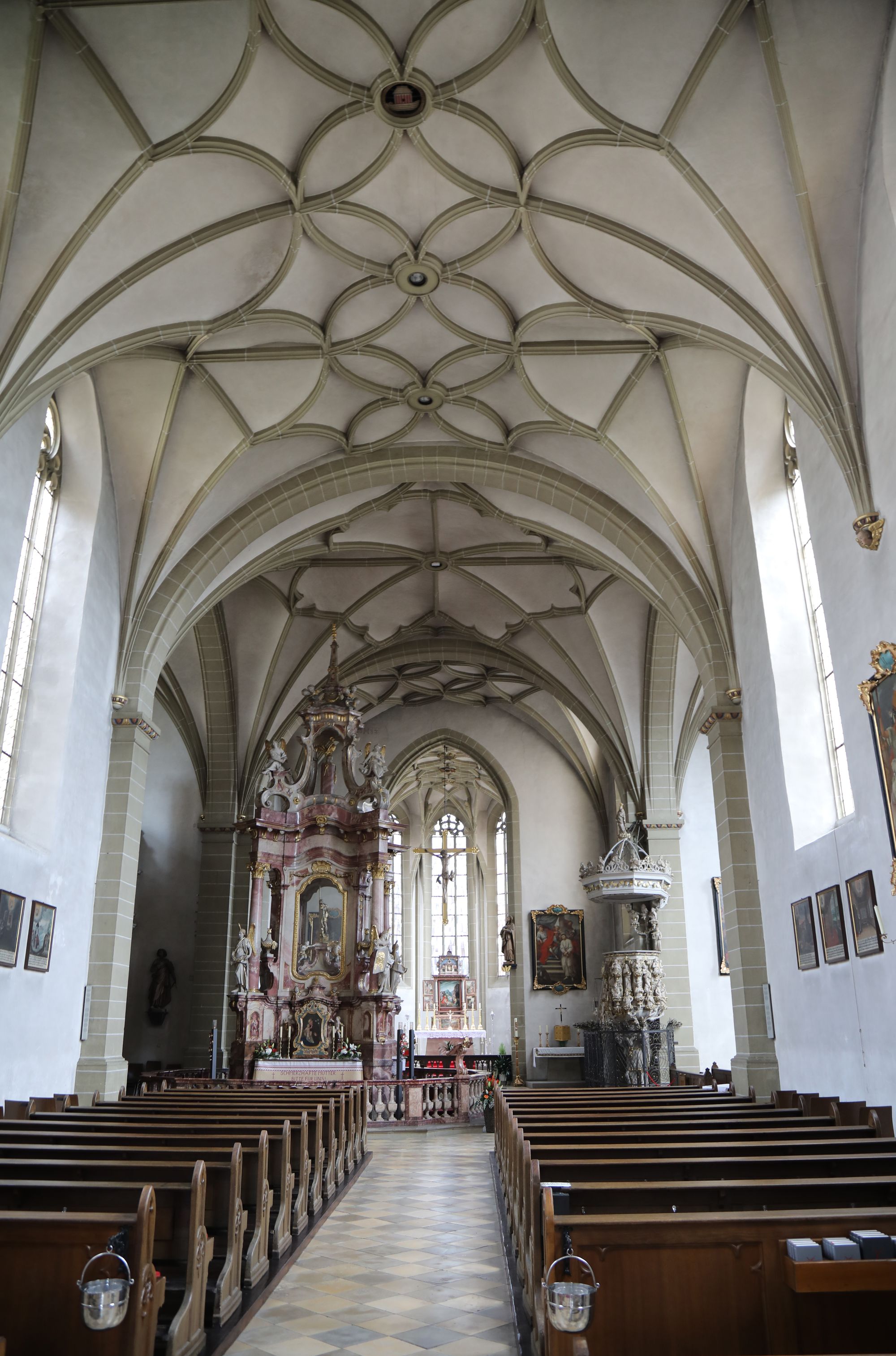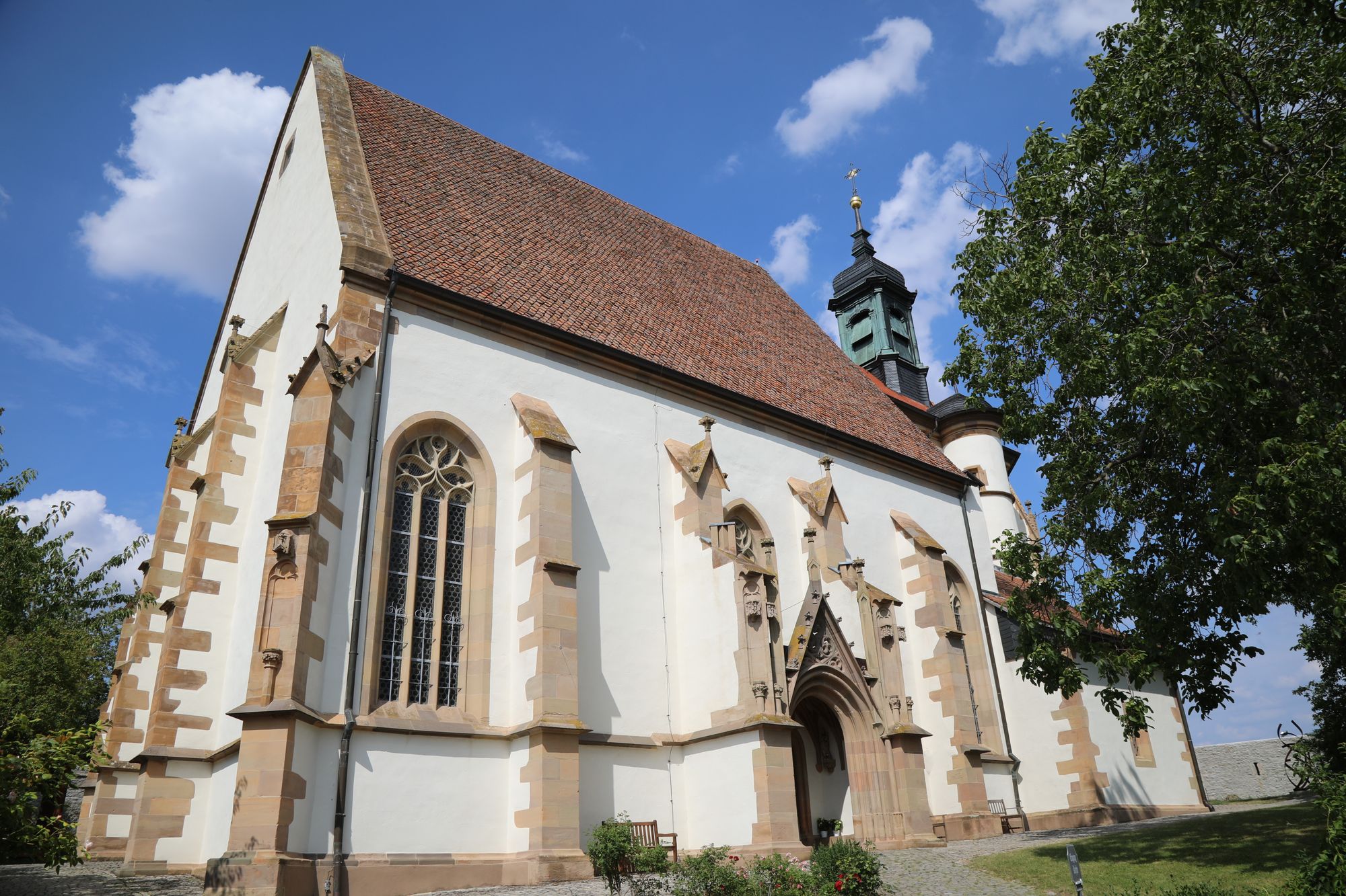 Schon im 13./14. Jahrhundert befand sich dort ein Gotteshaus, das Pfarrkirche für Volkach und die umliegenden Ortschaften war. „Ab Mitte des 15. Jahrhunderts hat dann eine marianische Bruderschaft mit dem Bau einer neuen Kirche begonnen, die zu Beginn des 16. Jahrhunderts vollendet war.“ Dieser Vereinigung gehörten der Würzburger Bischof, Adelige und Volkacher Bürger an, erklärt Treutlein. Vom Platz vor der Kirche aus bietet sich eine herrliche Rundsicht auf die Mainschleife und den Steigerwald.