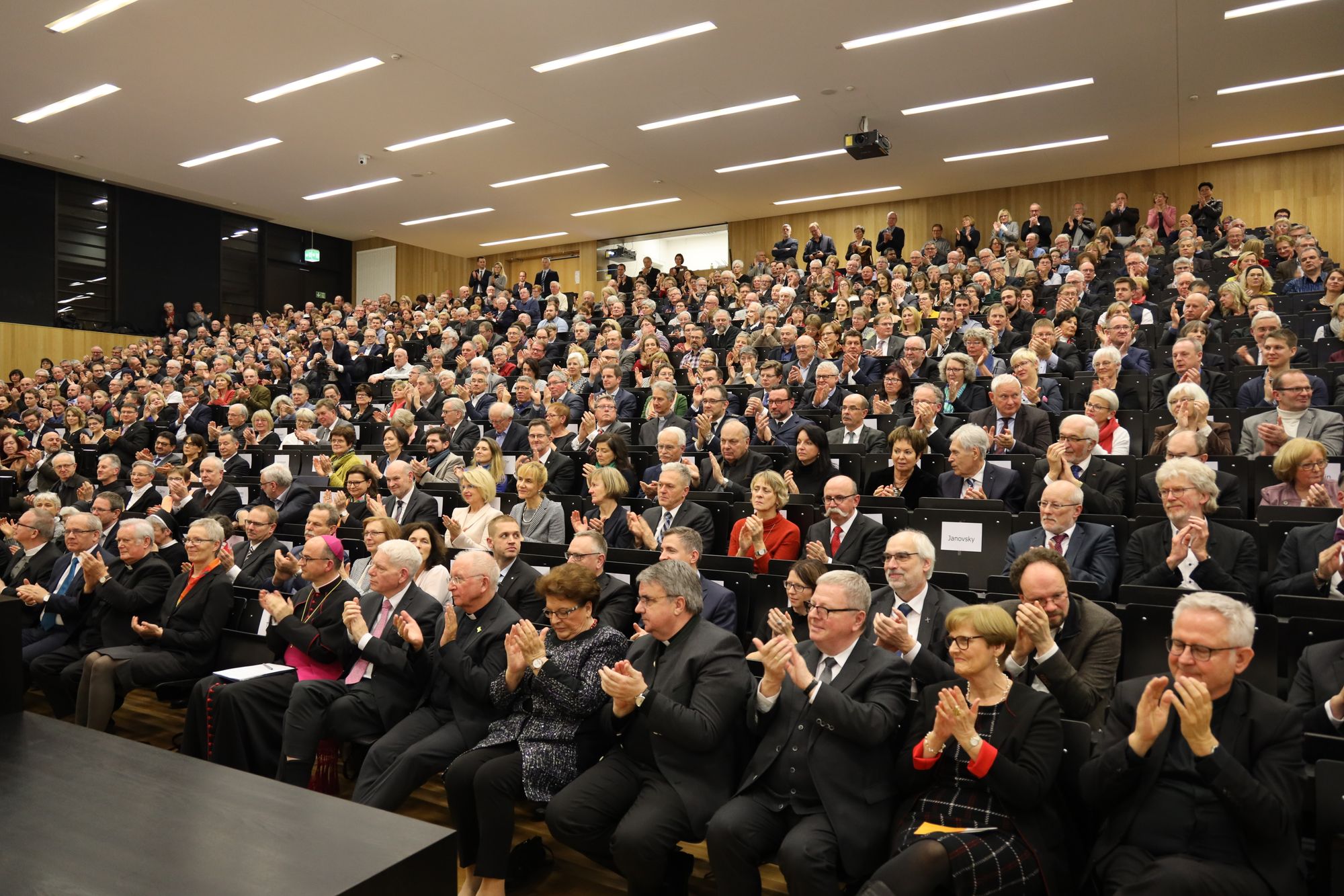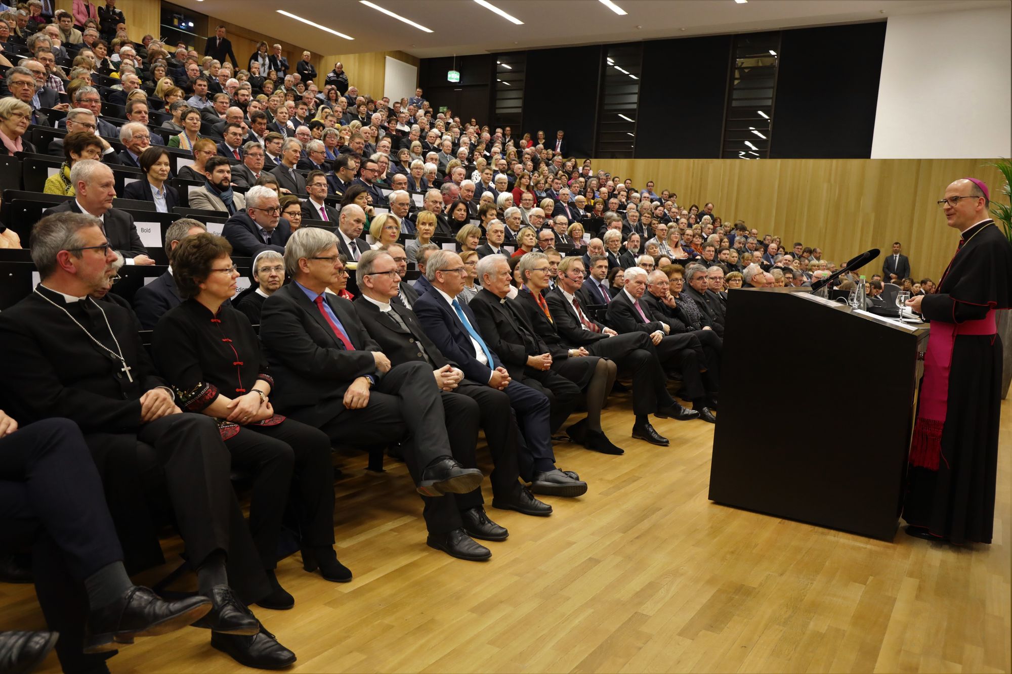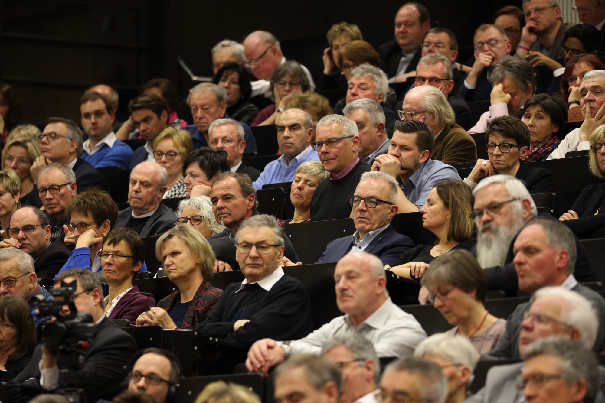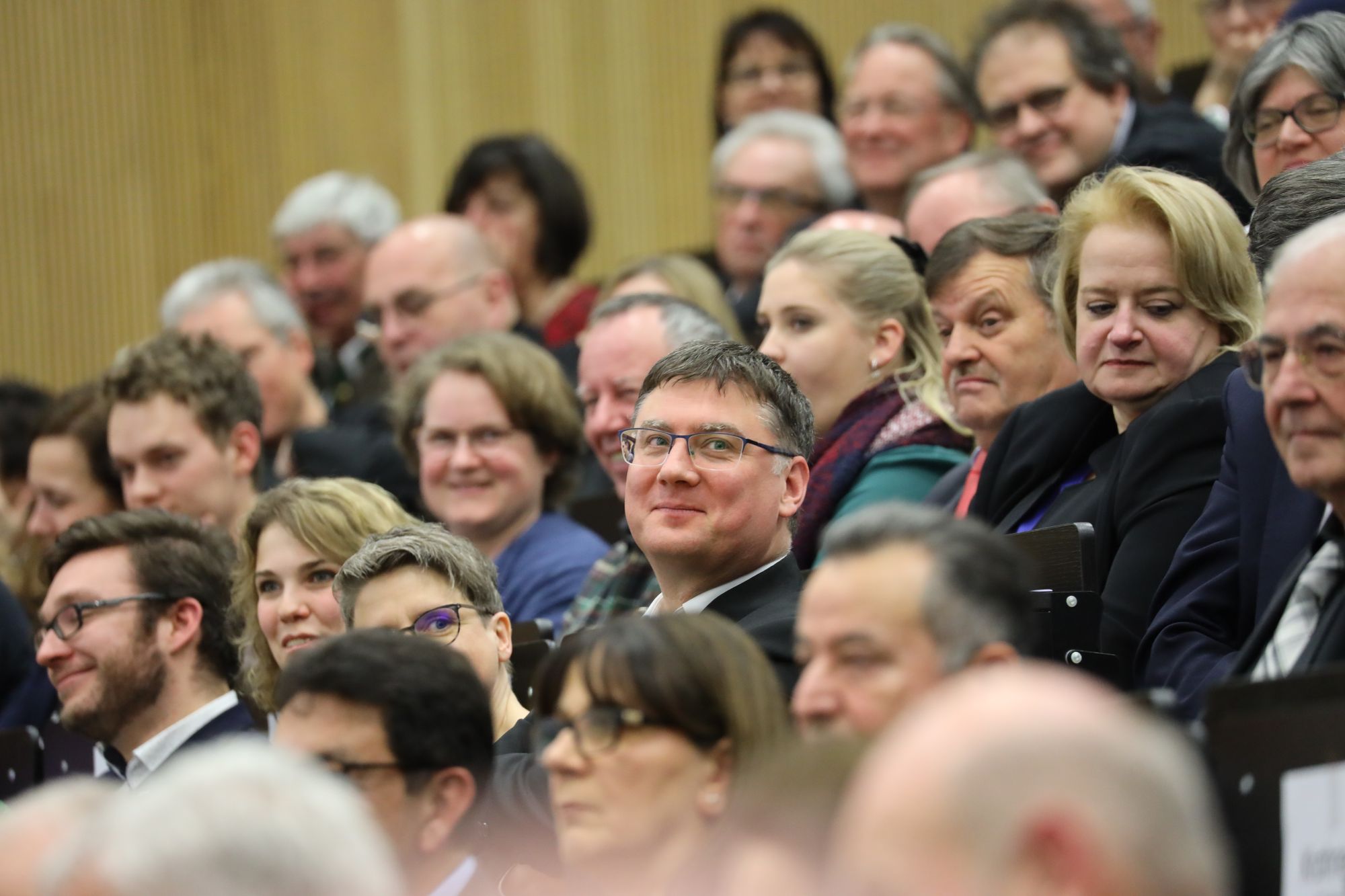 Würzburg (POW) „Wir haben nie in einem goldenen Zeitalter der Demokratie gelebt. Sie ist angewiesen auf die, die sie verteidigen.“ Das hat der Philosoph Professor Dr. Dieter Thomä vor rund 1100 Gästen beim Diözesanempfang am Montagabend, 13. Januar, in der Universität am Würzburger Hubland gesagt. In seinem kurzweiligen Vortrag mit dem Titel „Wie Menschen über sich hinauswachsen. Ein demokratisches Plädoyer für Heldentum“ legte er dar, warum die Demokratie Helden braucht und unter welchen Umständen Menschen zum Helden werden können. Jeder müsse selbst überlegen, was er dazu beitragen könne, damit Demokratie gelinge, sagte Bischof Dr. Franz Jung. Zugleich dankte er den Anwesenden für ihren Einsatz in Kirche und Gesellschaft. „Glaube muss sich in der Welt von heute bewähren. Durch Ihr Engagement leisten Sie einen wichtigen und unersetzlichen Beitrag, der Anerkennung und Wertschätzung verdient.“