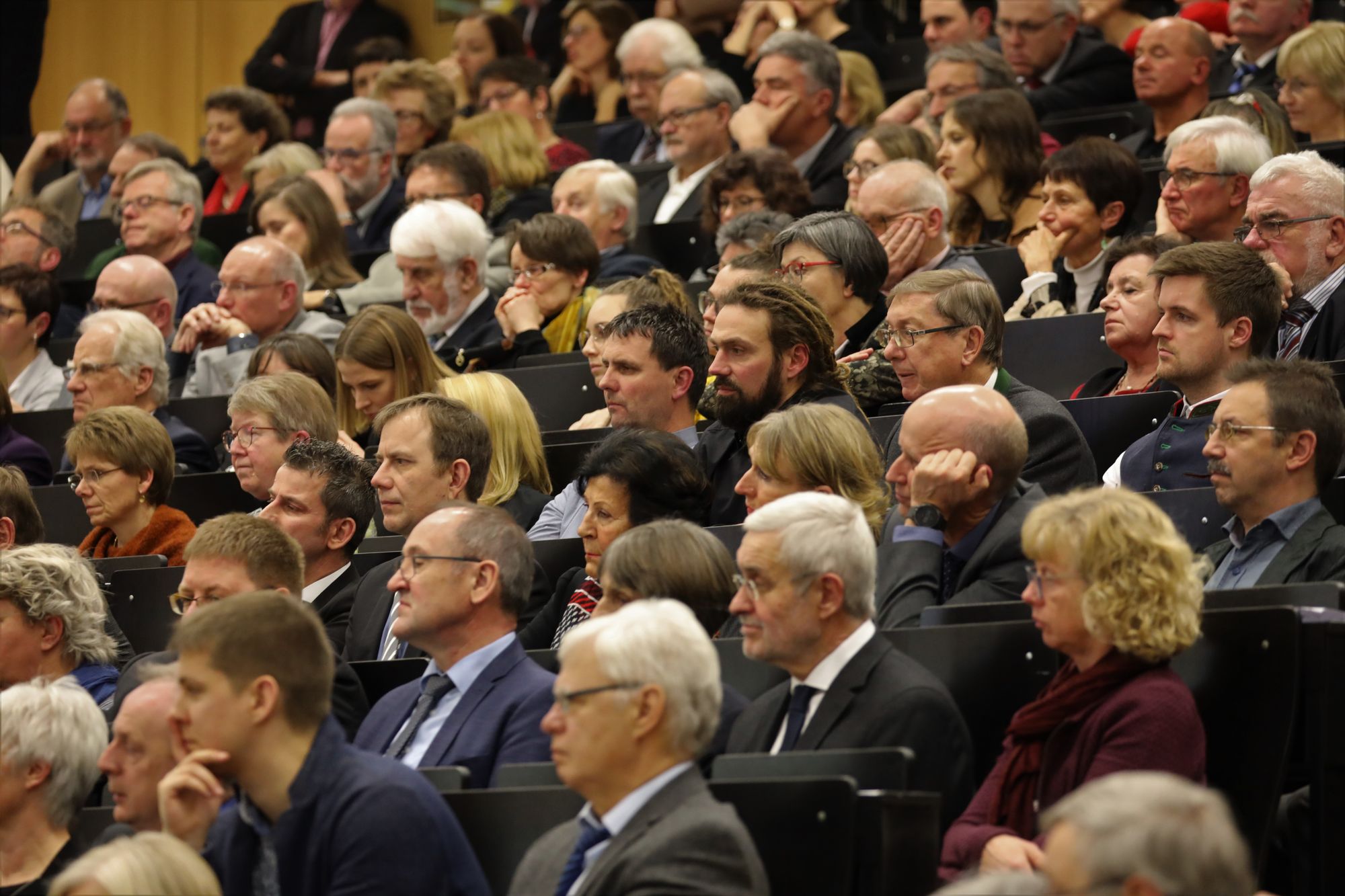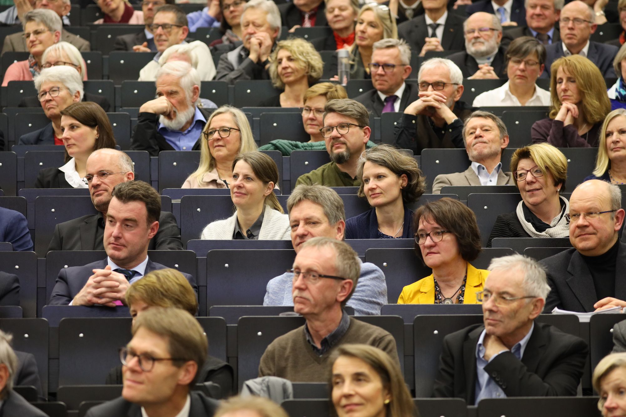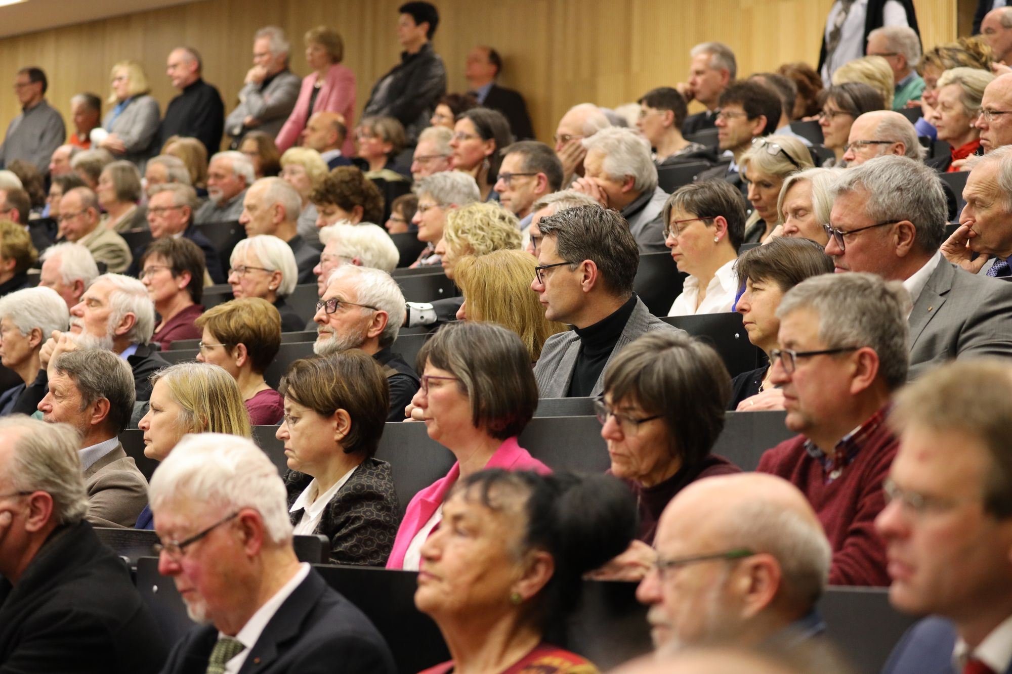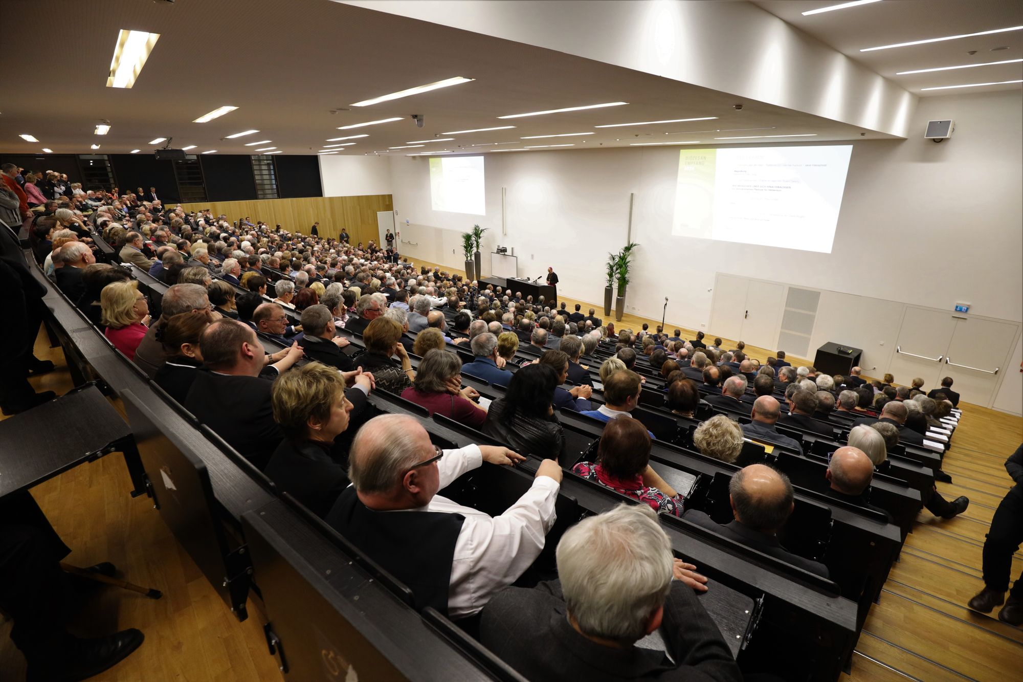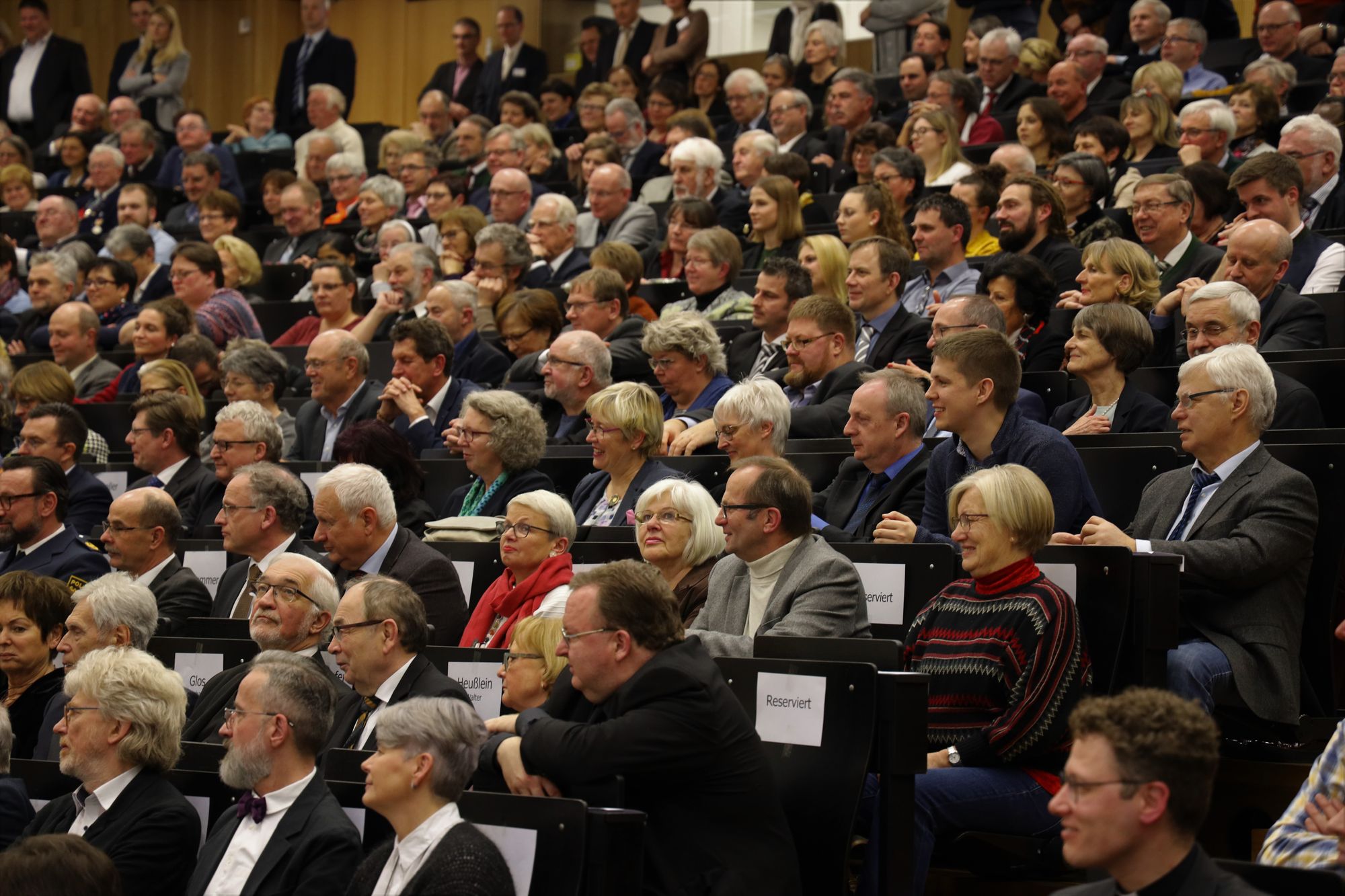 Würzburg (POW) „Wir haben nie in einem goldenen Zeitalter der Demokratie gelebt. Sie ist angewiesen auf die, die sie verteidigen.“ Das hat der Philosoph Professor Dr. Dieter Thomä vor rund 1100 Gästen beim Diözesanempfang am Montagabend, 13. Januar, in der Universität am Würzburger Hubland gesagt. In seinem kurzweiligen Vortrag mit dem Titel „Wie Menschen über sich hinauswachsen. Ein demokratisches Plädoyer für Heldentum“ legte er dar, warum die Demokratie Helden braucht und unter welchen Umständen Menschen zum Helden werden können. Jeder müsse selbst überlegen, was er dazu beitragen könne, damit Demokratie gelinge, sagte Bischof Dr. Franz Jung. Zugleich dankte er den Anwesenden für ihren Einsatz in Kirche und Gesellschaft. „Glaube muss sich in der Welt von heute bewähren. Durch Ihr Engagement leisten Sie einen wichtigen und unersetzlichen Beitrag, der Anerkennung und Wertschätzung verdient.“