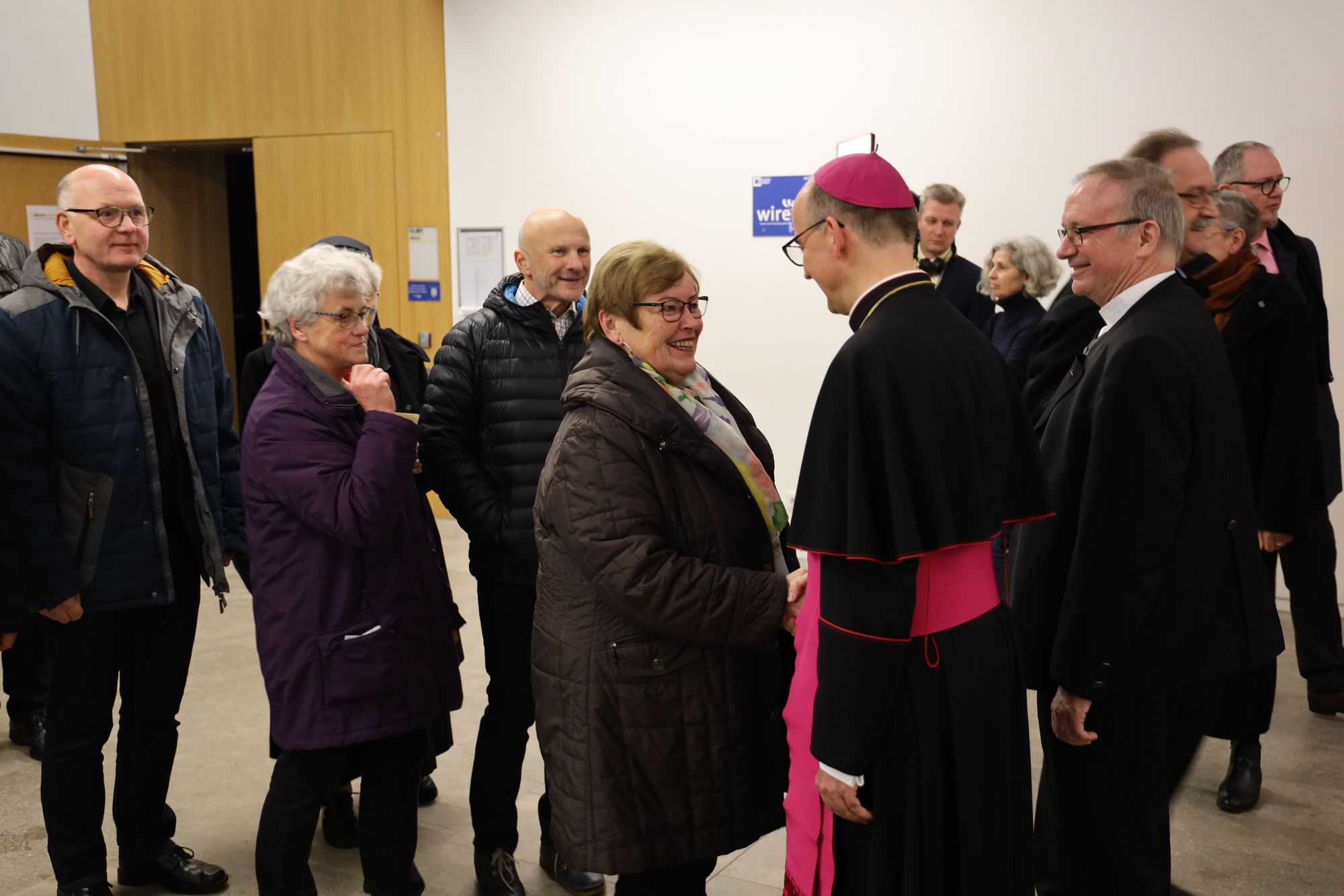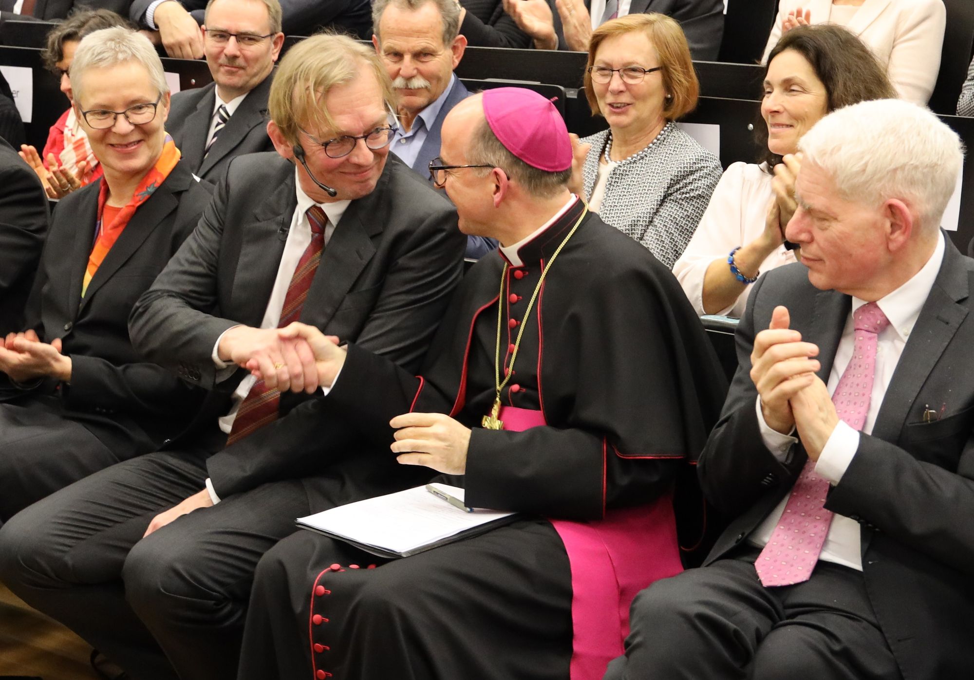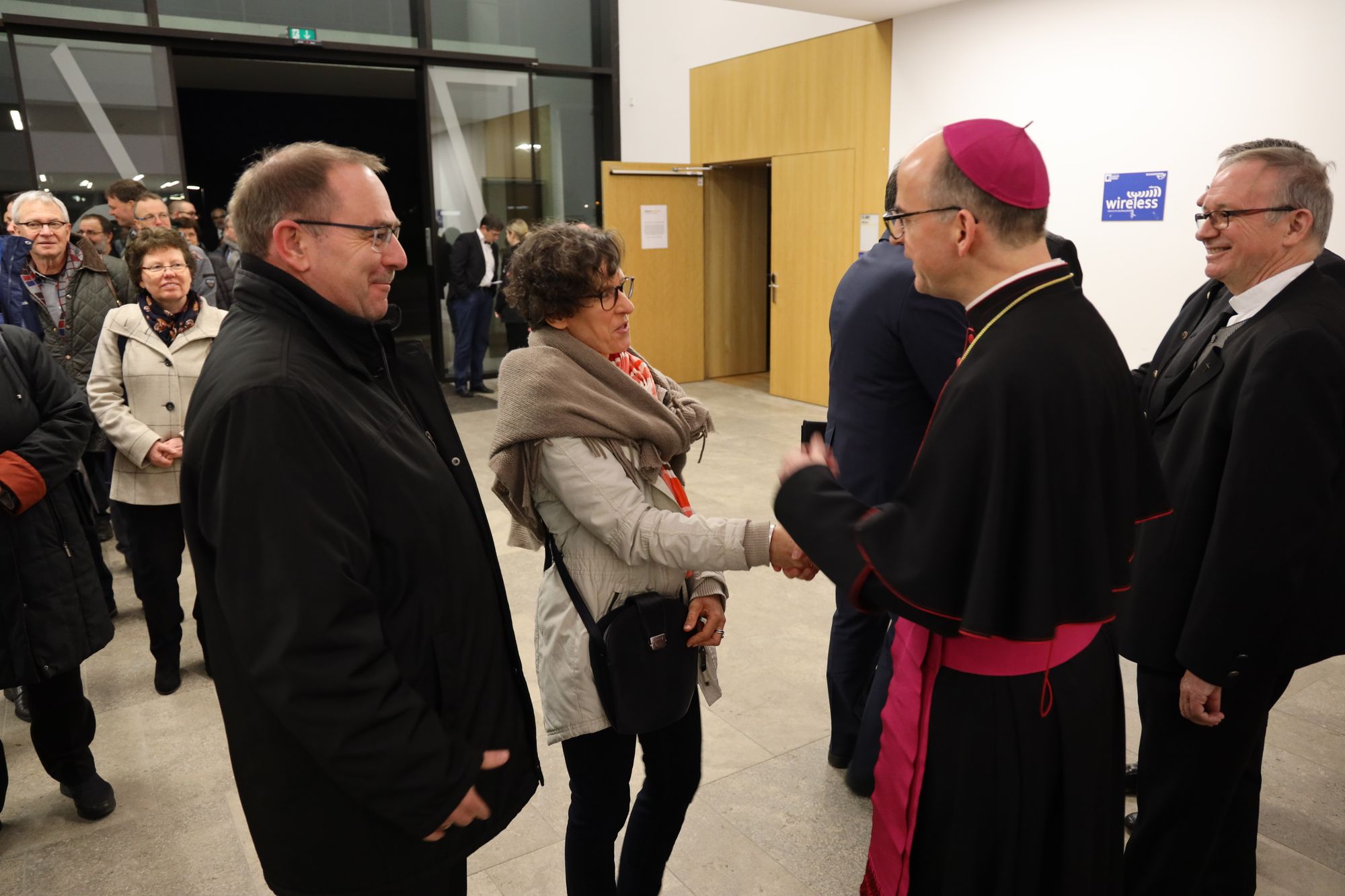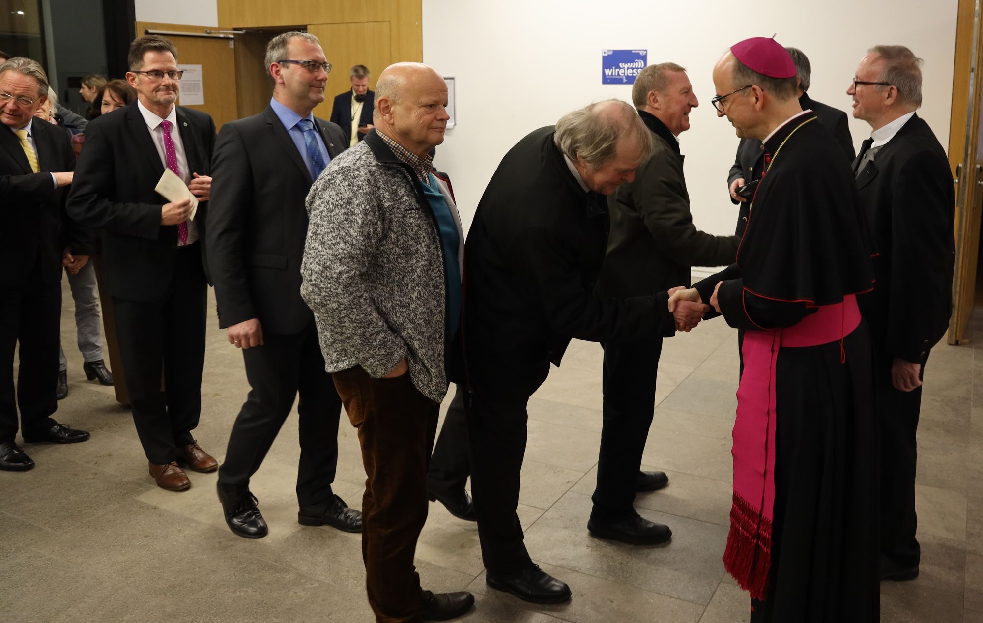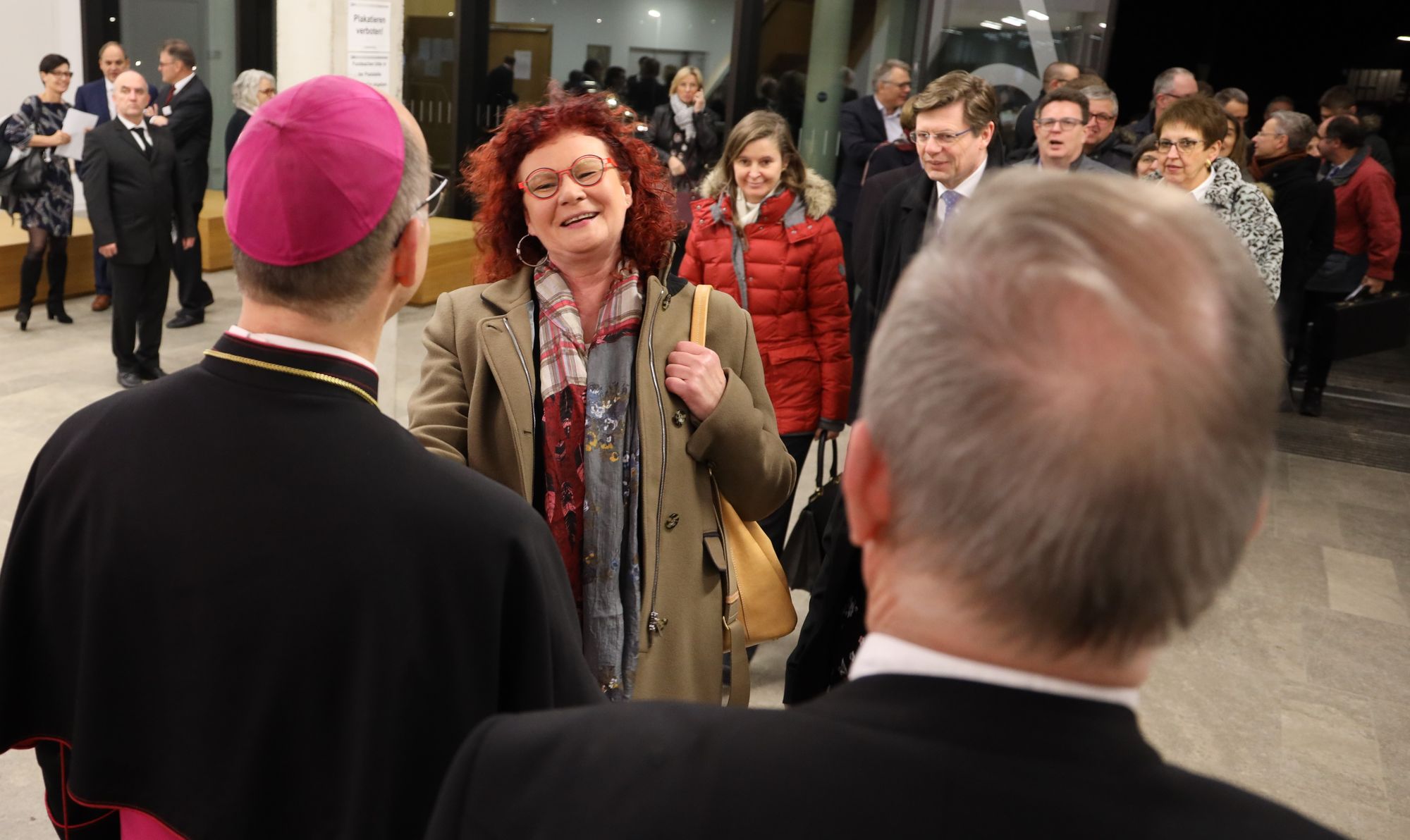 Die Heiligenverehrung in der katholischen Kirche zeige die vielen Nuancen des Heldenbegriffs. Diese spiegelten das Heiligkeitsideal der verschiedenen Epochen der Kirchengeschichte wider – von den Märtyrerinnen und Märtyrern der Alten Kirche über die Kirchenreformer der frühen Neuzeit bis hin zu den heutigen Mystikerinnen und Gottsuchern. „So viele Facetten, wie das Leben hat, so viele Helden der Heiligkeit gibt es.“ Auch das Jahresmotto des Bistums aus dem Epheserbrief passe hier sehr gut: „Die Länge und Breite, die Höhe und Tiefe der Liebe Christi erkennen, die alle Erkenntnis übersteigt.“ Dies umreiße „die vielfältigen Dimensionen gelebter Heiligkeit, die jeder Epoche neu nach allen Seiten hin auszuloten aufgetragen ist“, erläuterte Bischof Jung. Es zeige aber auch die Vielfalt des Engagements der an diesem Abend versammelten Gäste: „Die in der Länge seit vielen Jahren ausdauernd und frohgemut ihren Dienst tun in ihrer Kirchengemeinde und weit darüber hinaus, die repräsentativ die Breite des gesellschaftlichen, religiösen und kirchlichen Engagements abbilden, die auf der Höhe der Zeit ringen um die richtigen Antworten auf die bedrängenden Zukunftsfragen und die Tag für Tag neu in die Tiefe und die Abgründe menschlicher Not und Bedürftigkeit schauen.“
