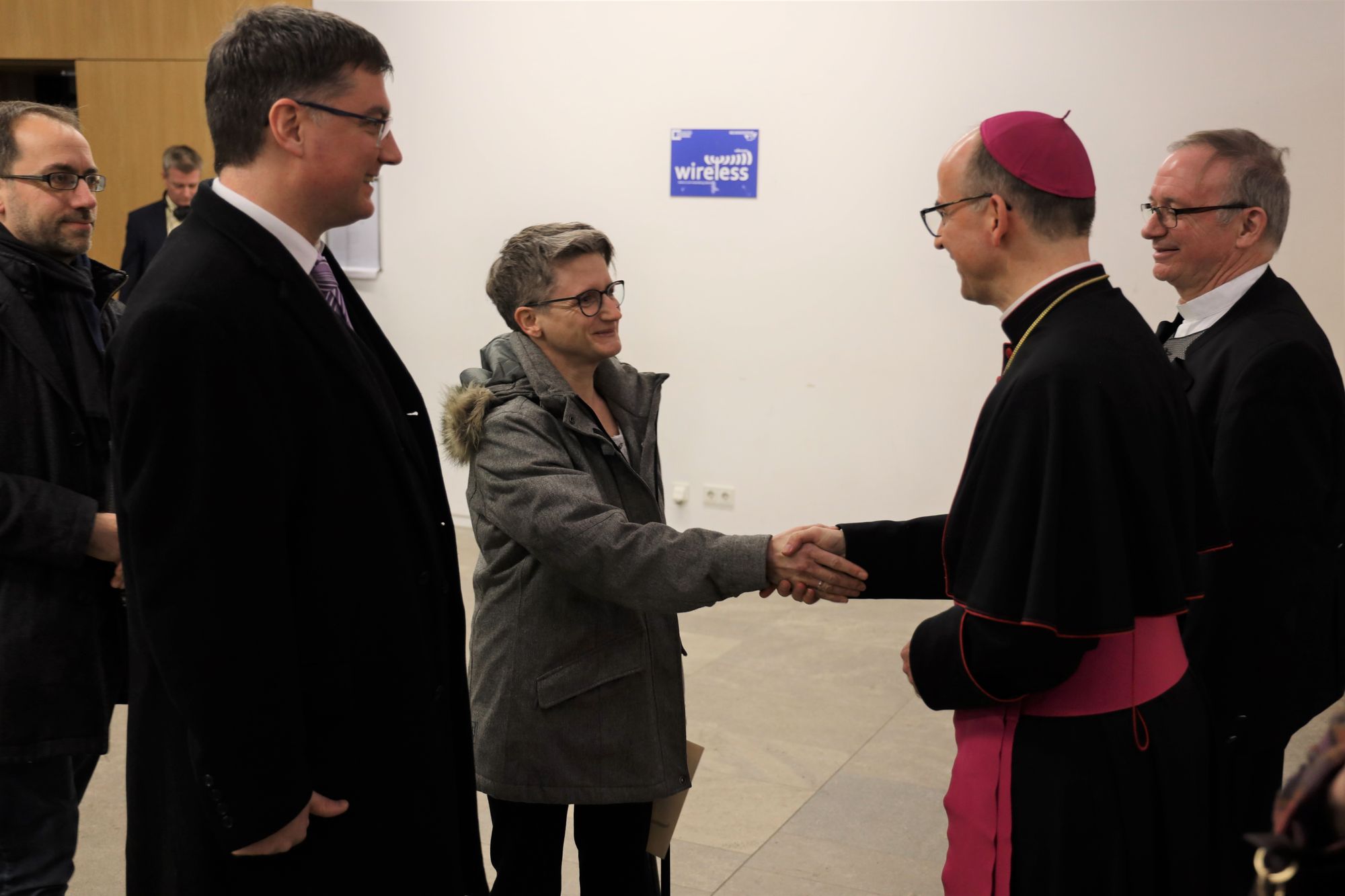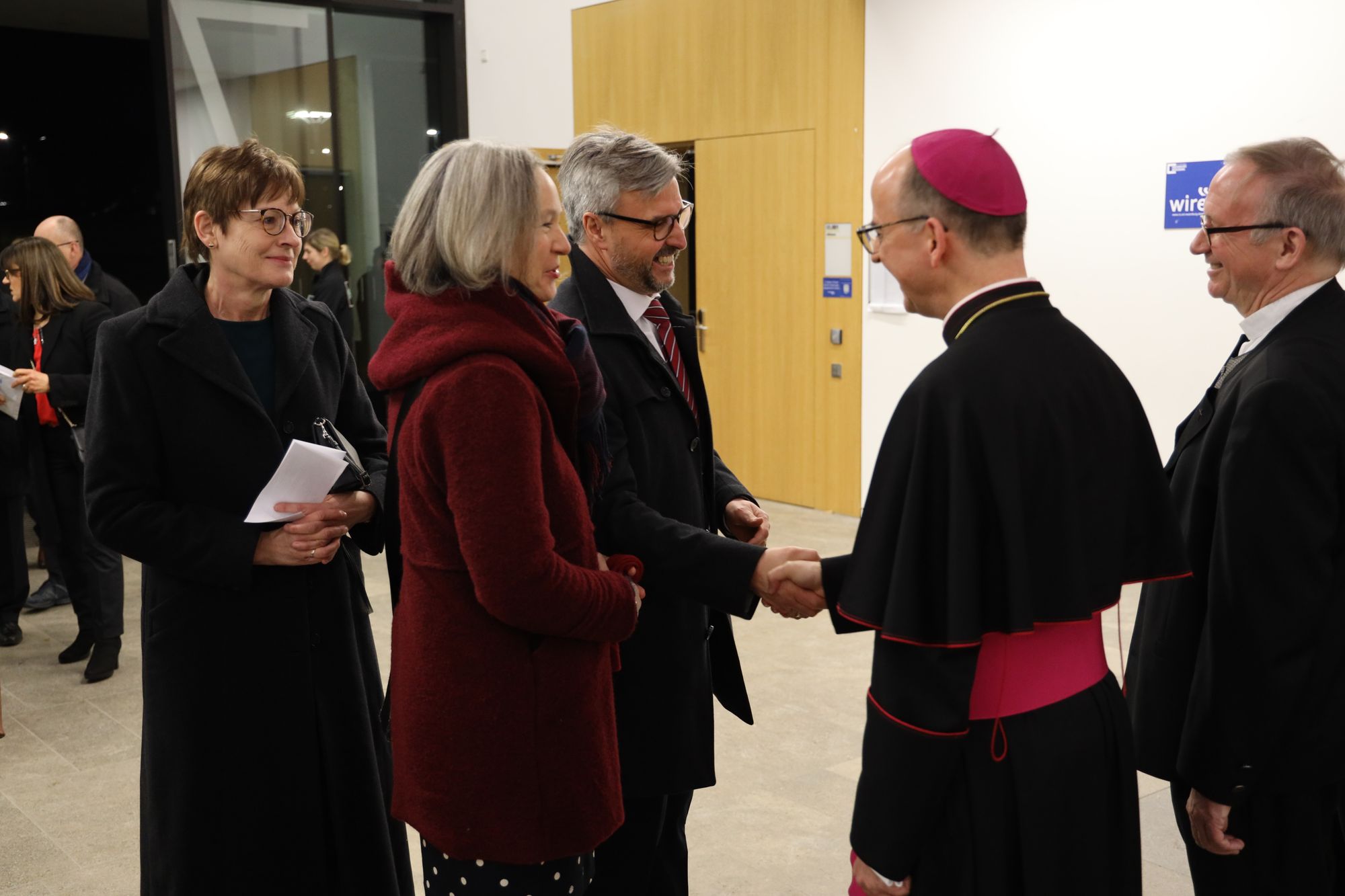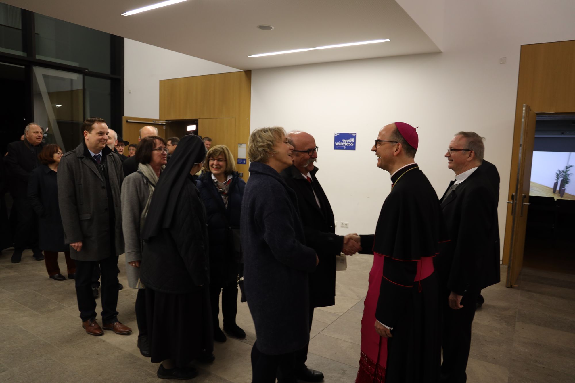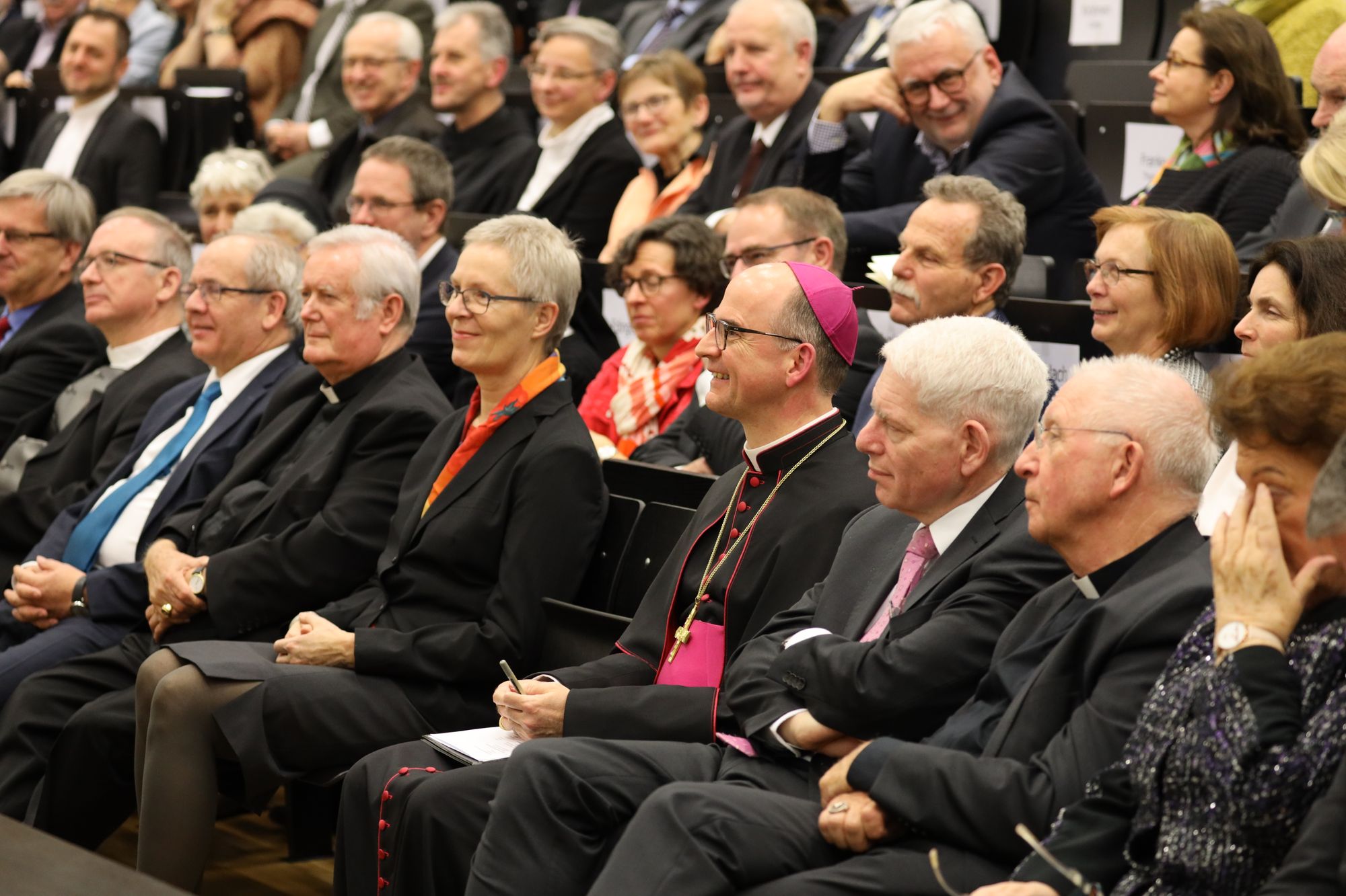 Zu Beginn des Abends hieß Bischof Jung die Gäste willkommen, darunter Vertreter der Kommunal-, der Landes-, der Bundes- und Europapolitik und die Mitarbeiter der Kirche auf Pfarrei-, Dekanats- und Diözesanebene. Besonders begrüßte er die ehemalige Landtagspräsidentin Barbara Stamm, Bundesminister a. D. Michael Glos, Regierungspräsident Dr. Eugen Ehmann und Würzburgs Oberbürgermeister Christian Schuchardt sowie Bischof em. Dr. Friedhelm Hofmann, seinen Vorgänger im Amt. Zu den Gästen zählten auch Bundes- und Landtagsabgeordnete, Landräte, Bezirks- und Kreisräte, Bürgermeister, Dekane, Pfarrer, pastorale Mitarbeiterinnen und Mitarbeiter, Ordensleute, Mitglieder des Diözesanrats und der Dekanatsräte, der Pfarrgemeinderäte und Kirchenverwaltungen, Vertreter der Caritas sowie Professoren der Universität Würzburg mit Vizepräsidentin Professorin Dr. Barbara Sponholz. Vertreter der Justiz, der Polizei, der Behörden und Ämter, der Kammern sowie der evangelischen Kirche standen weiter auf der Grußliste. Bischof Jung begrüßte besonders Dr. Josef Schuster, Präsident des Zentralrats der Juden in Deutschland.