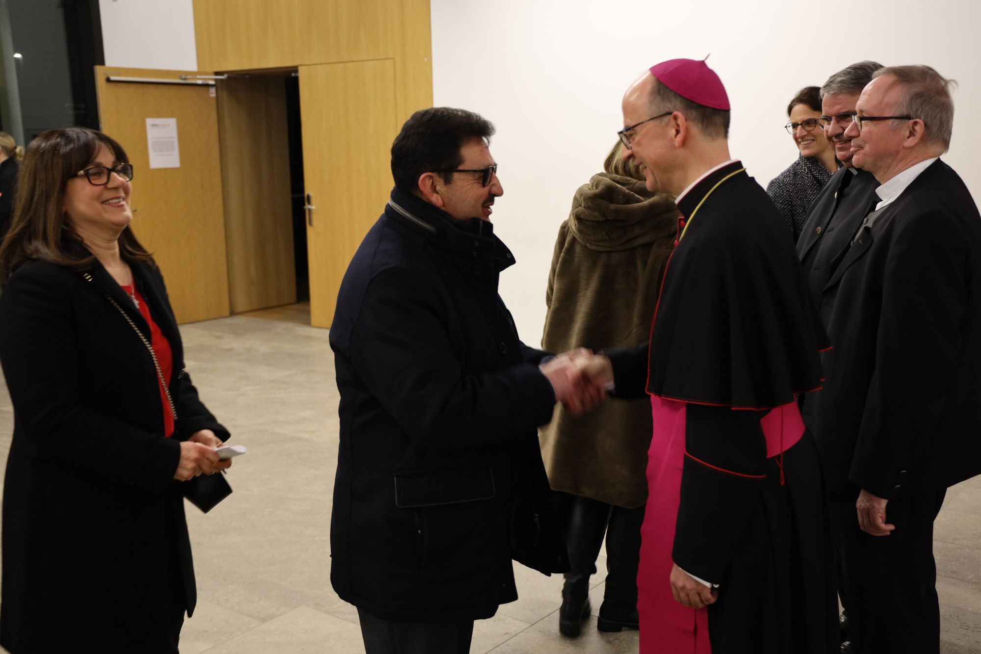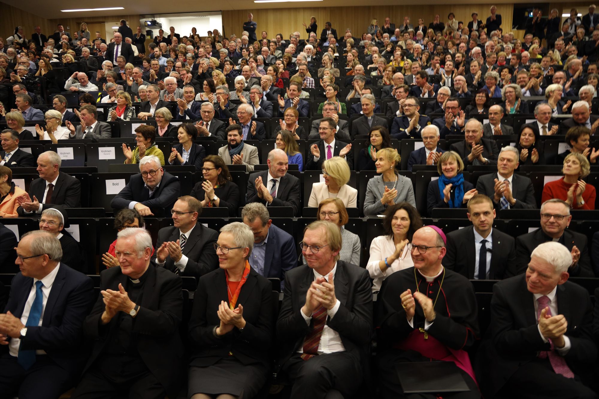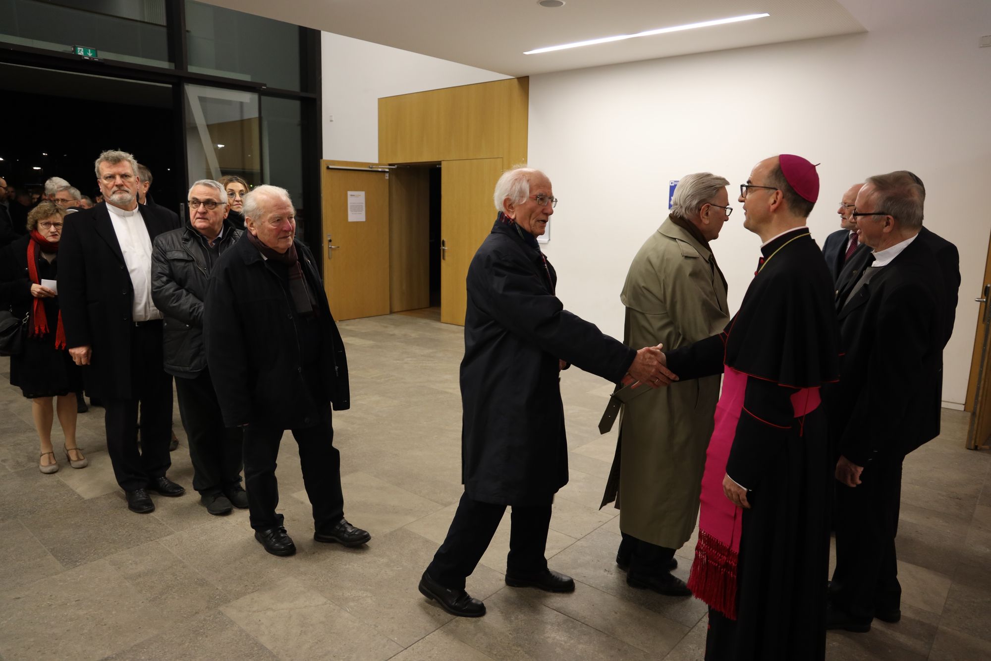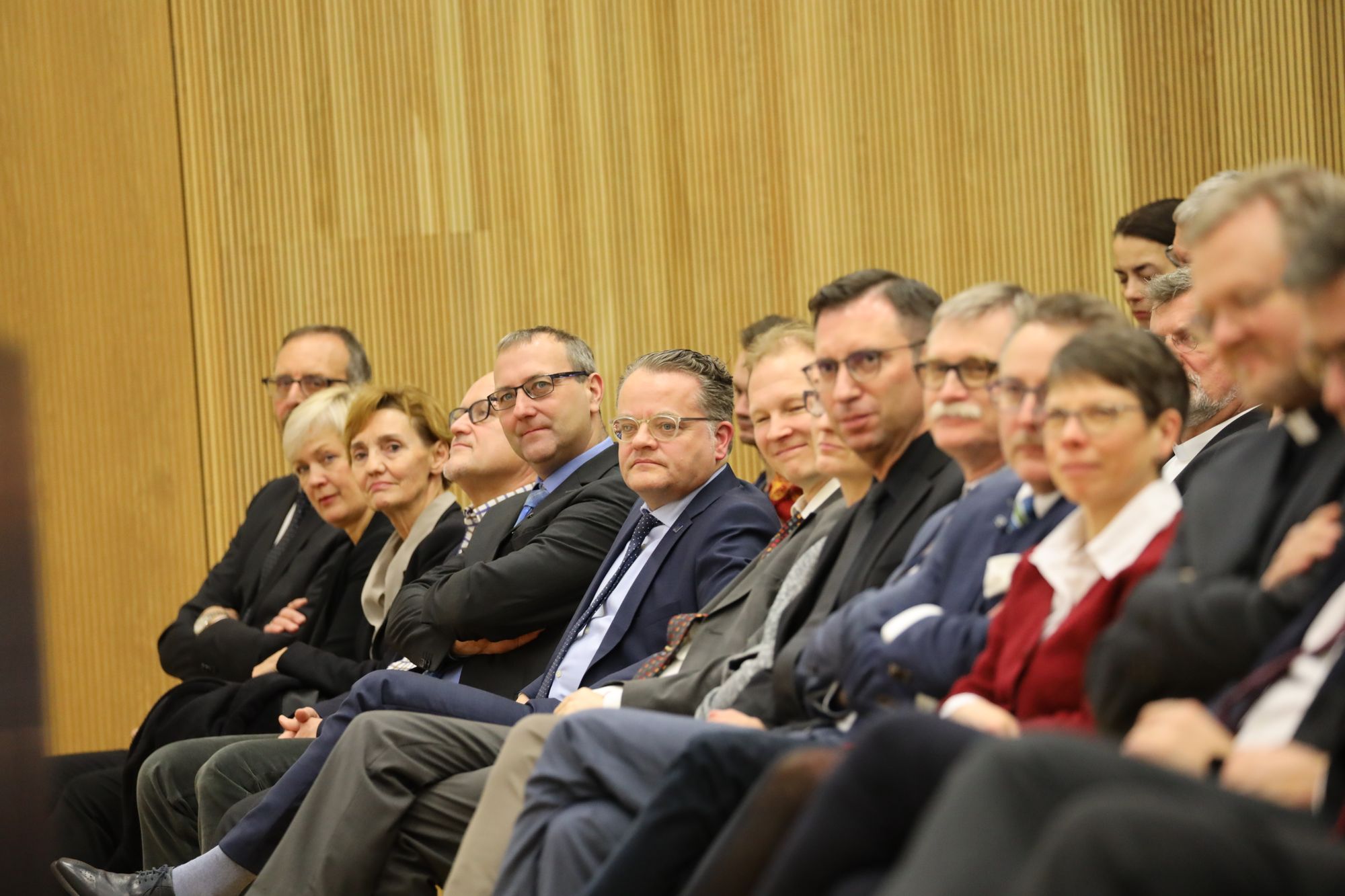 Zu Beginn des Abends hieß Bischof Jung die Gäste willkommen, darunter Vertreter der Kommunal-, der Landes-, der Bundes- und Europapolitik und die Mitarbeiter der Kirche auf Pfarrei-, Dekanats- und Diözesanebene. Besonders begrüßte er die ehemalige Landtagspräsidentin Barbara Stamm, Bundesminister a. D. Michael Glos, Regierungspräsident Dr. Eugen Ehmann und Würzburgs Oberbürgermeister Christian Schuchardt sowie Bischof em. Dr. Friedhelm Hofmann, seinen Vorgänger im Amt. Zu den Gästen zählten auch Bundes- und Landtagsabgeordnete, Landräte, Bezirks- und Kreisräte, Bürgermeister, Dekane, Pfarrer, pastorale Mitarbeiterinnen und Mitarbeiter, Ordensleute, Mitglieder des Diözesanrats und der Dekanatsräte, der Pfarrgemeinderäte und Kirchenverwaltungen, Vertreter der Caritas sowie Professoren der Universität Würzburg mit Vizepräsidentin Professorin Dr. Barbara Sponholz. Vertreter der Justiz, der Polizei, der Behörden und Ämter, der Kammern sowie der evangelischen Kirche standen weiter auf der Grußliste. Bischof Jung begrüßte besonders Dr. Josef Schuster, Präsident des Zentralrats der Juden in Deutschland.