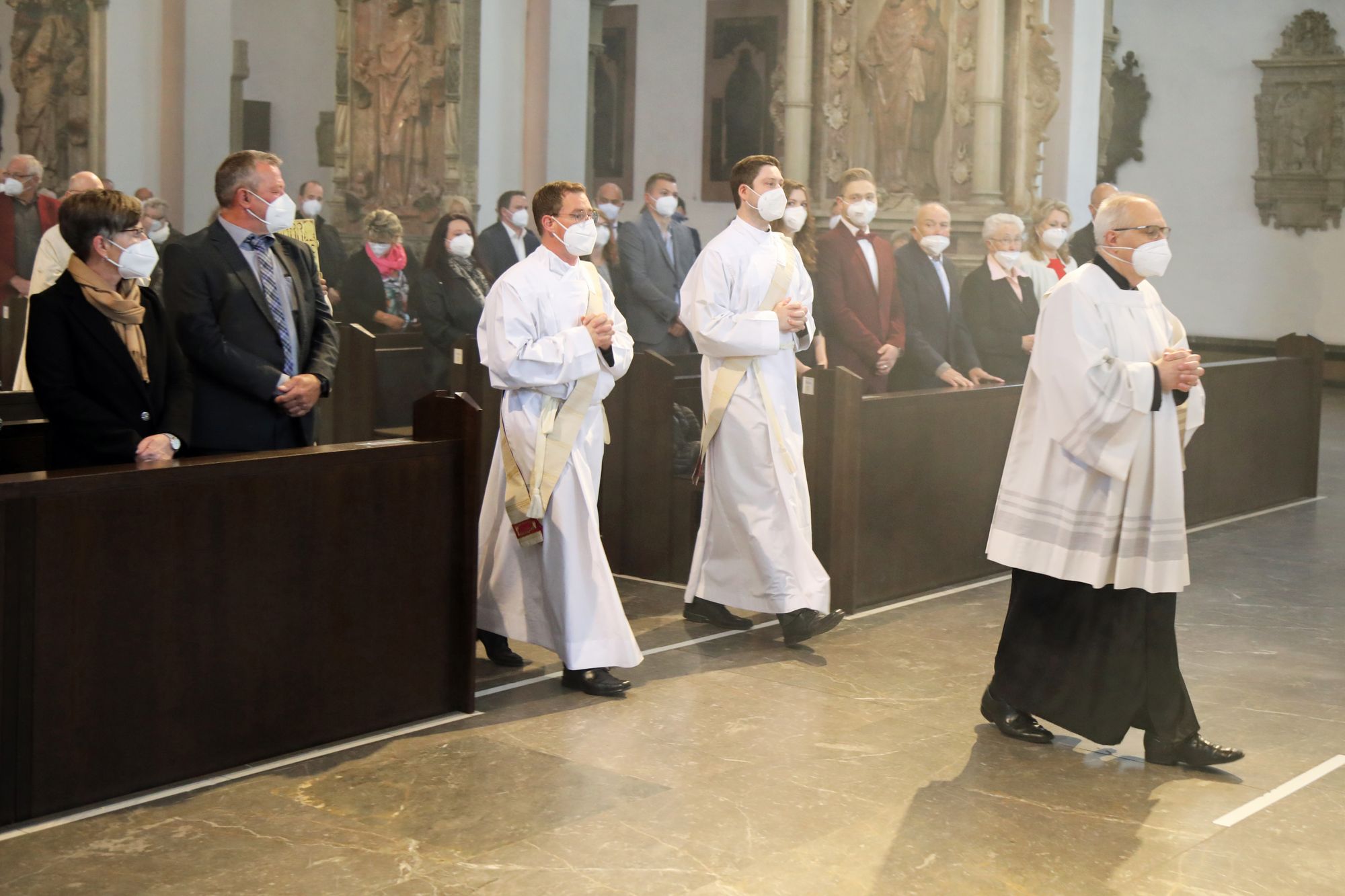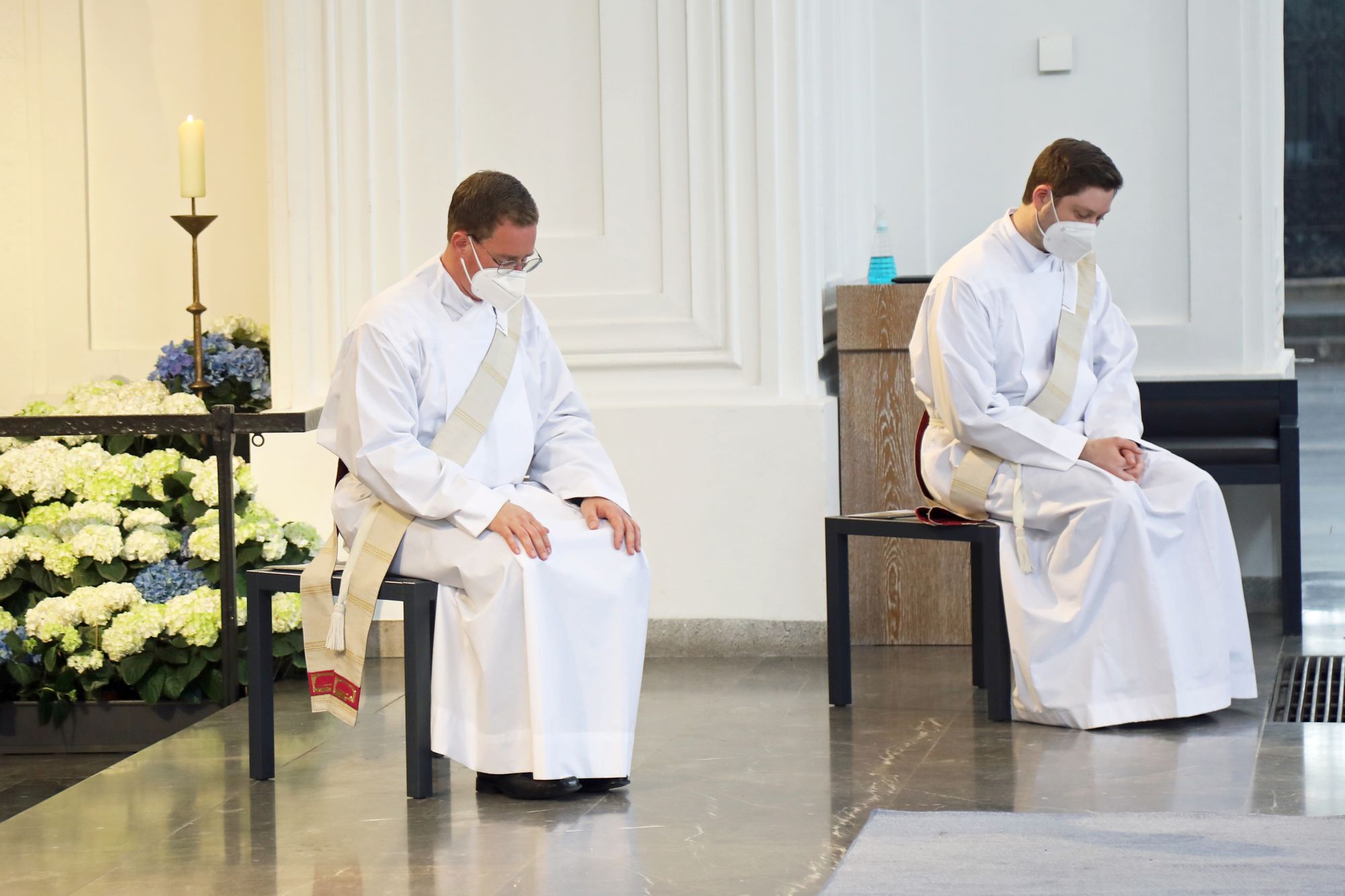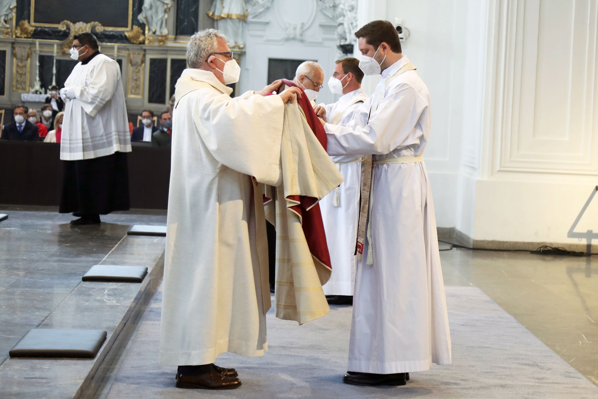 Verwandte, Freunde und Gläubige aus den Heimat- und Praktikumspfarreien der Weihekandidaten, Mitglieder des Domkapitels und Priester aus allen Teilen des Bistums nahmen an der Feier teil. Musikalisch umrahmten die Schola Cantorum, das Bläserensemble am Würzburger Dom und Domorganist Professor Stefan Schmidt unter der Leitung von Domkantor Alexander Rüth die Feier. Am Pfingstmontag, 24. Mai, feiert Neupriester Thomas um 10 Uhr Primiz in der Pfarrkirche Sankt Nikolaus von Flüe in Haibach. Die Primizfeier von Schimmer ist aufgrund der aktuellen Coronasituation verschoben.