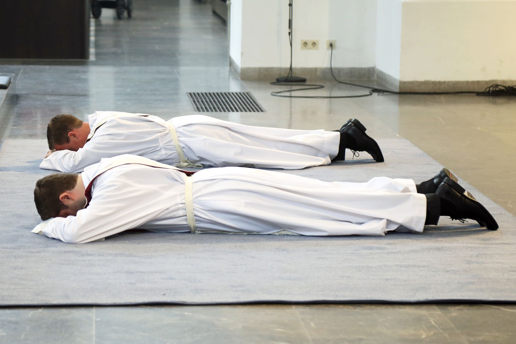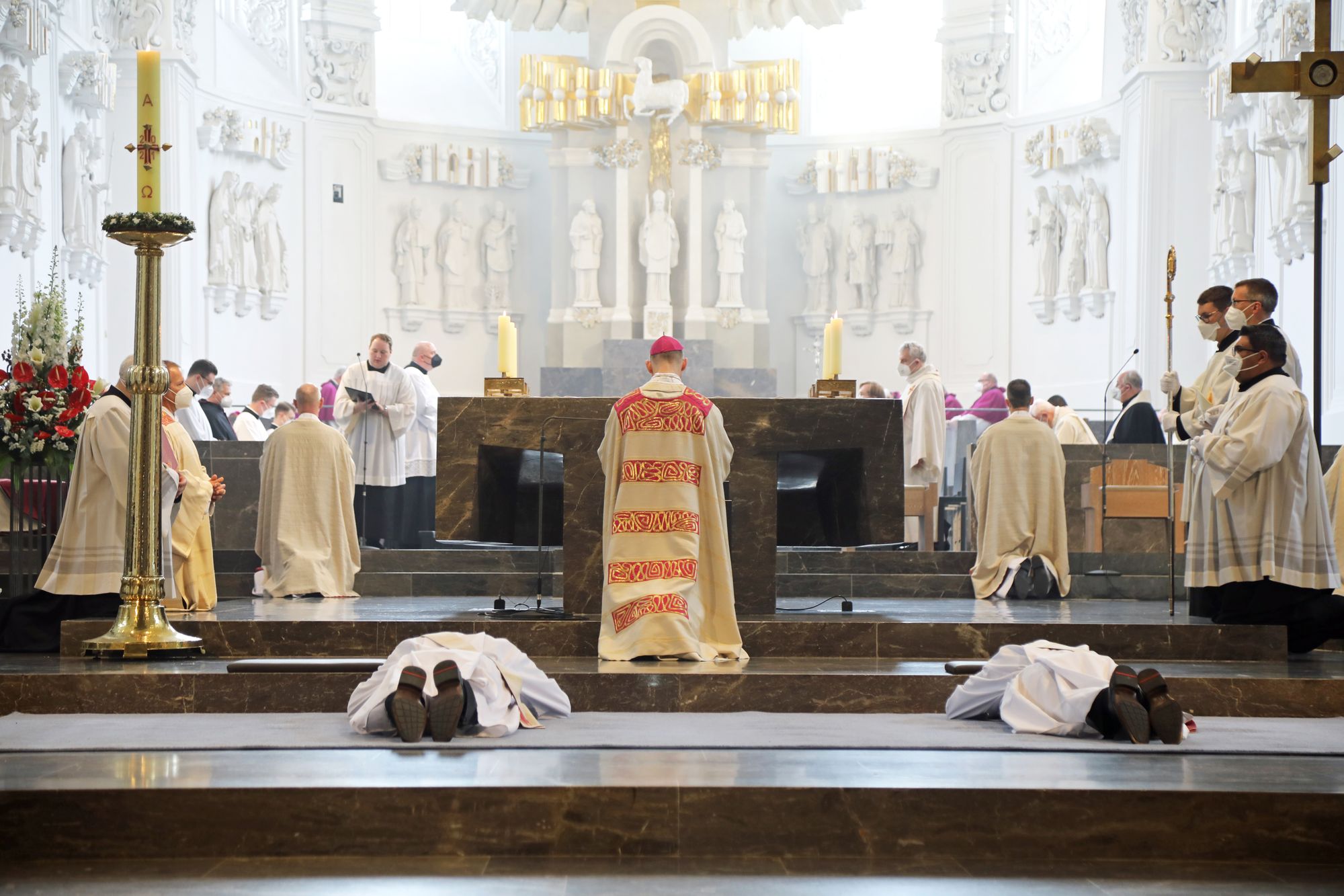 Bei der Anrufung der Heiligen lagen die Weihekandidaten ausgestreckt am Boden und zeigten ihre Bereitschaft, sich Gott ganz hinzugeben. Dann legten ihnen Bischof Jung, Weihbischof Ulrich Boom, Weihbischof em. Helmut Bauer sowie rund 30 Priester aus der ganzen Diözese Würzburg die Hände auf – seit urchristlicher Zeit Zeichen für die Beauftragung und Bevollmächtigung. Im Weihegebet bat Bischof Jung schließlich um den Geist Gottes für die Neupriester. Als „ausdeutende Zeichen“ der Weihehandlungen zogen Pfarrer Uwe Hartmann, Leiter der Pfarreiengemeinschaft „Maria im Sand, Dettelbach“, und Dekan Erich Sauer, Pfarrer der Einzelpfarrei Haibach, den Geweihten das priesterliche Gewand an, salbte ihnen Bischof Jung die Hände, überreichte Kelch und Hostienschale und umarmte sie zum Friedensgruß.
