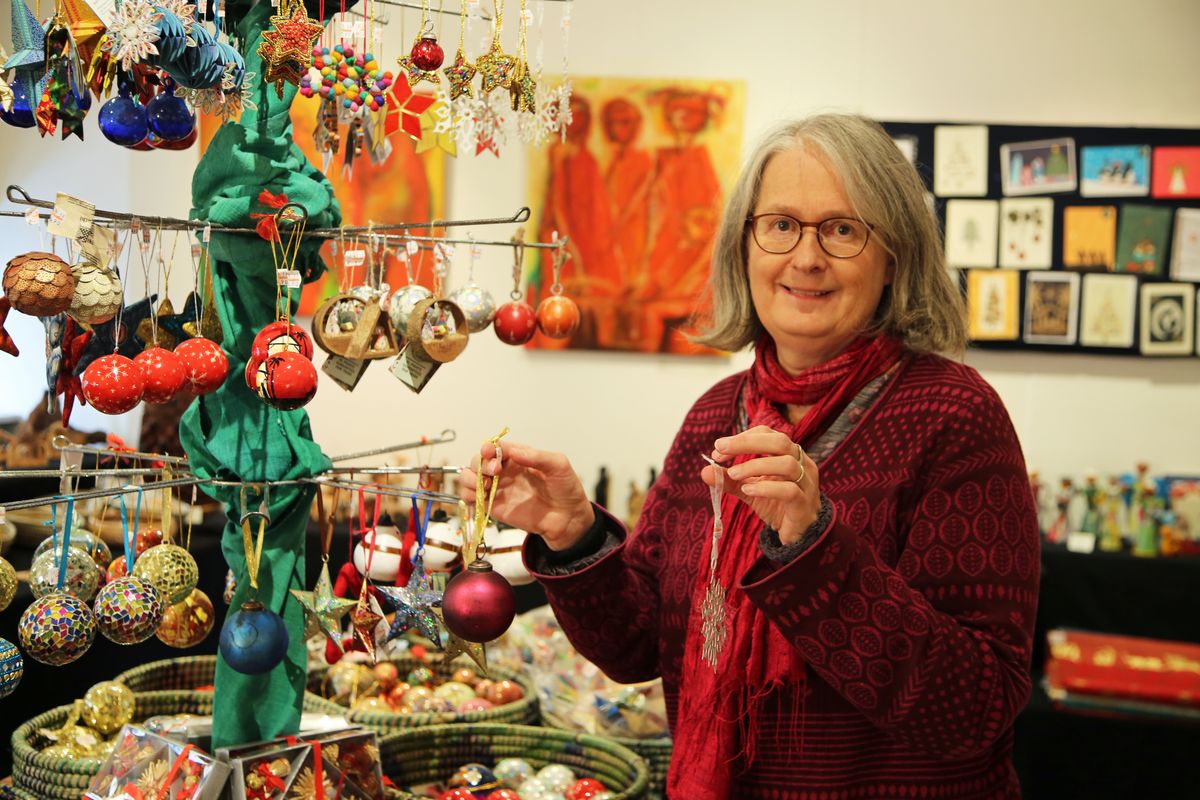 Würzburg (POW) Weihnachten naht. Im Weltladen Würzburg in der Plattnerstraße ist das offensichtlich. Direkt am Eingang steht ein Tisch, auf dem Weihnachtssüßigkeiten aufgebaut sind, zum Beispiel echte Schokonikoläuse – keine Weihnachtsmänner, sondern mit Mitra und Bischofsstab. Ein Hinweisschild aus roter Pappe zeigt den Besuchern den Weg zum Weihnachtsmarkt im ersten Stock auf der Galerie des Weltladens. Tritt man durch die Tür, sieht man Lichterketten, Kerzen und Krippen. Und ist man erstmal oben, befindet man sich im Weihnachtsparadies. Es glitzert und funkelt. Man steht mitten im alternativen Weihnachtsmarkt des Würzburger Weltladens, den es seit über 20 Jahren gibt. Dort kann man kreativen Weihnachtsschmuck kaufen, aber er ist auch eine Fundgrube für besondere Geschenke.